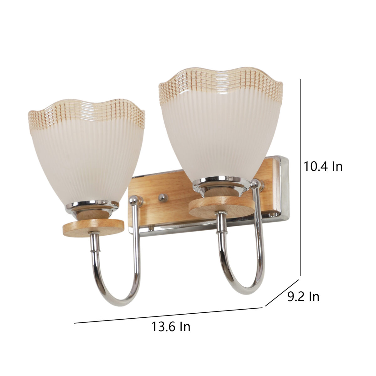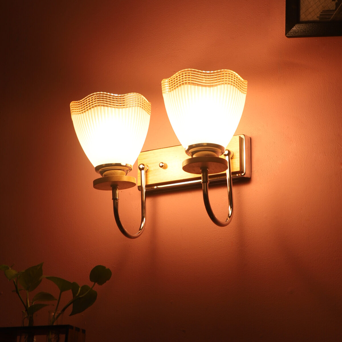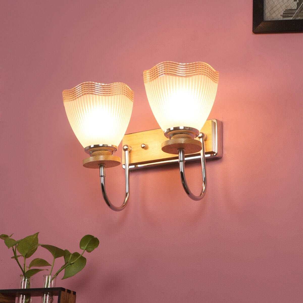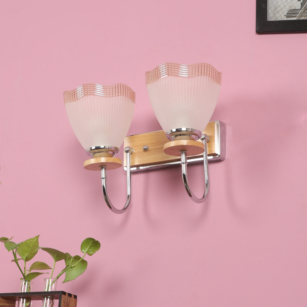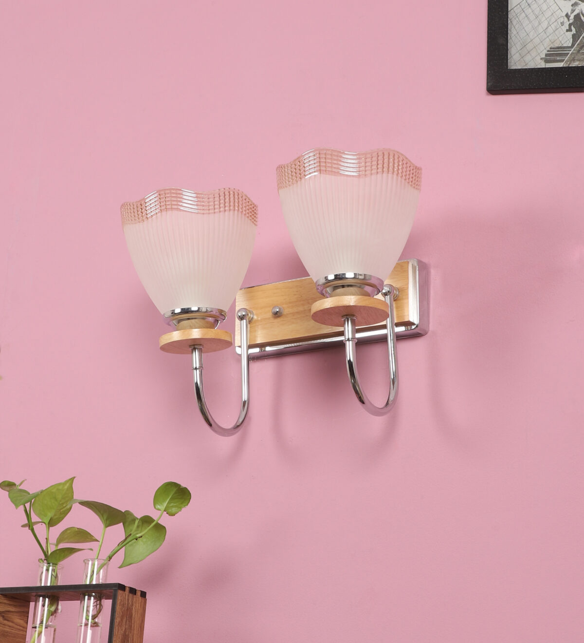 Modern light brown, silver (wood – chrome) finish double wall light made of wood and mild steel having taper frosted glasses with golden border. It is maintenance free, easy to remove glass and wash it, comes with an E27 holder, only the change of lamp is required, which is available locally everywhere. You can of course swap out the bulb for one that is dimmable, has a higher light output or a different color temperature. Application includes both residential and commercial premises wherever it matches with your interiors. Matching single wall light code – WL2369. Can be customized as per requirement in case of bulk quantities. Lamp not included.