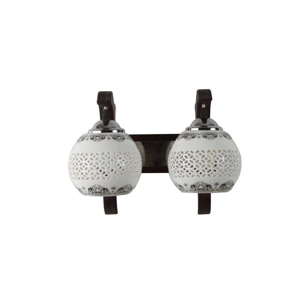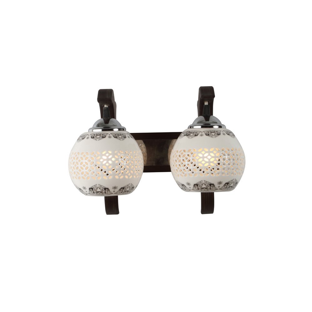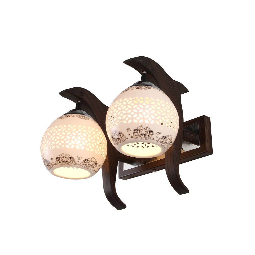 Dark brown (wood) finish, ceramic netted glass with a black print, down facing double wall light AMD foe mild steel and wood. It is maintenance free, easy to remove glass and wash it. Comes with an E27 holder, only the change of lamp is required, which is available locally everywhere. Application includes both residential and commercial premises wherever it matches with your interiors. Matching single wall light code WL2393. Can be customized as per requirement in case of bulk quantities. Lamp not included.