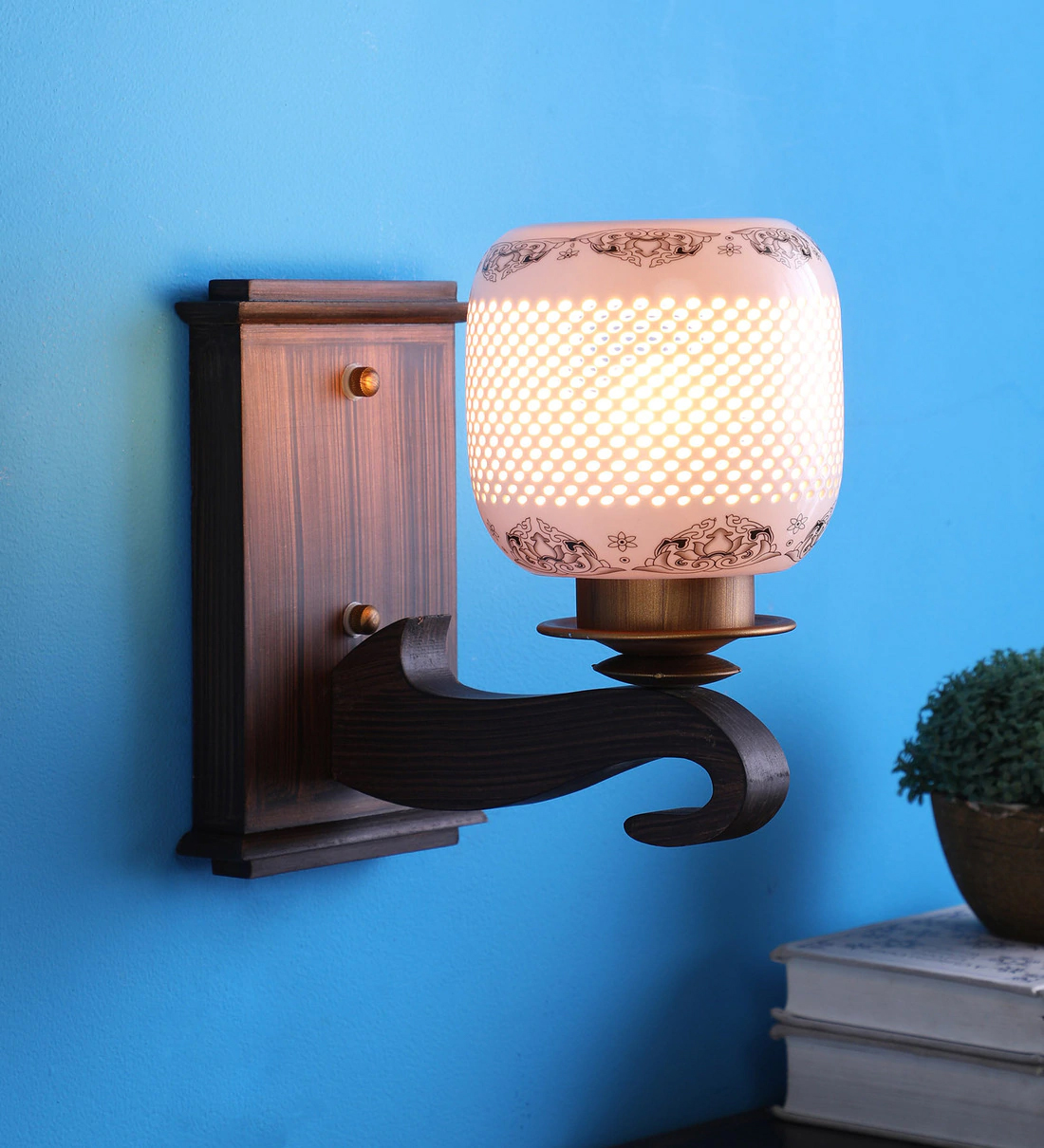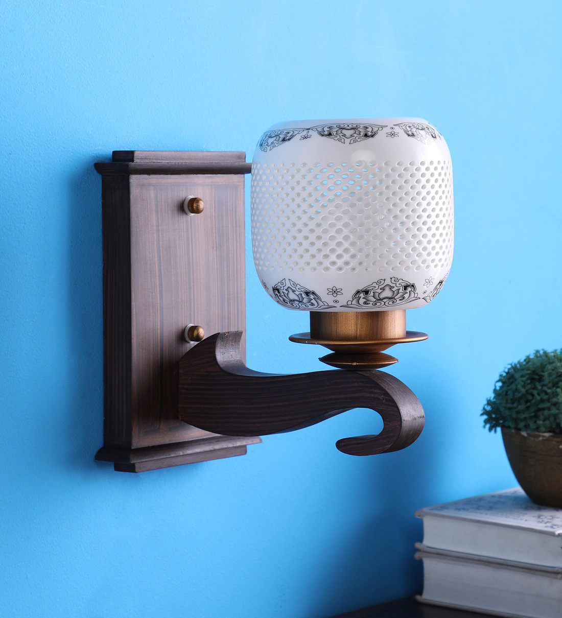 Dark brown (wood), gold finish, ceramic netted glass with a black print, single wall light made of mild steel and wood. It is maintenance free, easy to remove glass and wash it. Comes with an E27 holder, only the change of lamp is required, which is available locally everywhere. Application includes both residential and commercial premises wherever it matches with your interiors. Matching double wall light code WL2404. Matching chandelier code – CH399. Can be customized as per requirement in case of bulk quantities. Lamp not included.