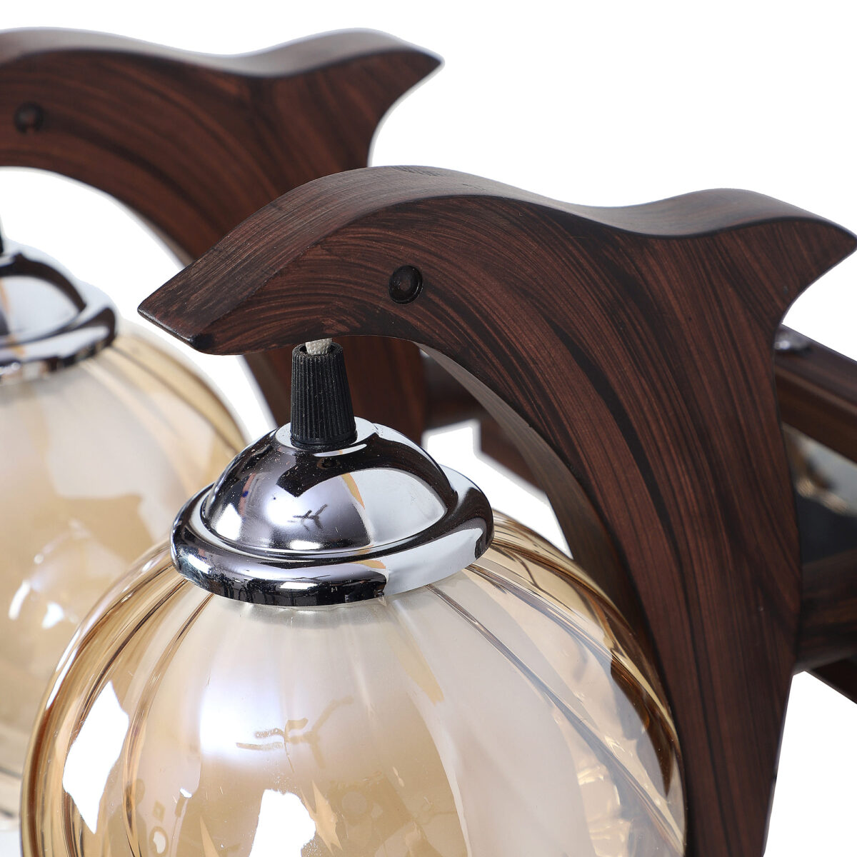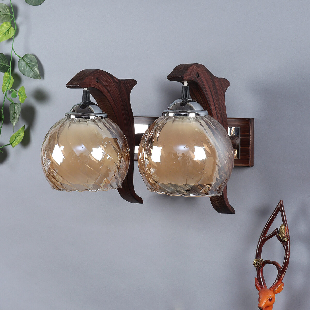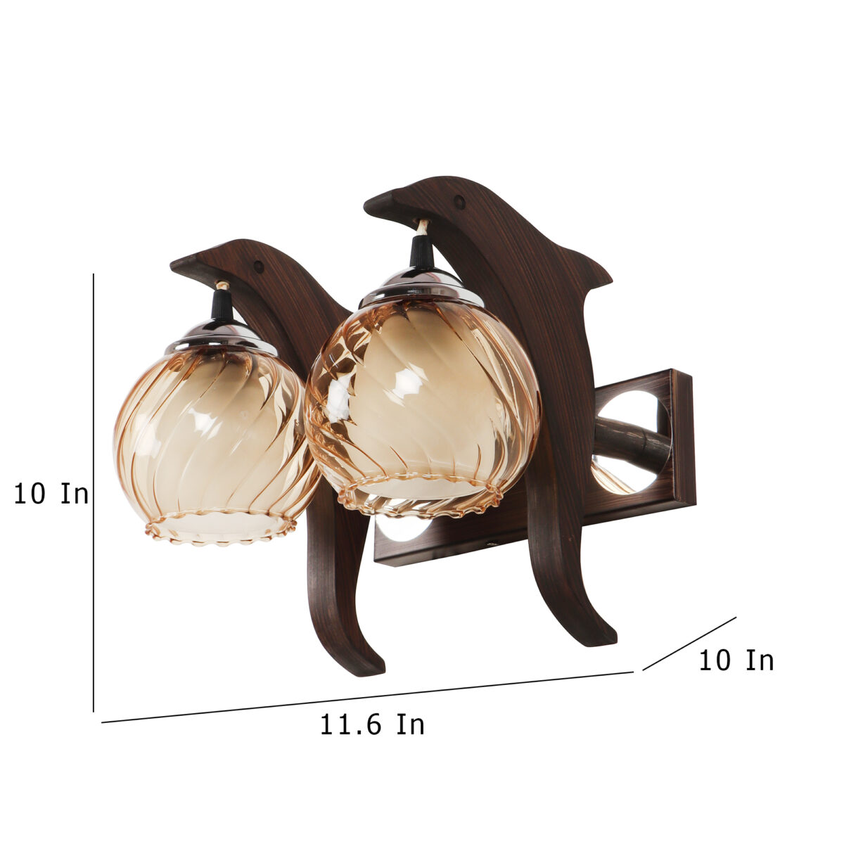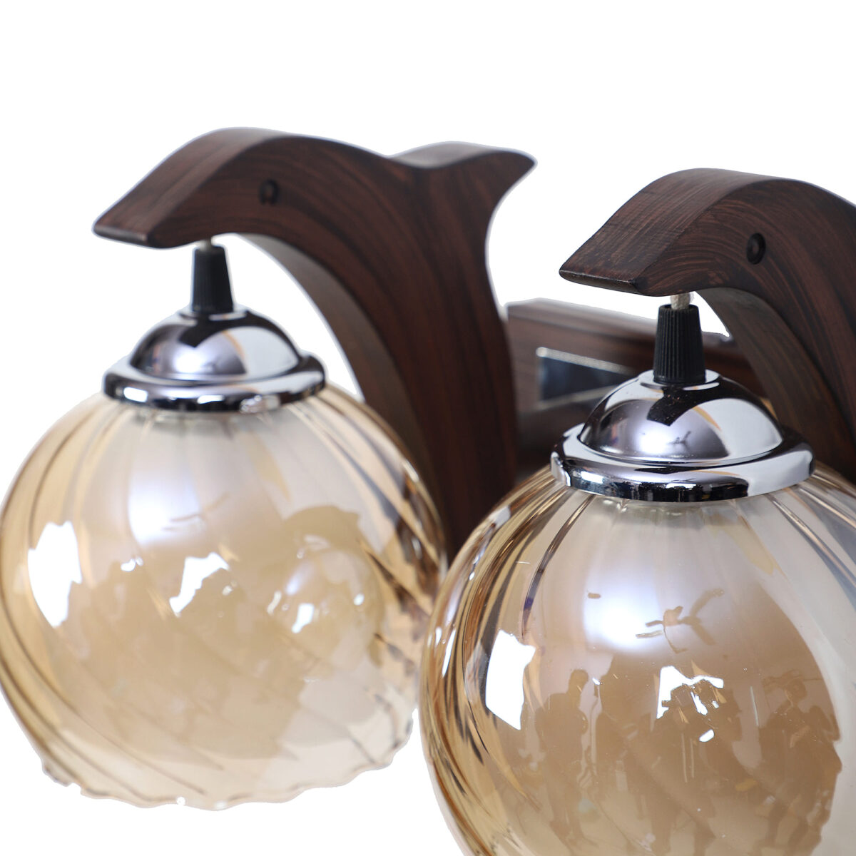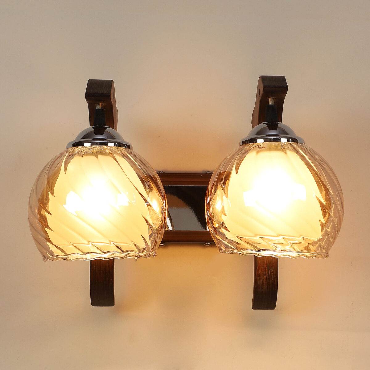 Dark brown, silver, (wood – chrome) finish, small, round globe (doom) Champaign colored two layer glasses, down facing double wall light made of mild steel and wood. It is maintenance free, easy to remove glass and wash them. Comes with an E27 holder, only the change of lamp is required, which is available locally everywhere. Application includes both residential and commercial premises wherever it matches with your interiors. Matching single wall light code WL2411. Can be customized as per requirement in case of bulk quantities. Lamp not included.