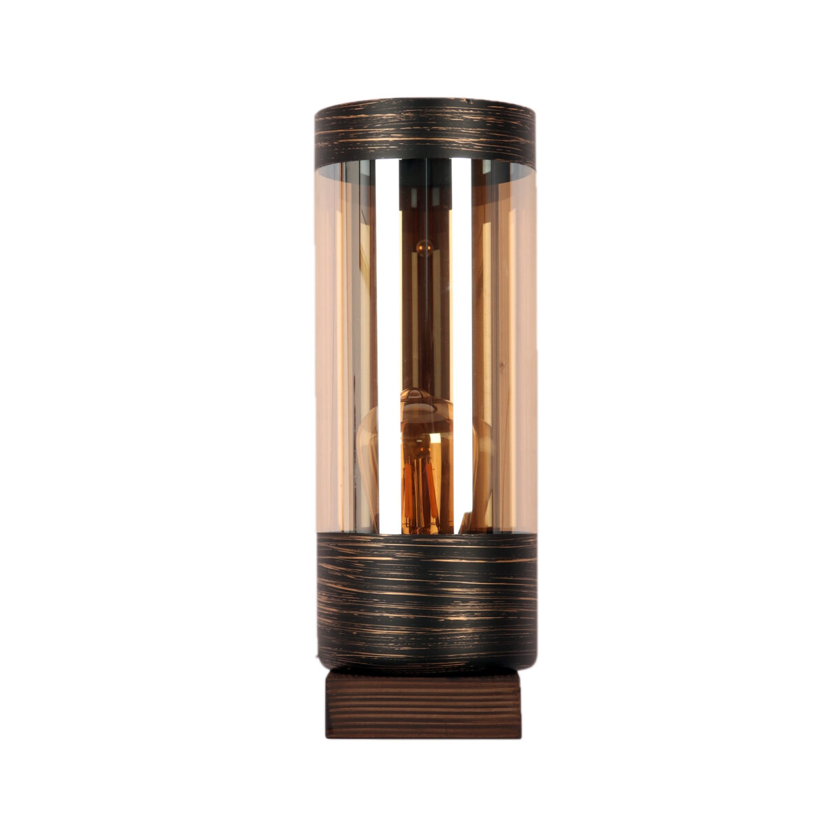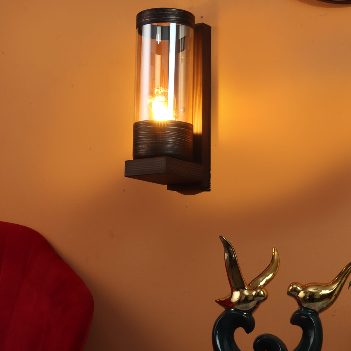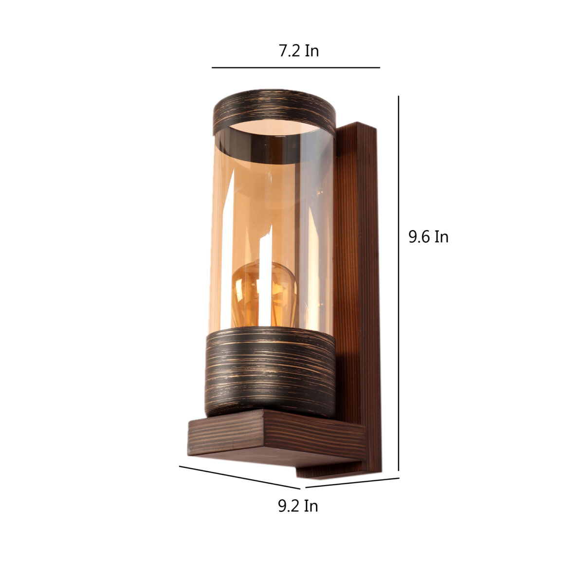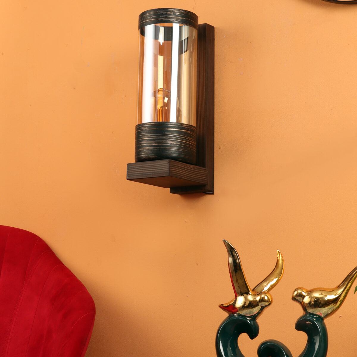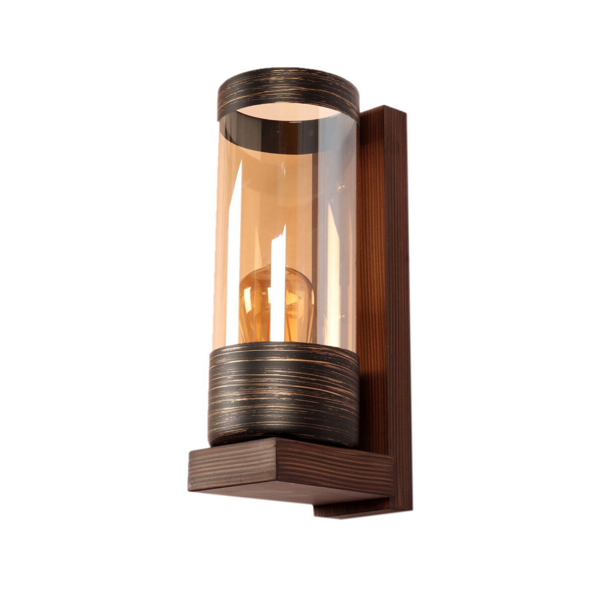Modern dark brown (wood) finish single wall light made of wood, with a long cylinderical champaign coloured glass. It is maintenance free, easy to remove glass and wash it, comes with an E27 holder, only the change of lamp is required, which is available locally everywhere. You can of course swap out the bulb for one that is dimmable, has a higher light output or a different color temperature. Application includes both residential and commercial premises wherever it matches with your interiors. Looks amazing with LED filament lamp. Lamp not included.