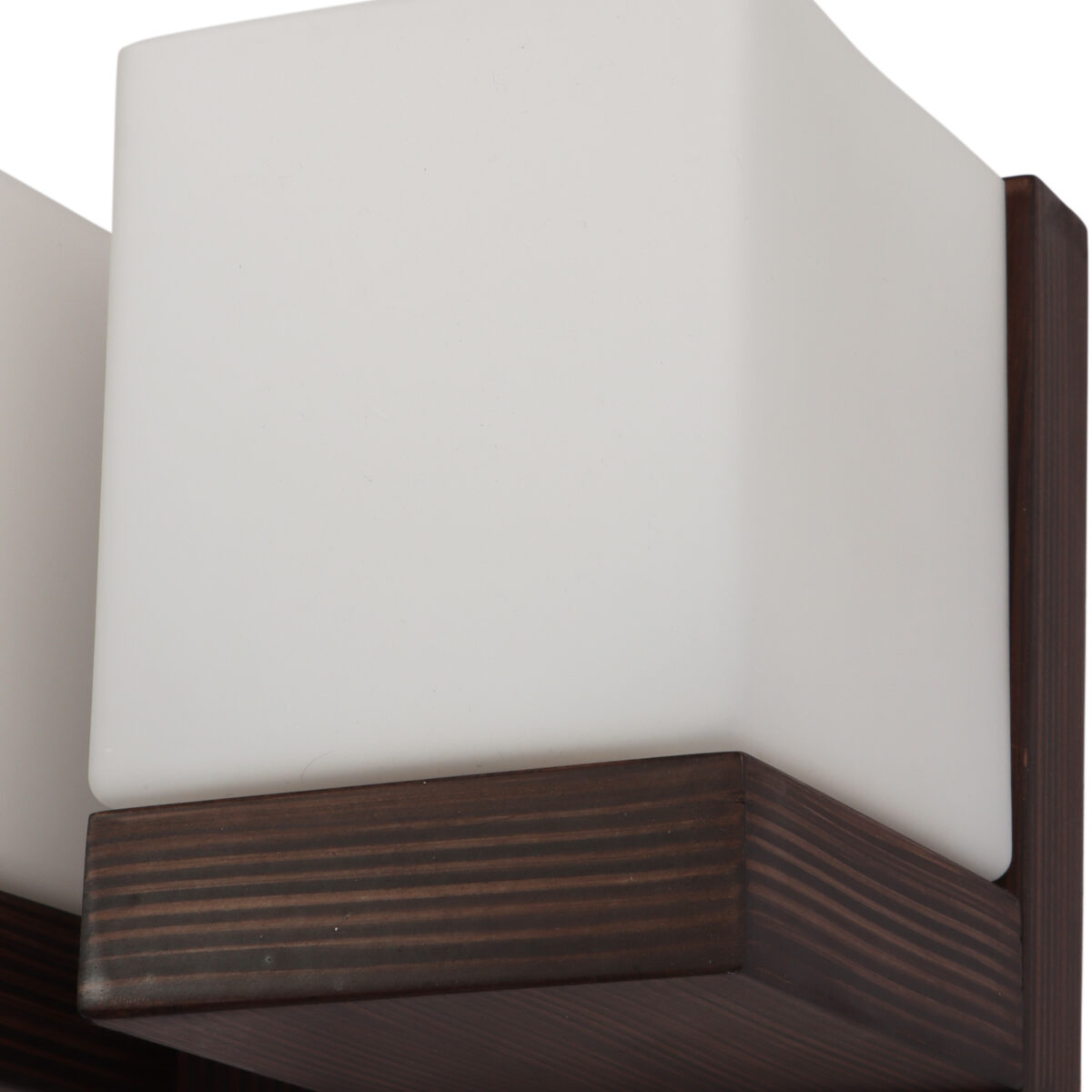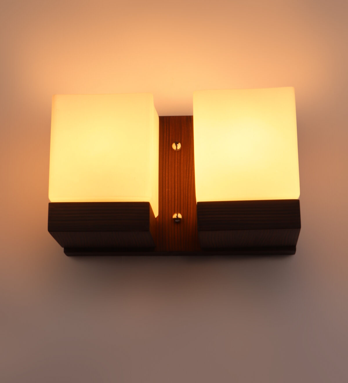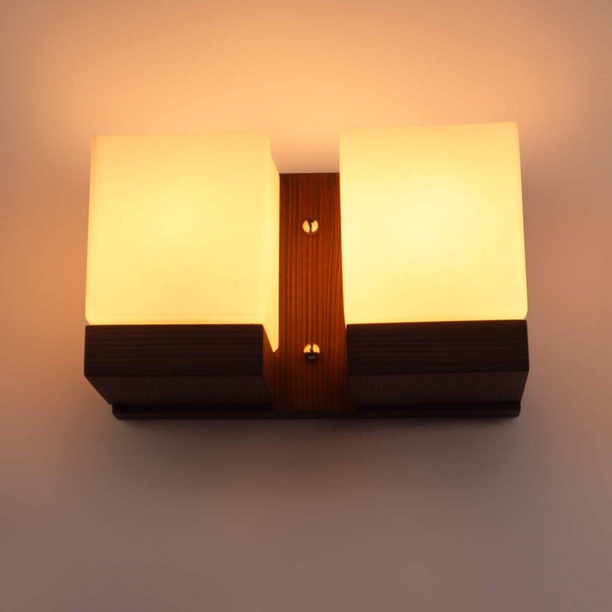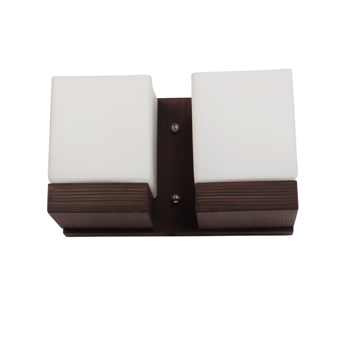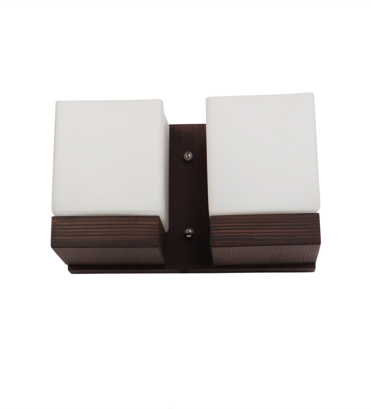 Modern dark brown (wood) finish double wall light made of wood, with square cubical white glasses. It is maintenance free, easy to remove glass and wash it, comes with an E27 holder, only the change of lamp is required, which is available locally everywhere. You can of course swap out the bulb for one that is dimmable, has a higher light output or a different color temperature. Application includes both residential and commercial premises wherever it matches with your interiors. Matching single wall light code WL2605. Can be customized as per requirement in case of bulk quantities. It is one of the top selling product in our catalogue. Lamp not included.