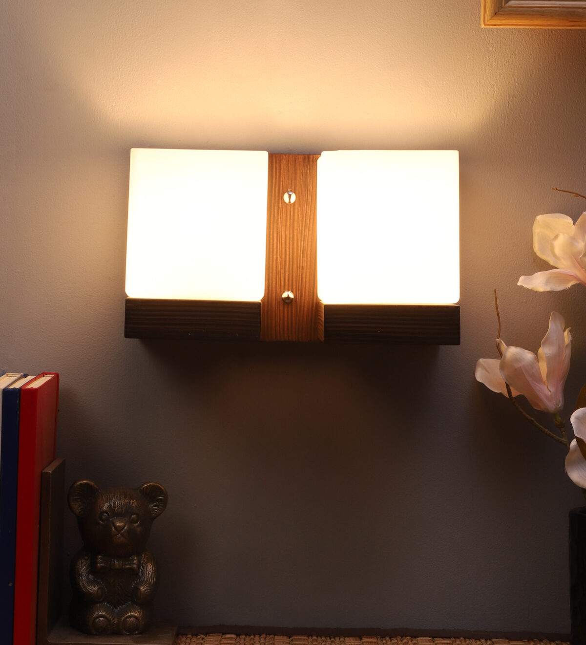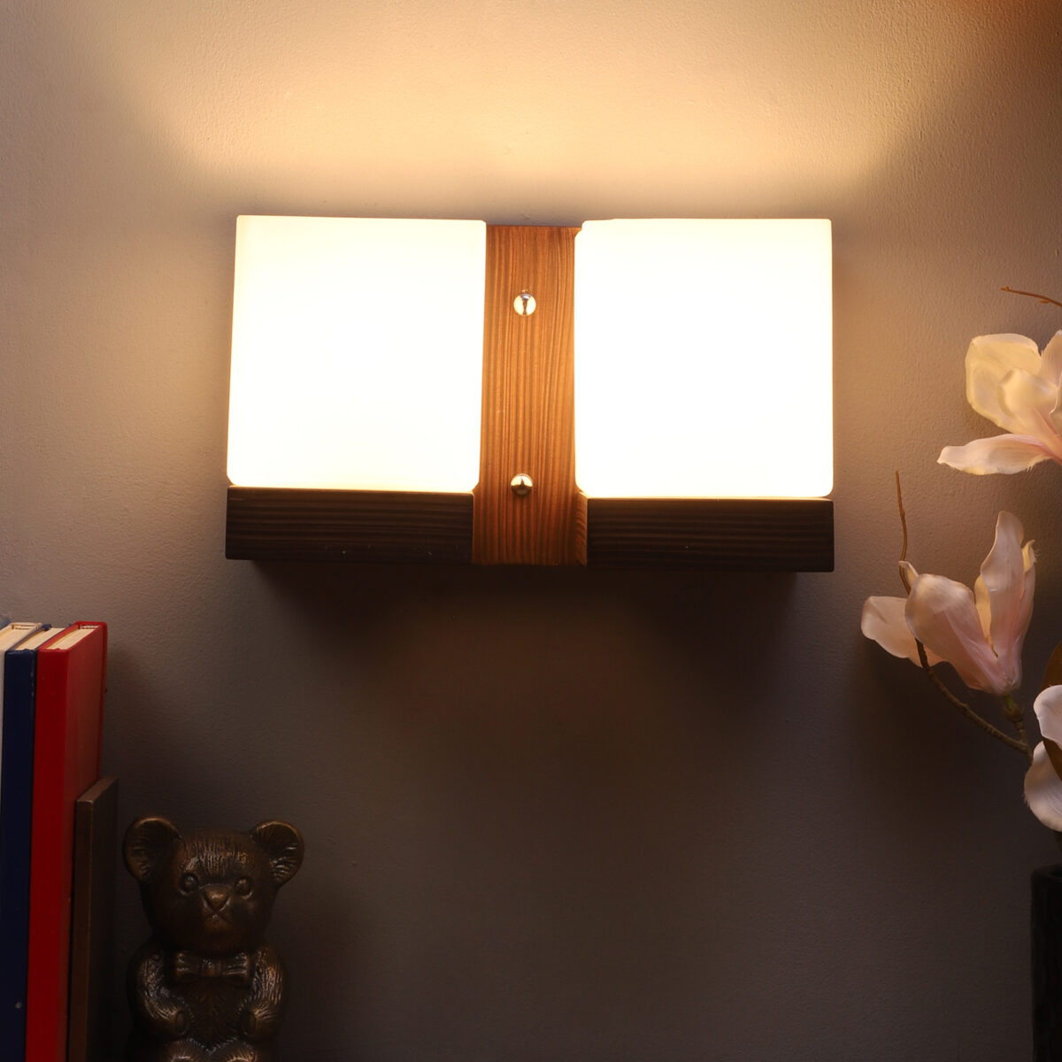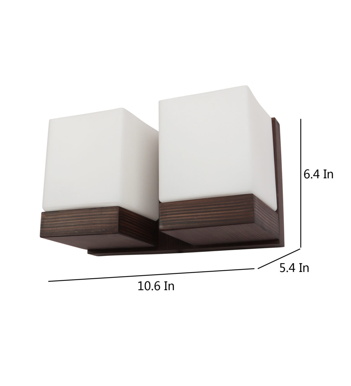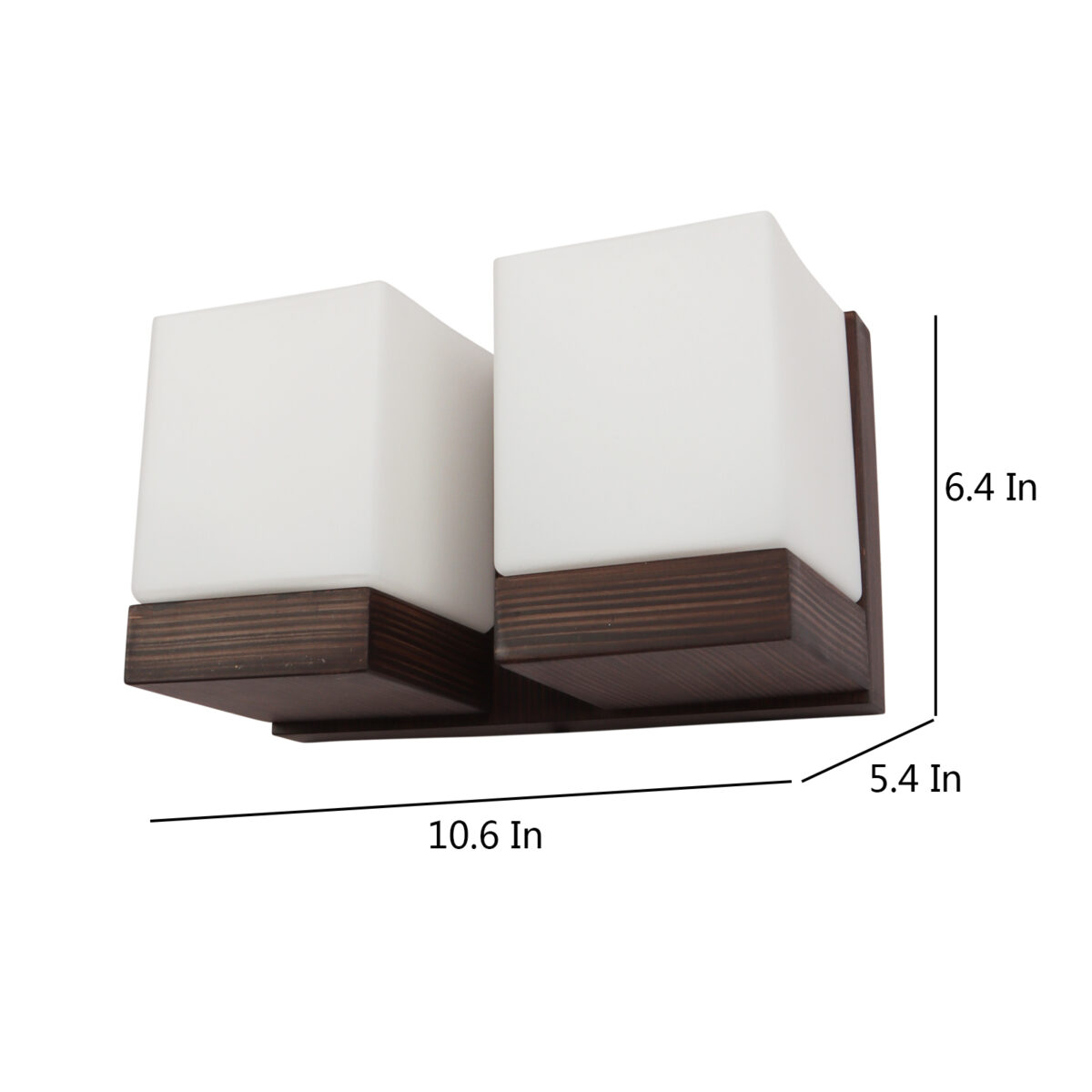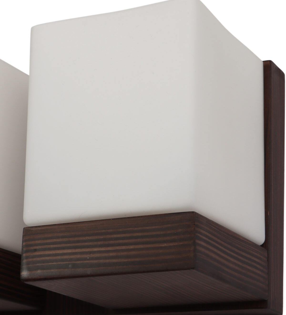 Modern dark brown (wood) finish double wall light made of wood, with square cubical white glasses. It is maintenance free, easy to remove glass and wash it, comes with an E27 holder, only the change of lamp is required, which is available locally everywhere. You can of course swap out the bulb for one that is dimmable, has a higher light output or a different color temperature. Application includes both residential and commercial premises wherever it matches with your interiors. Matching single wall light code WL2605. Can be customized as per requirement in case of bulk quantities. It is one of the top selling product in our catalogue. Lamp not included.