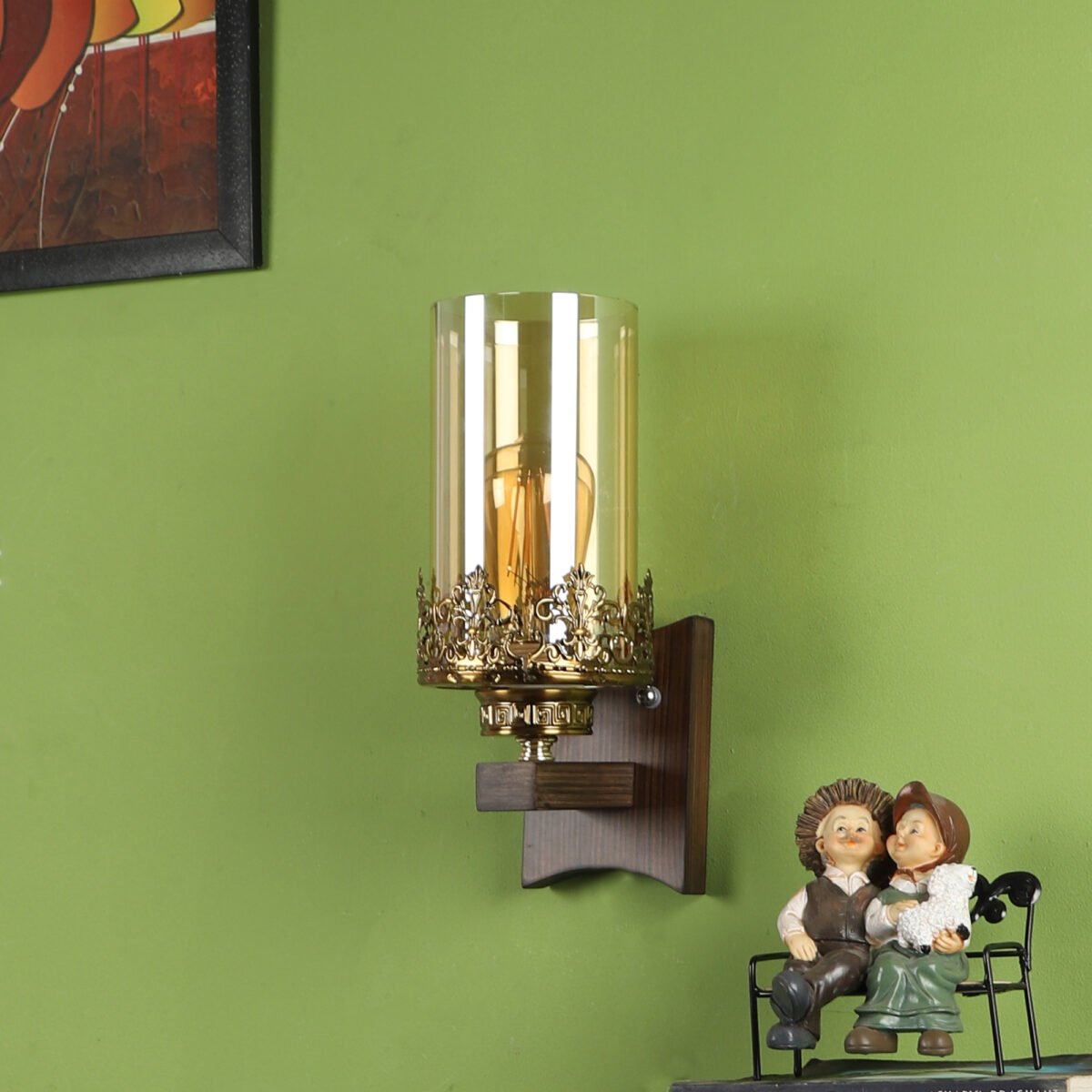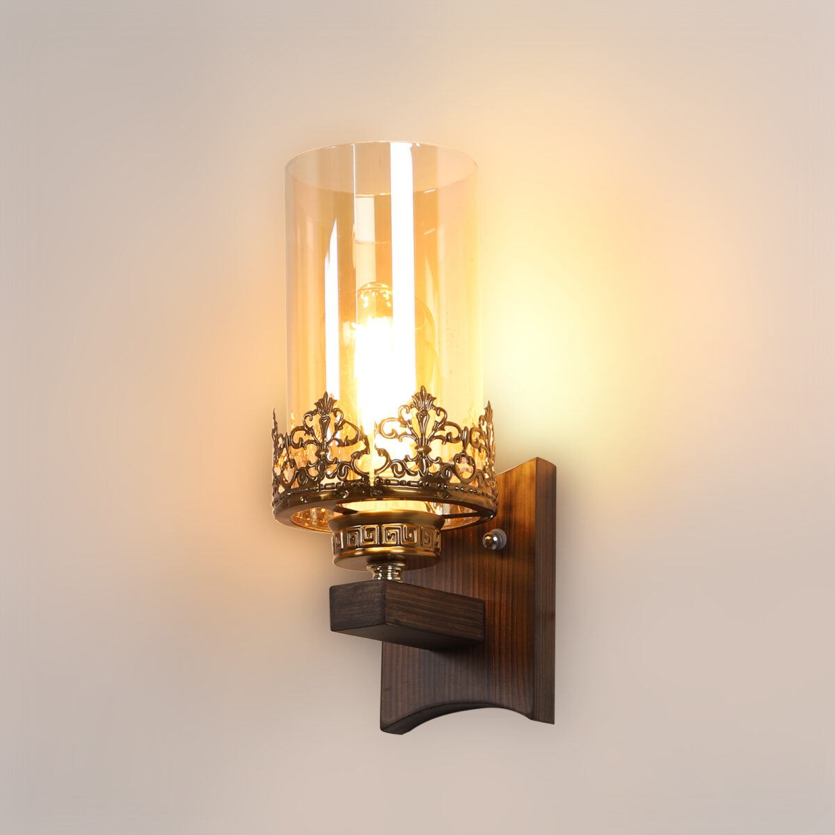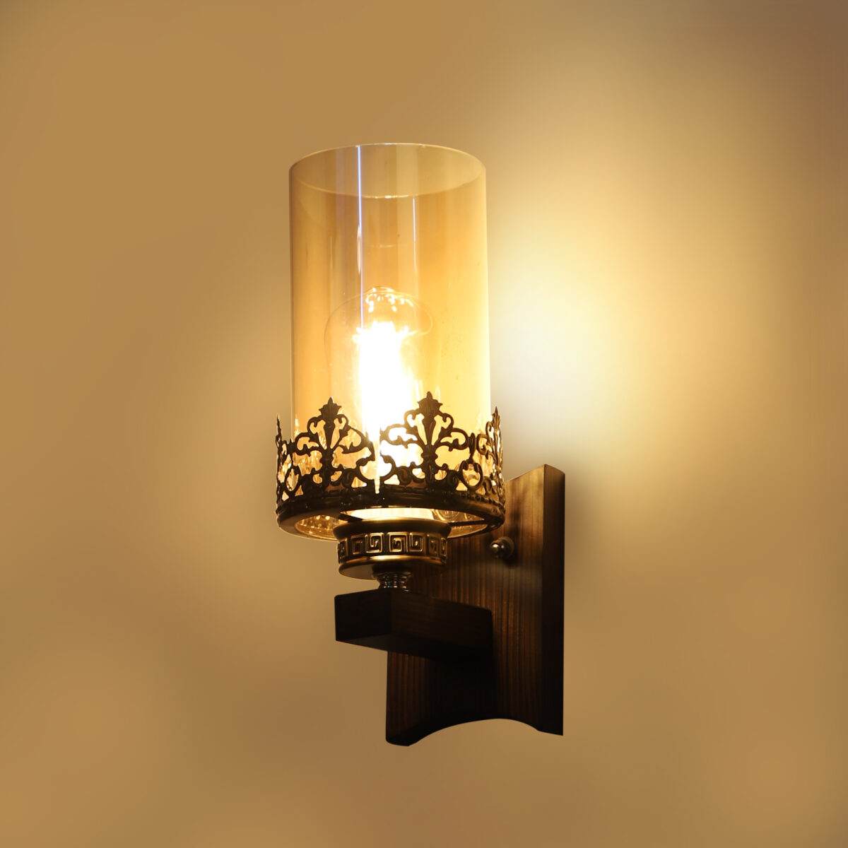 Dark brown finish single wall light having cylinderical champaign coloured glass mounted on a designer frame made of wood and mild steel.. It is maintenance free. It is easy to remove glass and wash it. Comes with an E27 holder, only the change of lamp is required, which is available locally everywhere. Looks amazing with LED filament lamp. Application includes both residential and commercial premises wherever it matches with your interiors. Can be customized as per requirement, LAMP NOT INCLUDED.