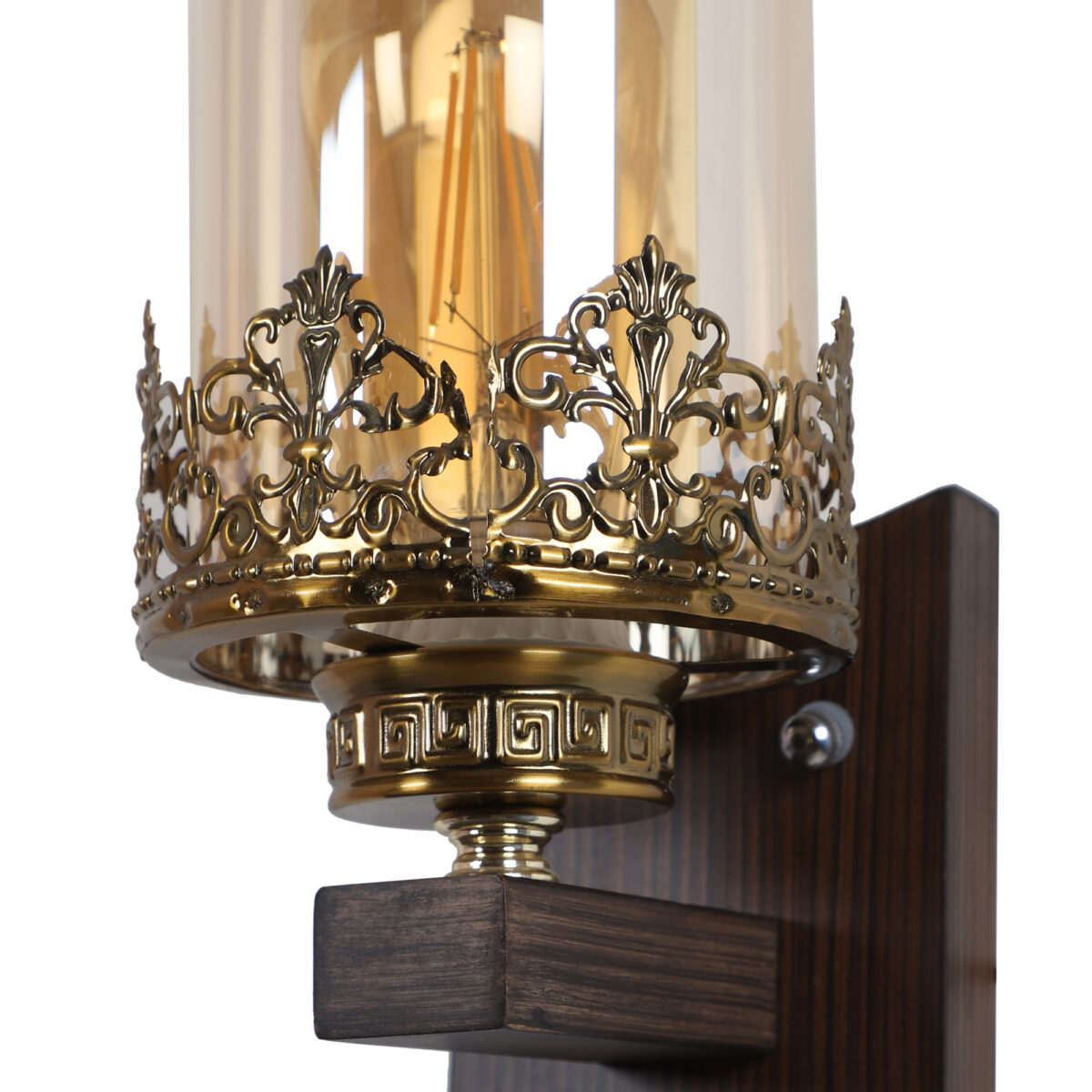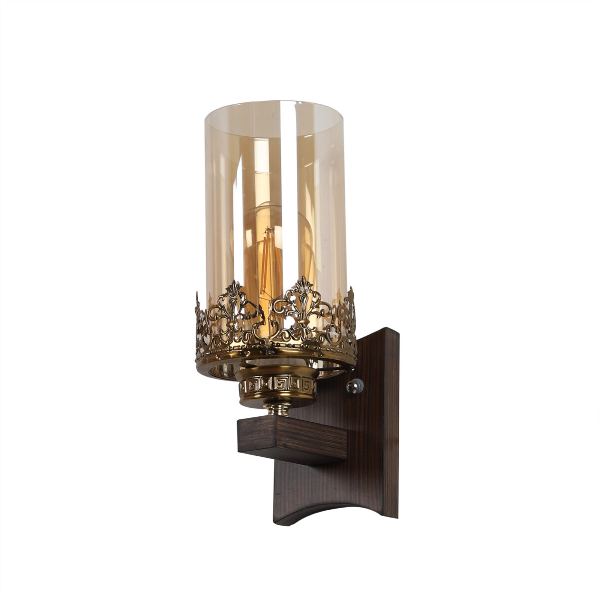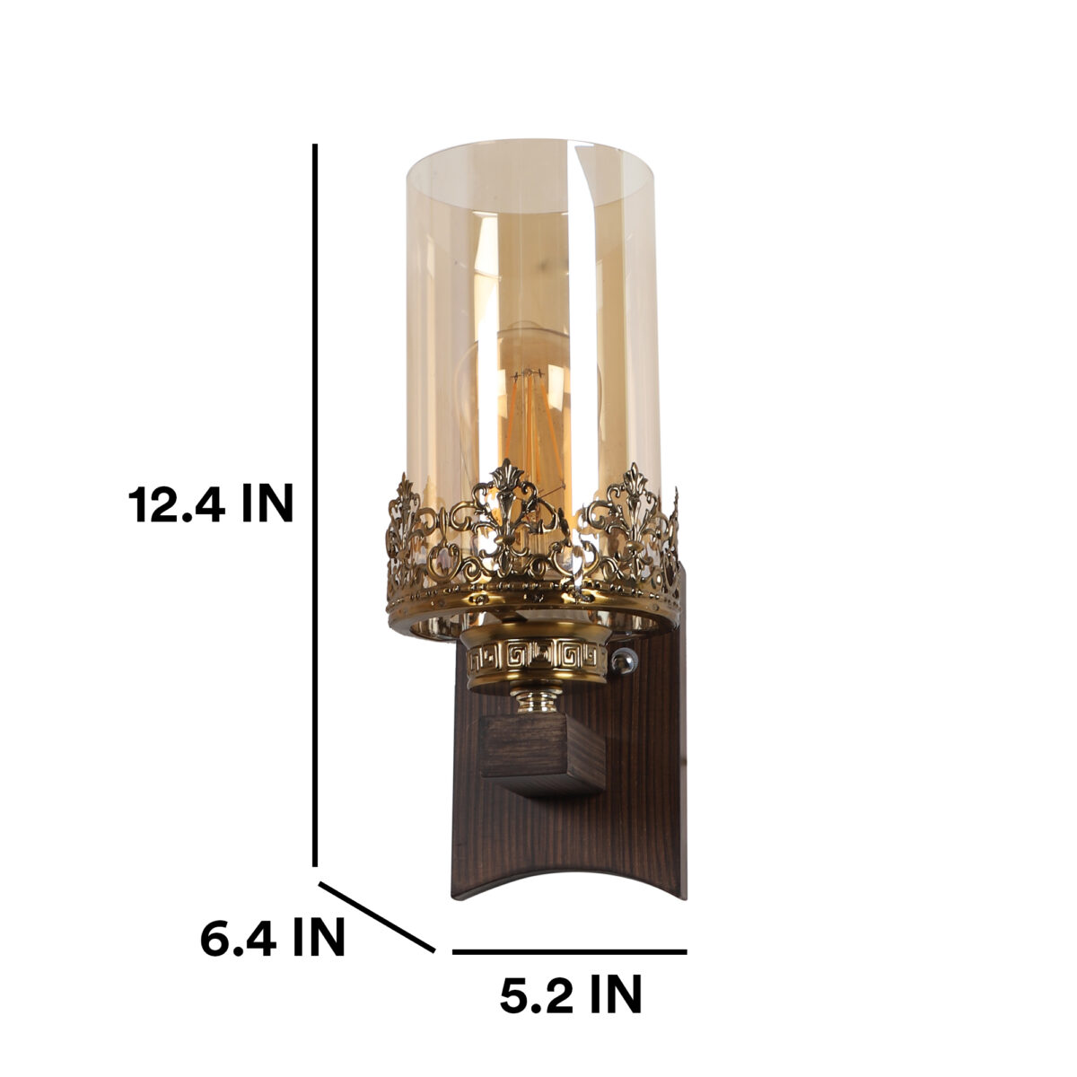 Dark brown finish single wall light having cylinderical champaign coloured glass mounted on a designer frame made of wood and mild steel.. It is maintenance free. It is easy to remove glass and wash it. Comes with an E27 holder, only the change of lamp is required, which is available locally everywhere. Looks amazing with LED filament lamp. Application includes both residential and commercial premises wherever it matches with your interiors. Can be customized as per requirement, LAMP NOT INCLUDED.