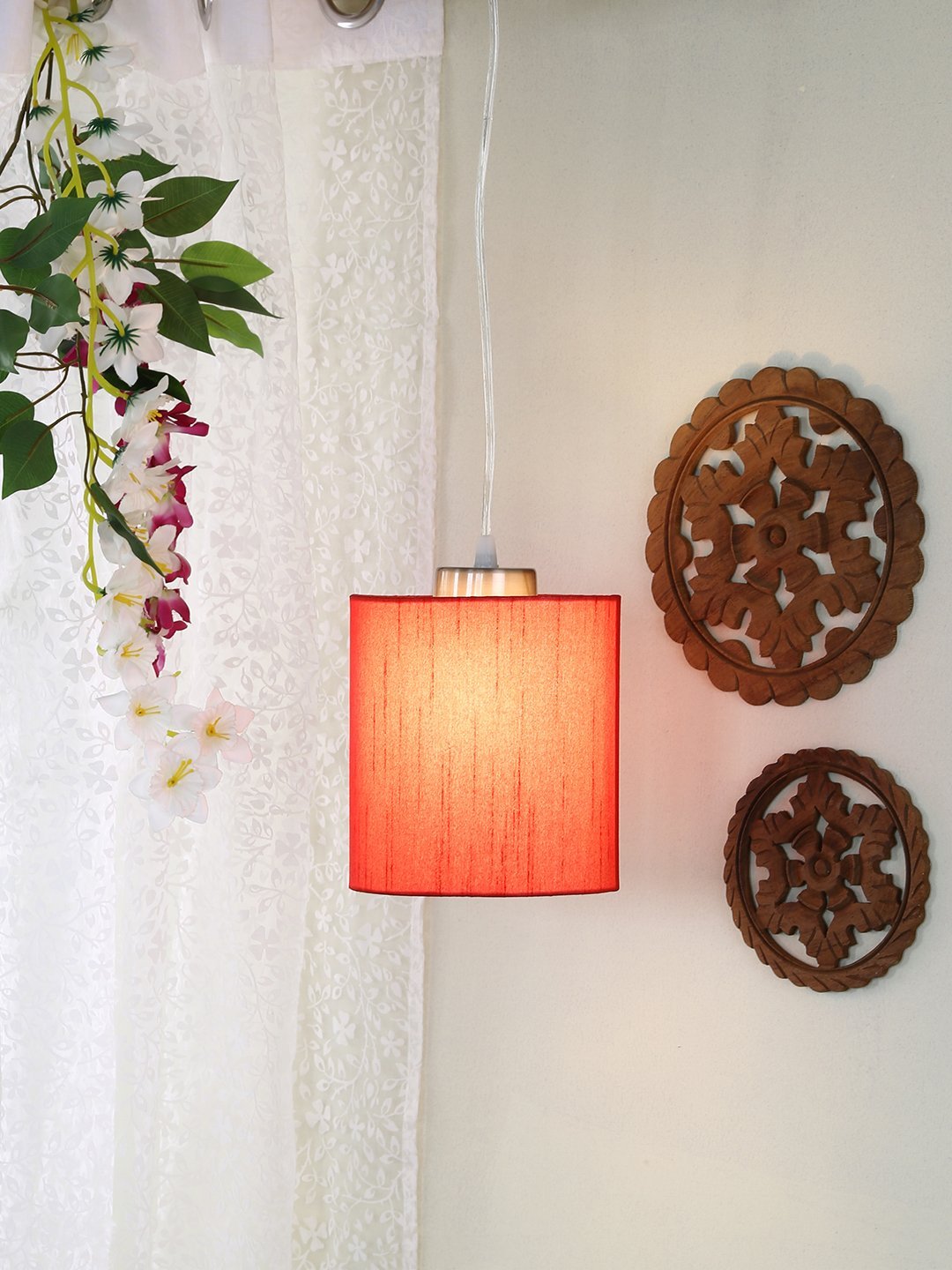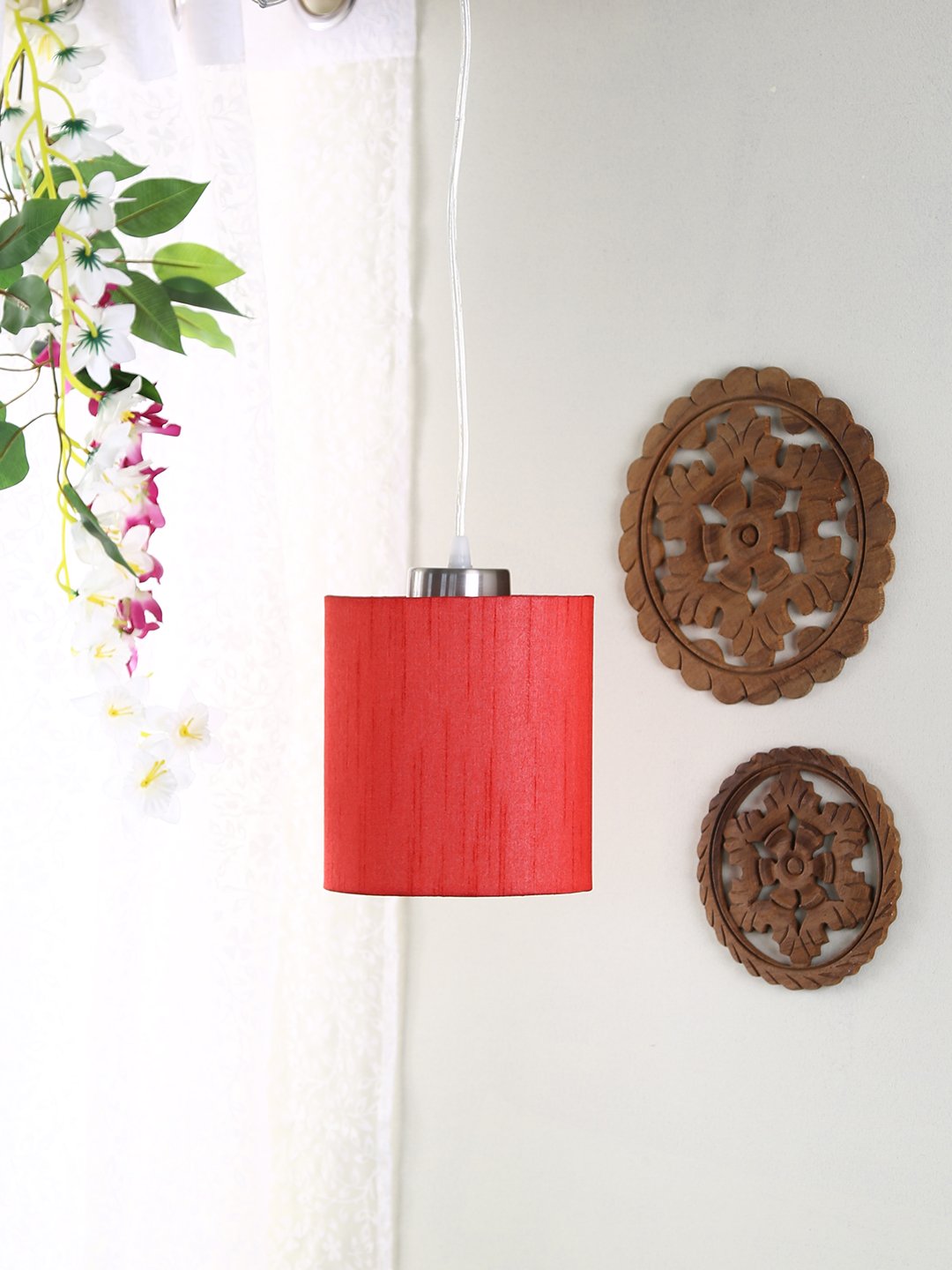 Red single hanging light with oval long fabric shade and mild steel attachment in silver (satin nickel) finish. The suspension can be adjusted at time of installation to the desired height. It is maintenance free, comes with an E27 holder, only the change of lamp is required, which is available locally everywhere. Application includes both residential and commercial premises wherever it matches with your interiors. Other variations with different color -HL3733, HL3734. Can be customized as per requirement in case of bulk quantities. Lamp not included.