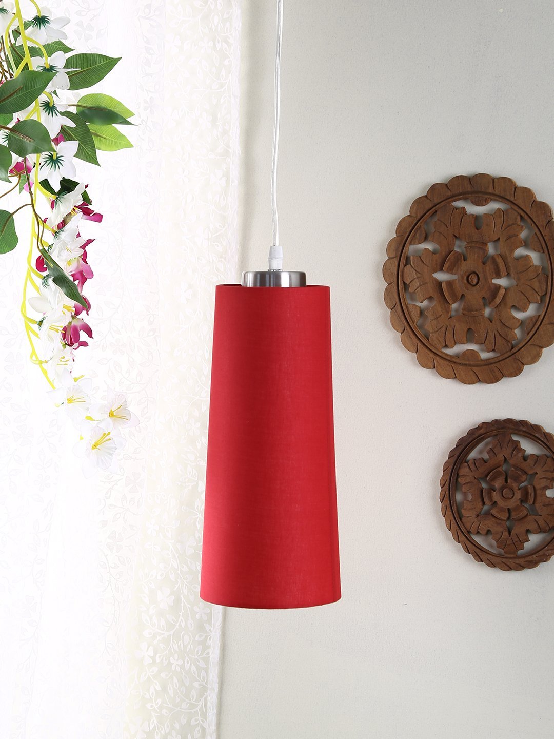 Red hanging light with conical long fabric shade and mild steel attachment in Silver (satin nickel) finish. The suspension can be adjusted at time of installation to the desired height. It is maintenance free, comes with an E27 holder, only the change of lamp is required, which is available locally everywhere. Application includes both residential and commercial premises wherever it matches with your interiors. Other variations with different color – HL3739, HL3740, HL3741, HL3742, HL3743,HL3744, HL3745, HL3746, HL3747. Can be customized as per requirement in case of bulk quantities. Lamp not included.