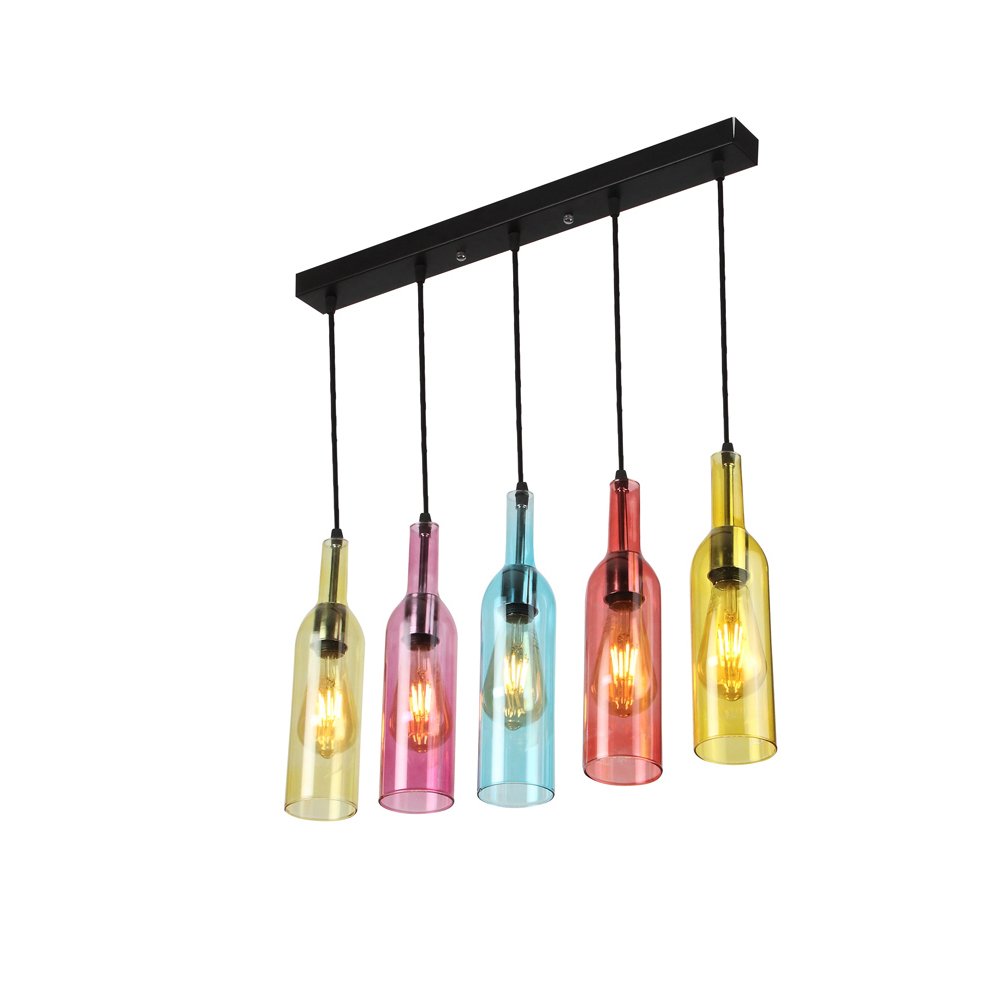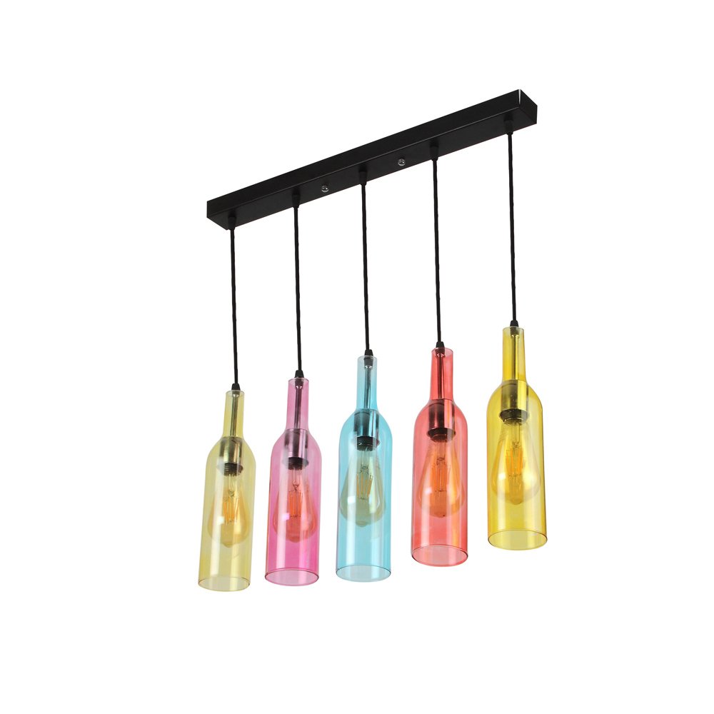Multi colored bottle shaped, designer, traditional, mild steel five light hanging light in red, yellow and blue transparent glass. The suspension can be adjusted at time of installation to the desired height. It is maintenance free, comes with an E27 holder, only the change of lamp is required, which is available locally everywhere. LED filament lamp is recommended to enhance its beauty. Application includes both residential and commercial premises wherever it matches with your interiors. Other hanging variations are – HL5048-5, HL5048-B, HL5048-R, HL5-48-Y Can be customized as per requirement in case of bulk quantities. Lamp not included.