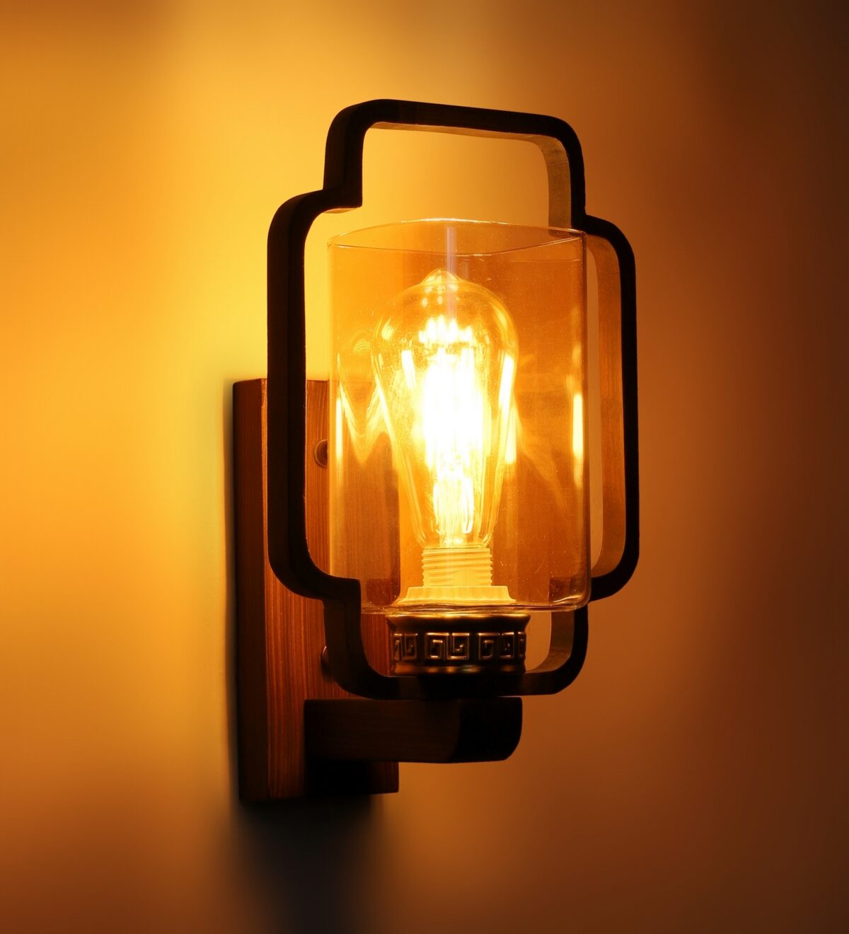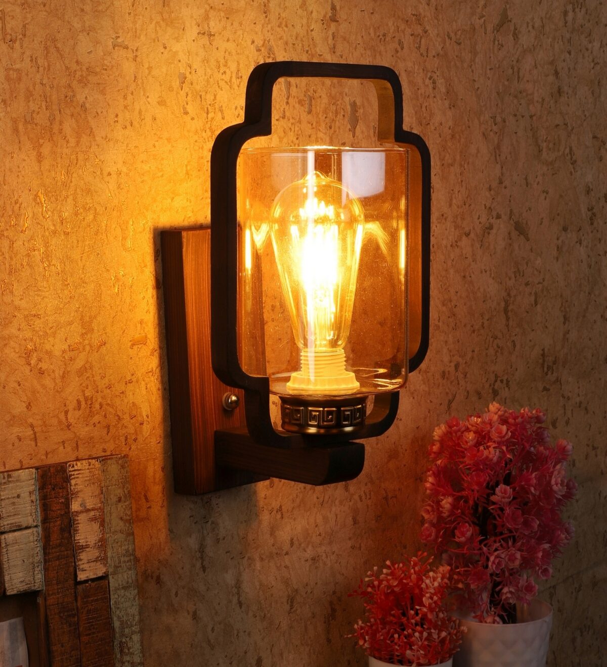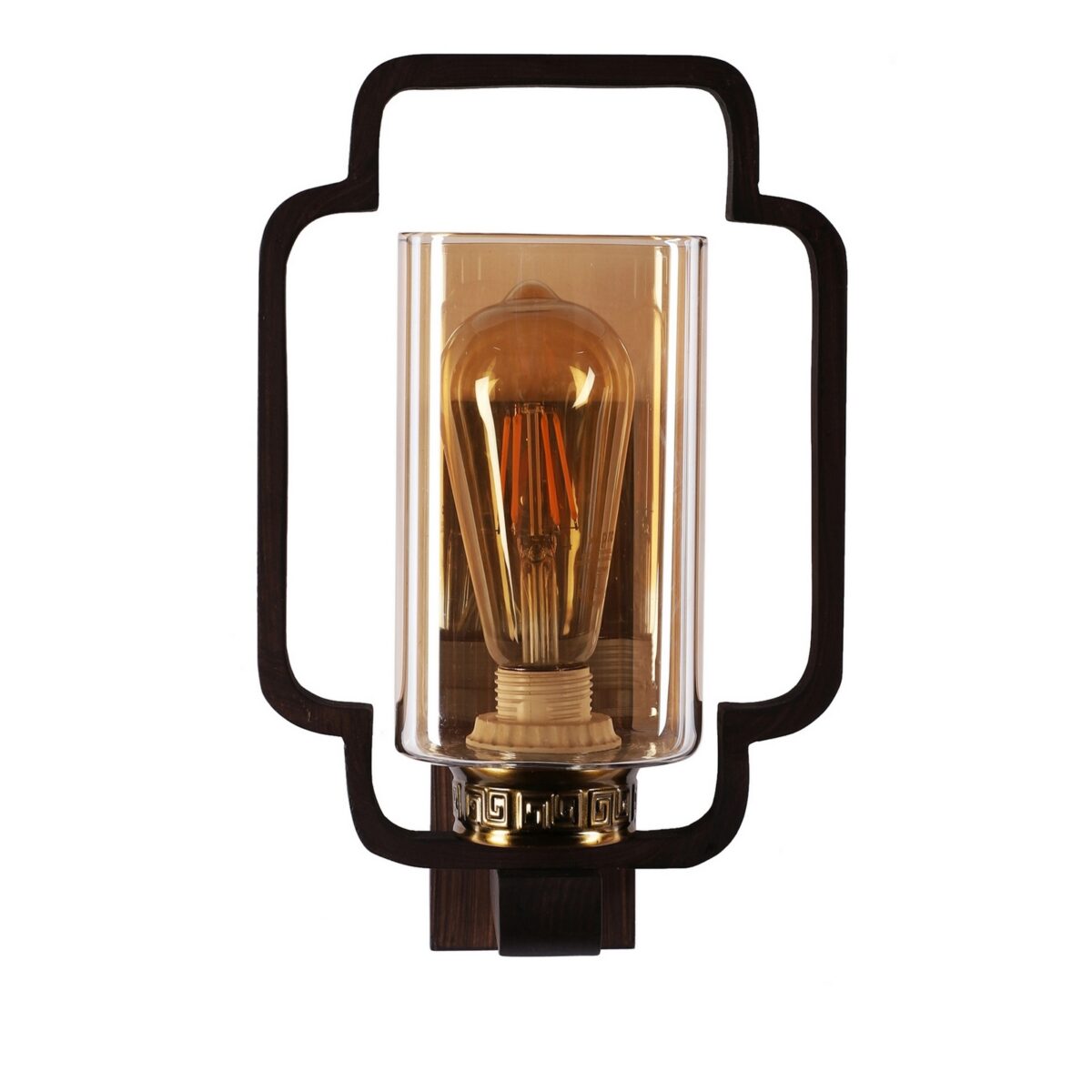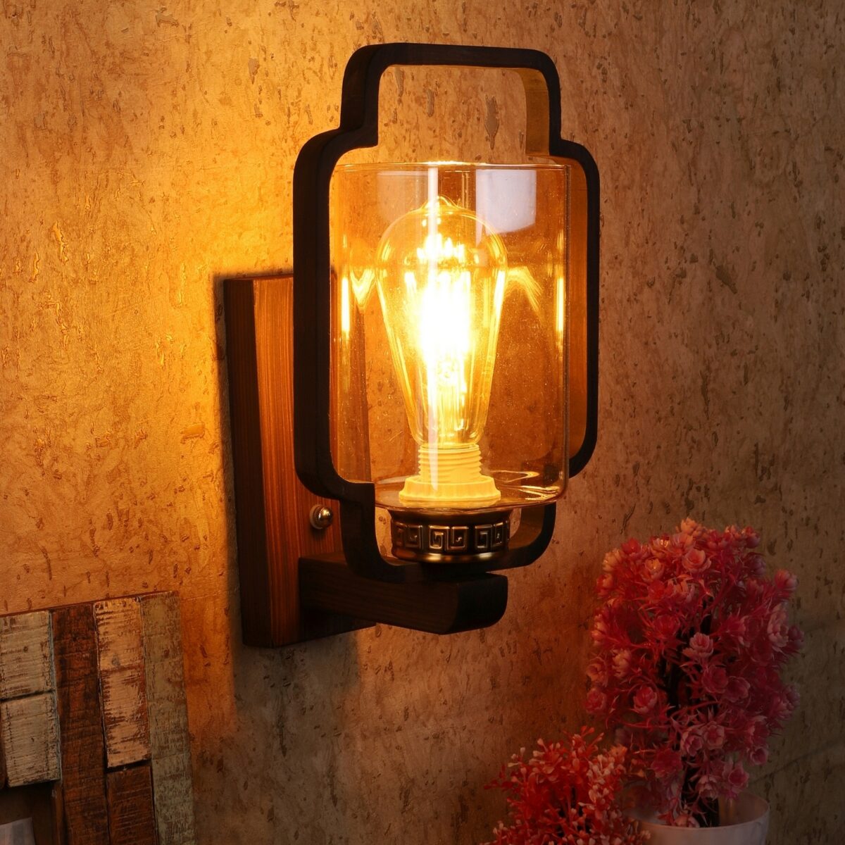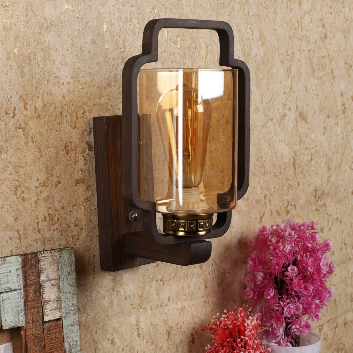 Wooden dark brown gold (wood gold) finish single wall light made of wood and mild steel, with square shaped Champaign colored glass. It is maintenance free, easy to remove glass and wash it, comes with an E27 holder, only the change of lamp is required, which is available locally everywhere. You can of course swap out the bulb for one that is dimmable, has a higher light output or a different color temperature. Application includes both residential and commercial premises wherever it matches with your interiors. Can be customized as per requirement in case of bulk quantities. LAMP NOT INCLUDED.