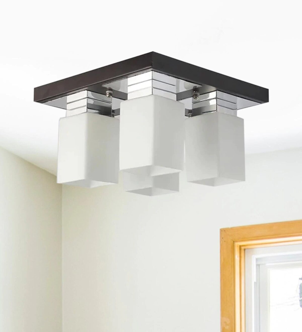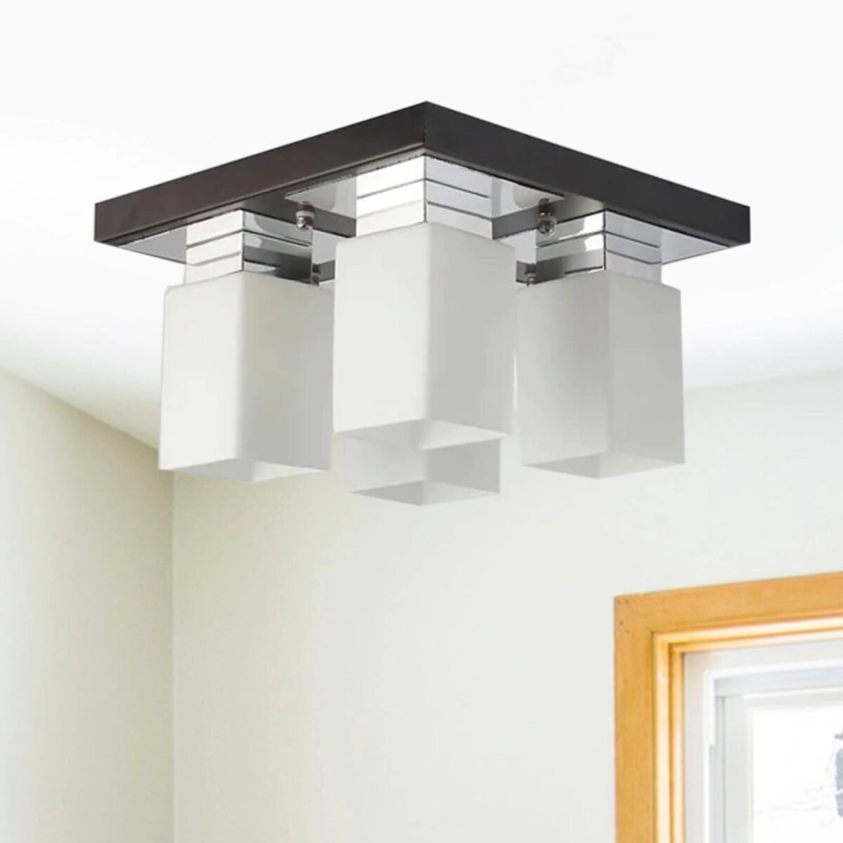 Dark brown(wood – chrome) finish, square long glass mounted on a mild steel plate having four lamps made of mild steel and glass. It is one of the regular design which is never out of trend and is among one of the best sellers. It is maintenance free, easy to remove glass and wash them, comes with an E27 holder, only the change of lamp is required, which is available locally everywhere. Application includes both residential and commercial premises wherever it matches with your interiors. Other variations (colour and size) in hanging light code – HL3678, HL3679, HL3651,HL3652. Related chandeliers – CH188, CH189, CH172. Matching wall light code -WL1775, WL1776. LAMP NOT INCLUDED