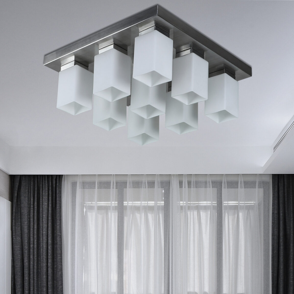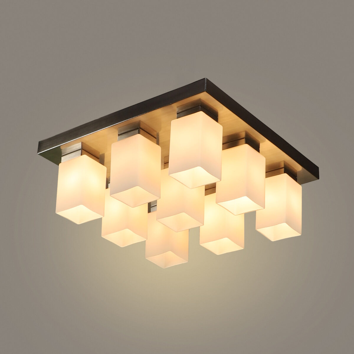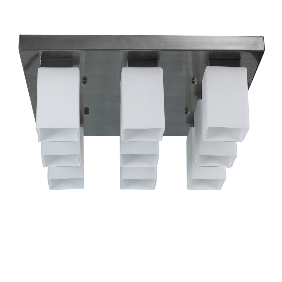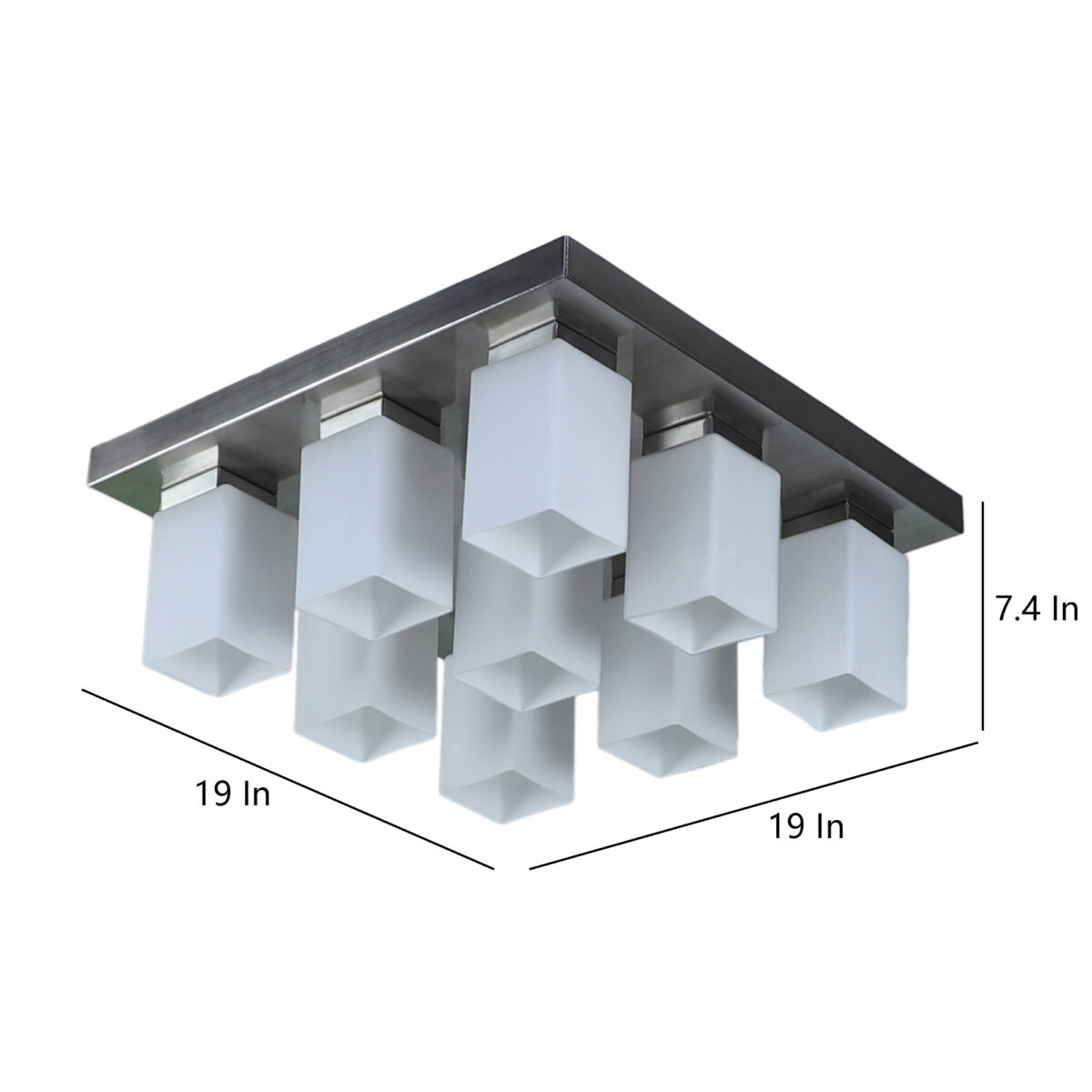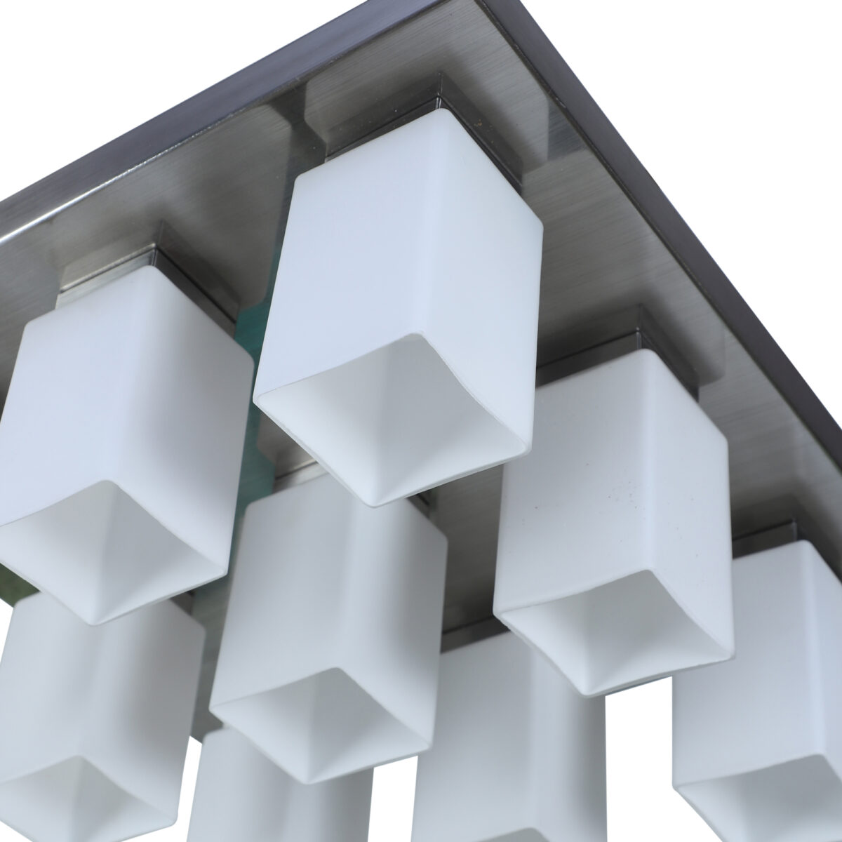 Silver (satin nickel) finish, modern square long glass mounted on a mild steel plate having nine lamps made of mild steel and glass. It is one of the regular design which is never out of trend and is among one of the best sellers. It is maintenance free, easy to remove glass and wash them, comes with an E27 holder, only the change of lamp is required, which is available locally everywhere. Application includes both residential and commercial premises wherever it matches with your interiors. Other variations (colour and size) in hanging light – HL3678, HL3679, HL3651, HL3652. Related chandeliers – CH188, CH172, CH173. Matching wall light code – Wl1894, WL1895, WL1896, WL1897, WL1898, WL1899. LAMP NOT INCLUDED.