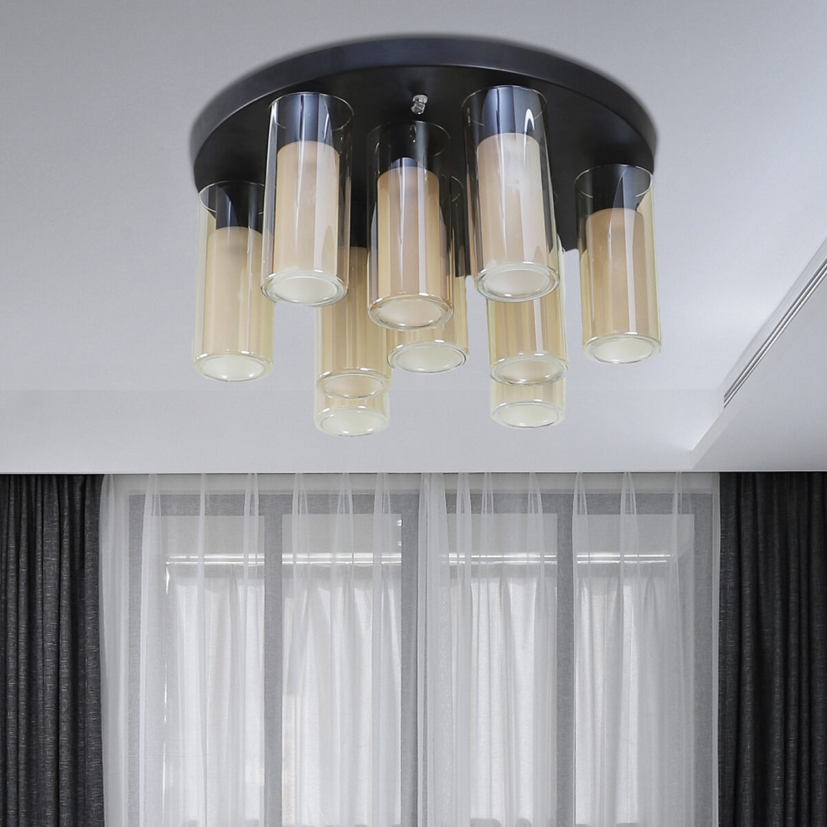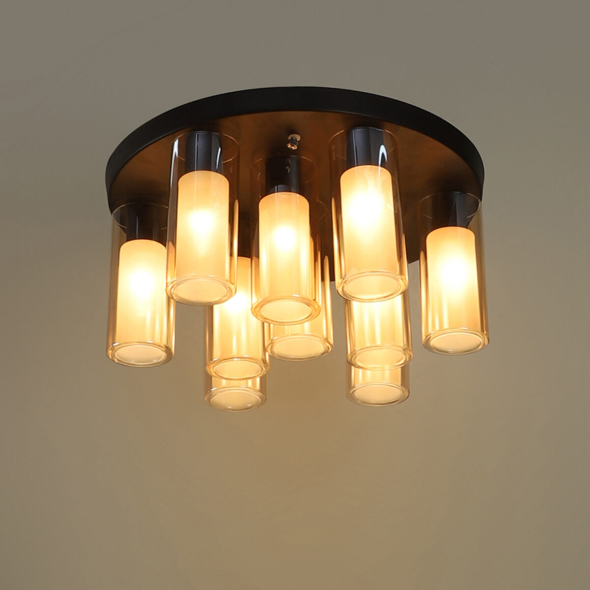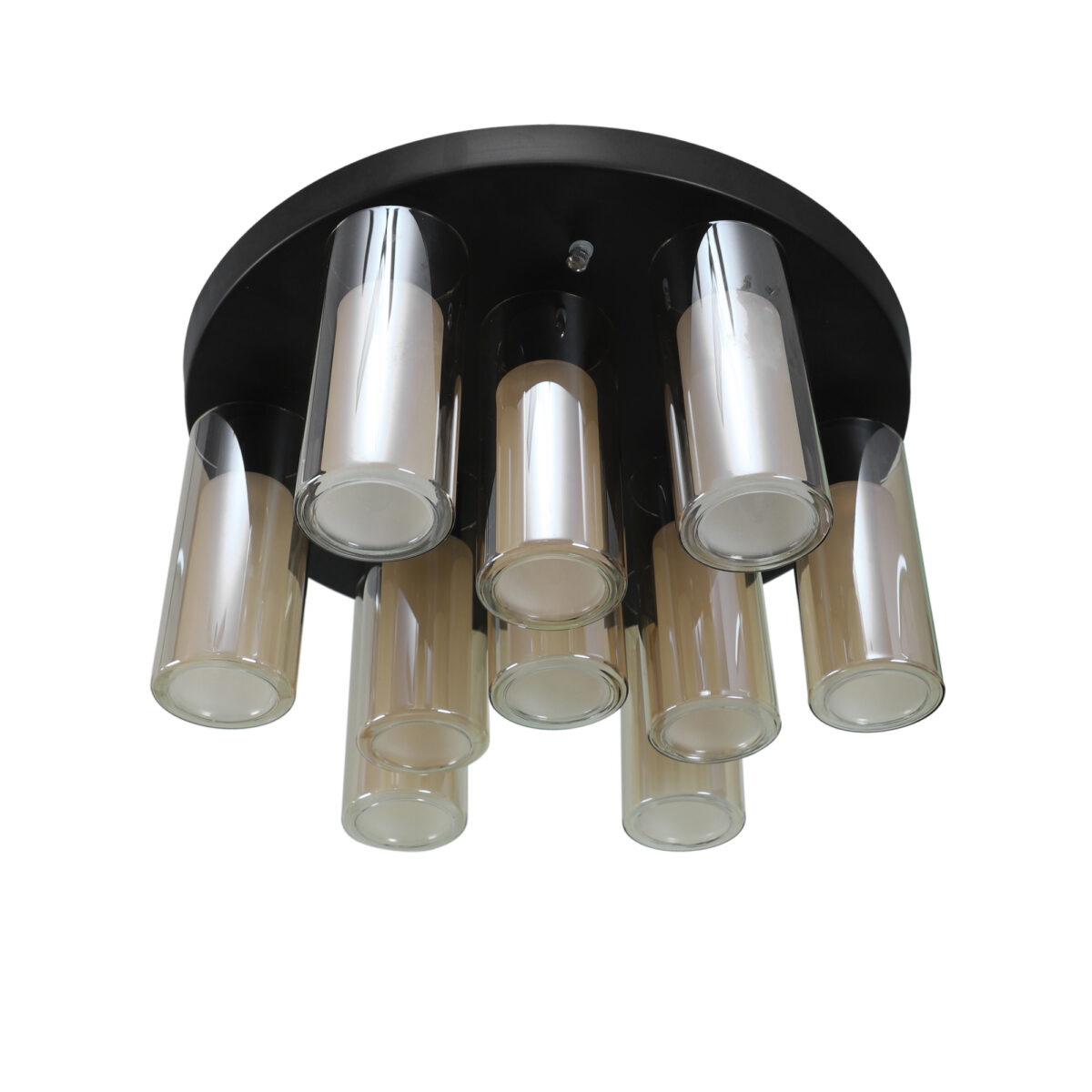 Dark brown (wood) finish, sleek, cylindrical champagne coloured glass mounted on a round plate made of mild steel having ten lights. This is a fixed type chandelier in which the base plate is fixed to the ceiling with the help of straight clamp and screws.It is maintenance free, easy to remove glass and wash them, comes with an E14 holder, only the change of lamp is required, which is available locally everywhere. Application includes both residential and commercial premises wherever it matches with your interiors. Matching chandelier variations – CH353-3, CH353-6. Matching hanging variations – HL3980-1, HL3980-3, HL3980-6, HL3980-10. Matching wall light code WL2211, WL2212. All designs available in silver (chrome) finish also. Can be customized as per requirement in case of bulk quantities.This along with its variants are the best selling products in our catalogue. LAMP NOT INCLUDED.