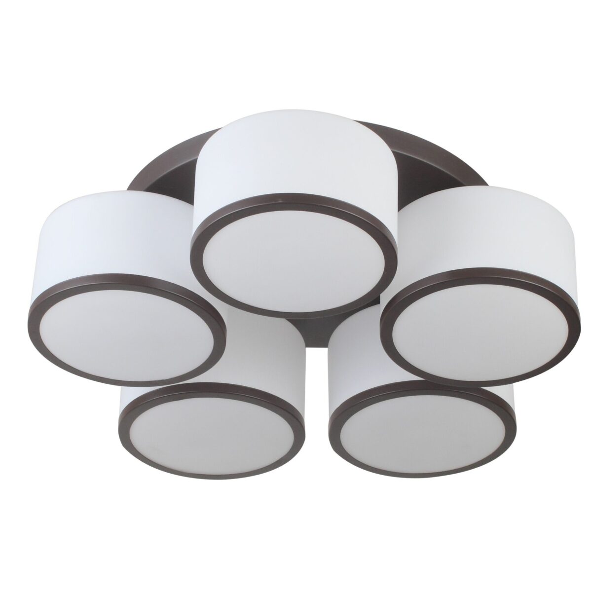 Dark brown (wood) finish, round cylindrical white glass mounted on a round plate made of mild steel having five lights. This is a fixed type chandelier in which the base plate is fixed to the ceiling with the help of straight clamp and screws. It is maintenance free, glasses are closed from all the sides which prevents accumulation of dust and it is easy to remove glass and wash them. Comes with an E27 holder, only the change of lamp is required, which is available locally everywhere. Application includes both residential and commercial premises wherever it matches with your interiors. Matching chandelier variations – CH354-3. Matching hanging variations – HL3983-1. Matching wall light code WL2213, WL2214. Matching ceiling variation – CL428. All designs available in silver (chrome) finish also. Can be customized as per requirement in case of bulk quantities. This along with its variants are the best selling products in our catalogue. LAMP NOT INCLUDED.