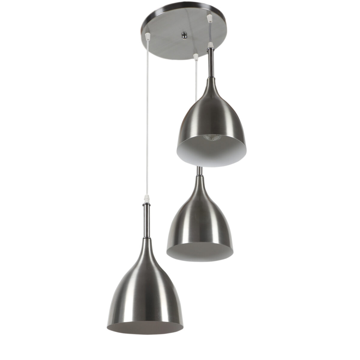 Silver (satin nickel) finish,modern aluminium cluster hanging light having three lamps. The suspension can be adjusted at time of installation to the desired height. It is maintenance free, comes with an E27 holder, only the change of lamp is required, which is available locally everywhere. Application includes both residential and commercial premises wherever it matches with your interiors. Also available in single lamp option with code HL3774. Can be customized as per requirement in case of bulk quantities. Lamp not included.