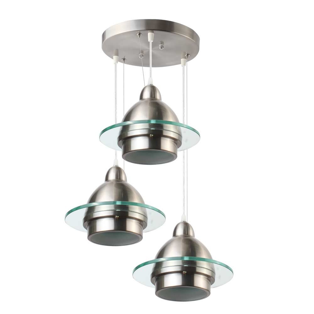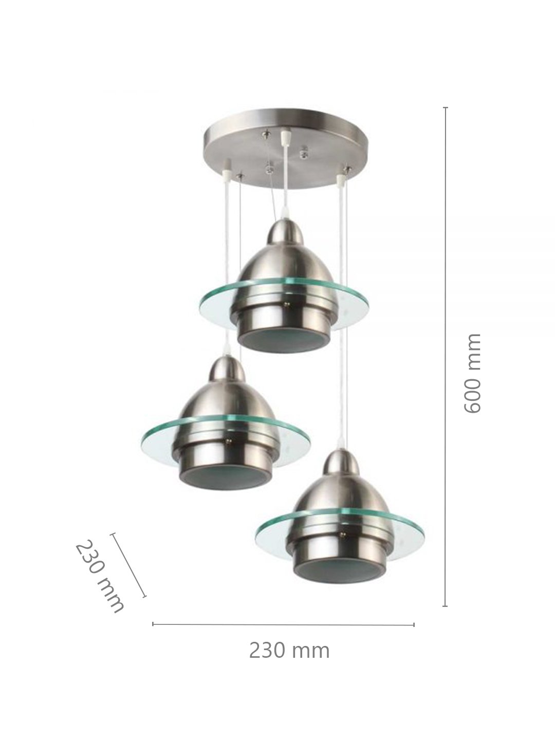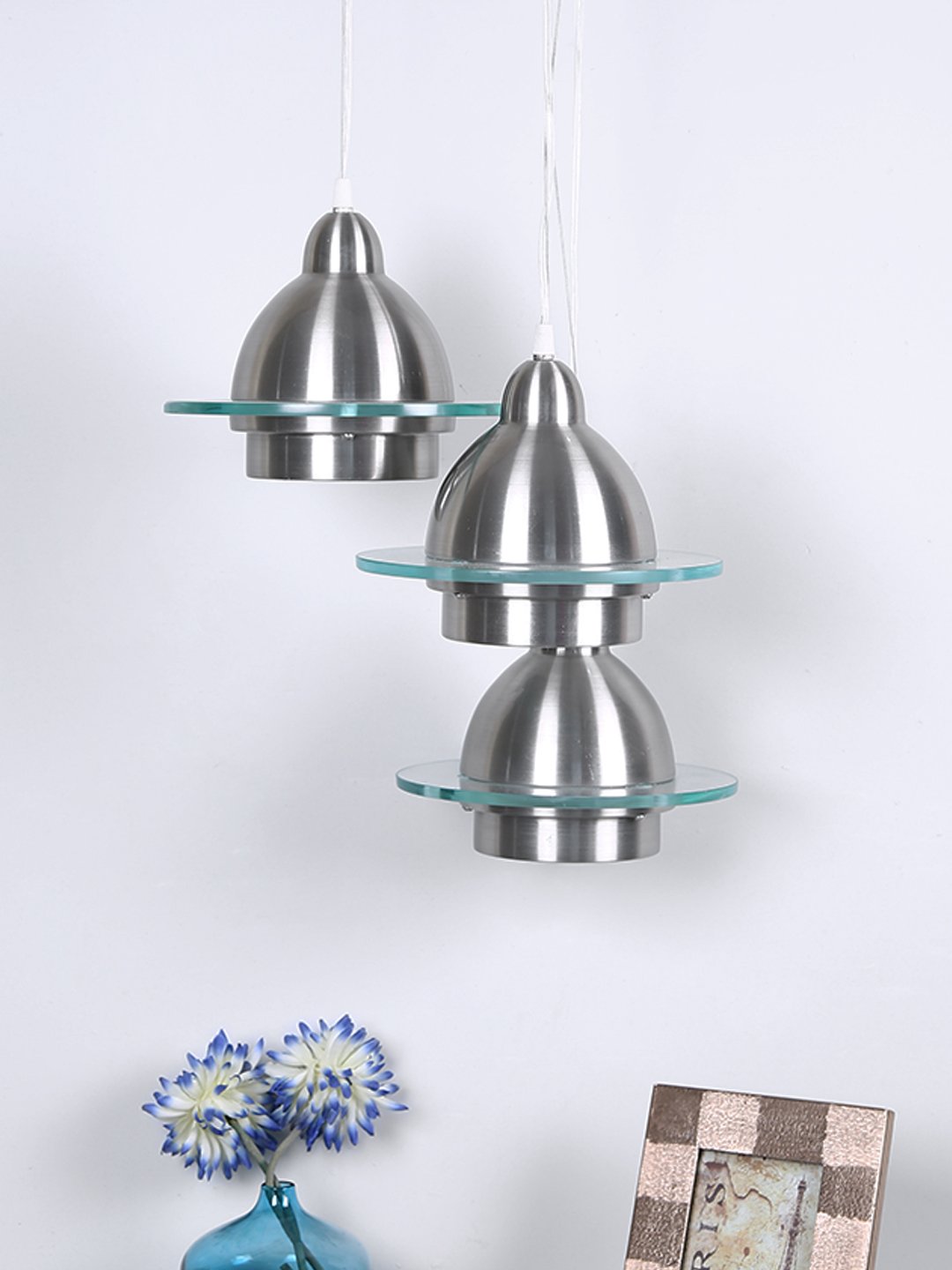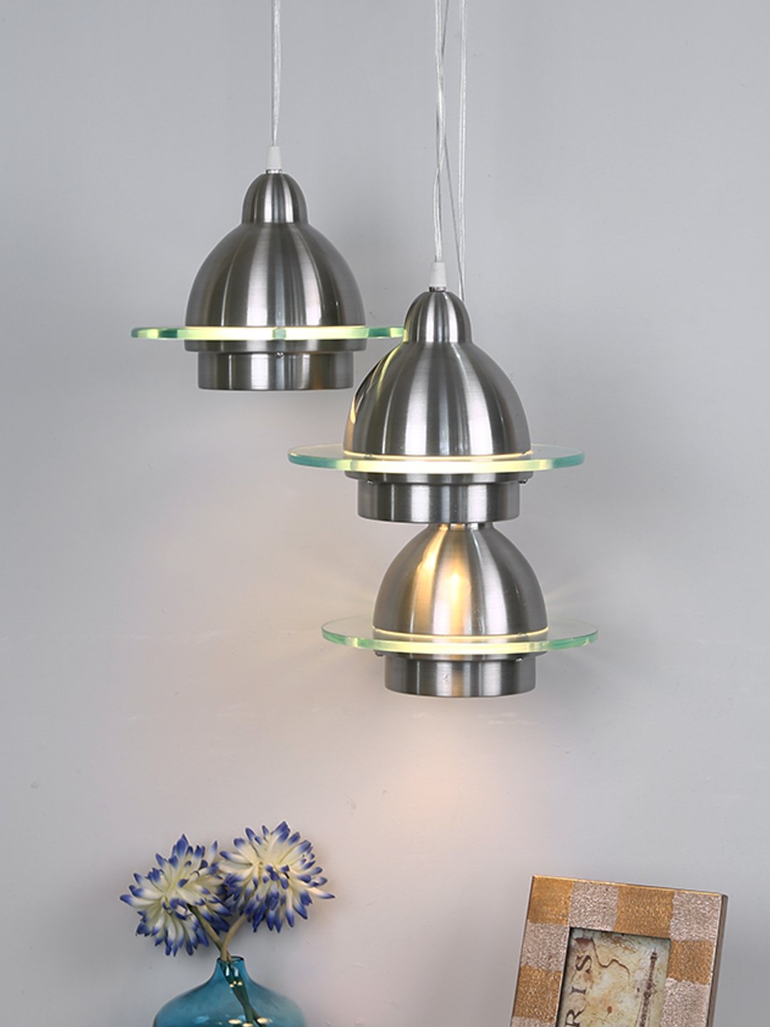 Silver (satin nickel) finish,modern aluminium cluster hanging light having three lamps. The suspension can be adjusted at time of installation to the desired height. It is maintenance free, comes with an E27 holder, only the change of lamp is required, which is available locally everywhere. It is one of the best selling product. Application includes both residential and commercial premises wherever it matches with your interiors. Also available in single lamp option with code HL3546. Can be customized as per requirement in case of bulk quantities. Lamp not included.