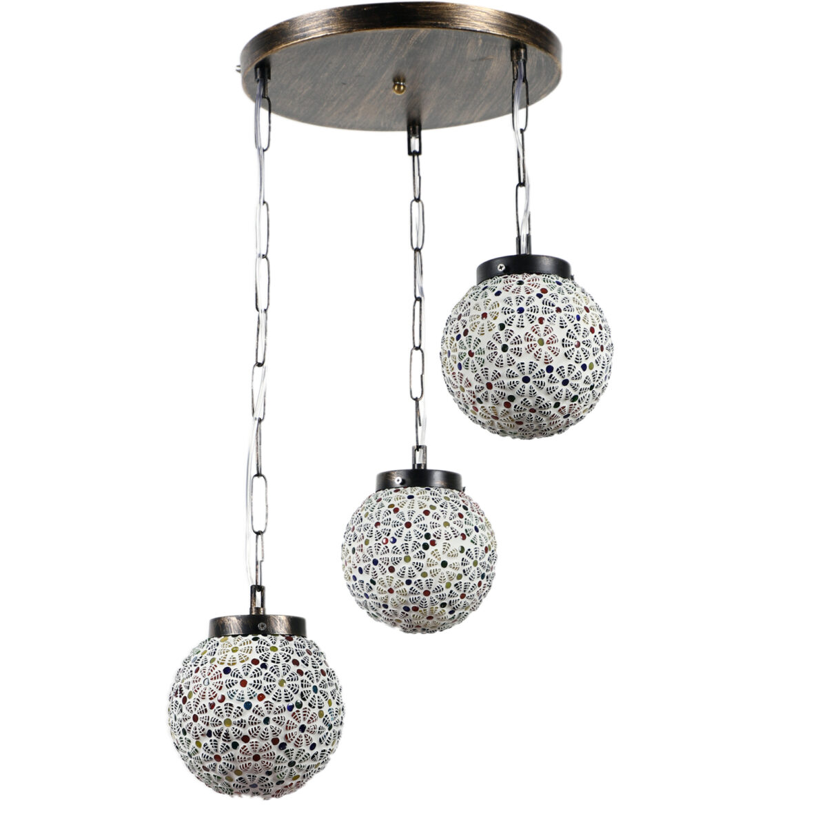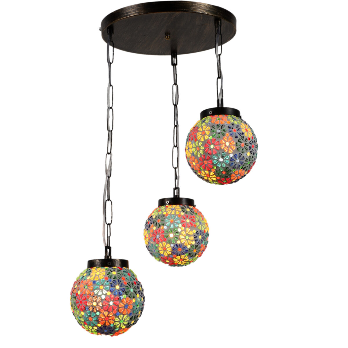 Dark brown (wood) finish, multi colored globe doom glass, cluster hanging light having three lamps made of mild steel and glass. When lit it highlights a colorful geometric / floral design. The suspension can be adjusted at time of installation to the desired height. It is maintenance free, easy to remove glass and wash them, comes with an E27 holder, only the change of lamp is required, which is available locally everywhere. Application includes both residential and commercial premises wherever it matches with your interiors. Also available in single lamp option with code HL3845, HL3844. Can be customized as per requirement in case of bulk quantities. Lamp not included.