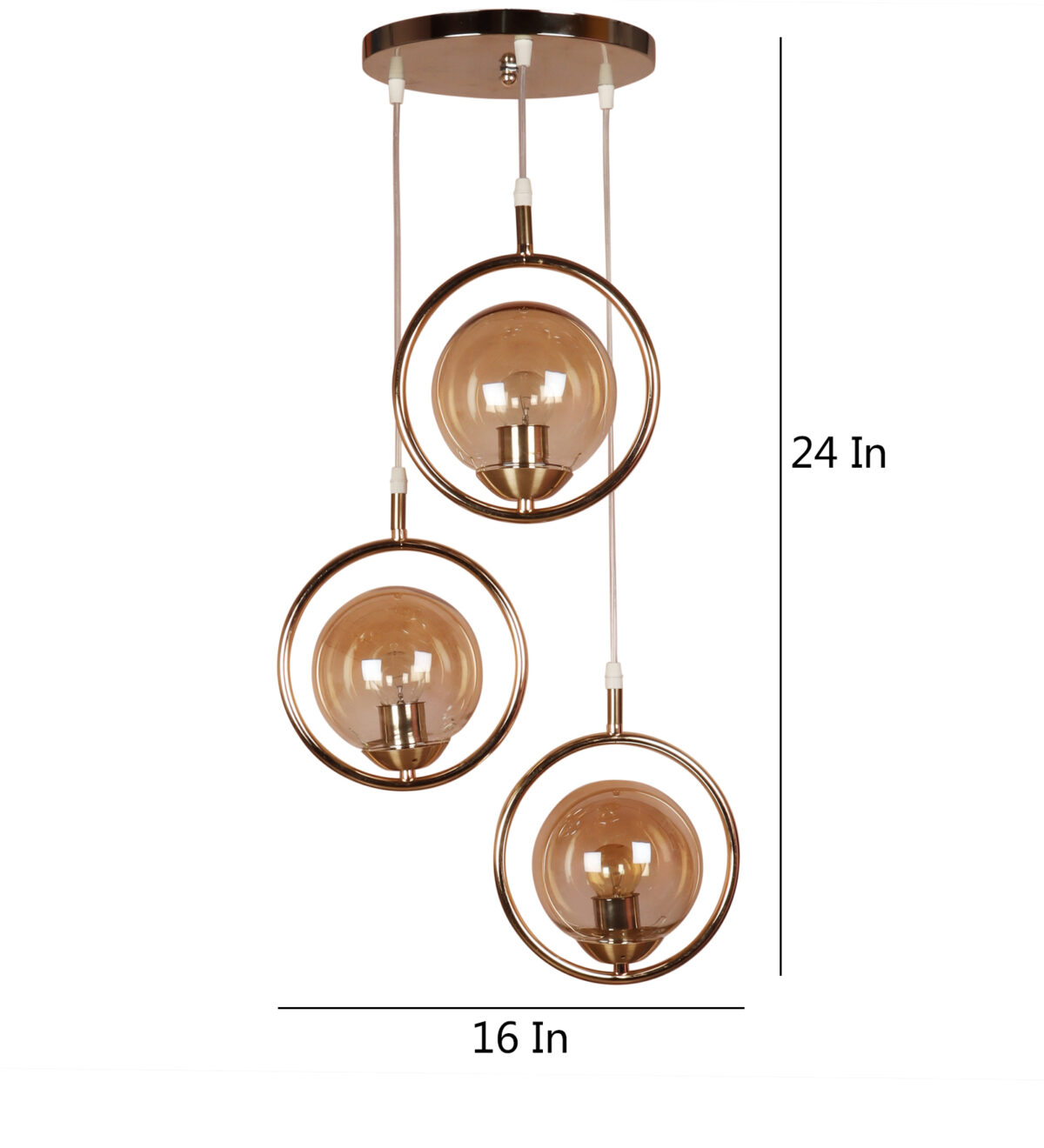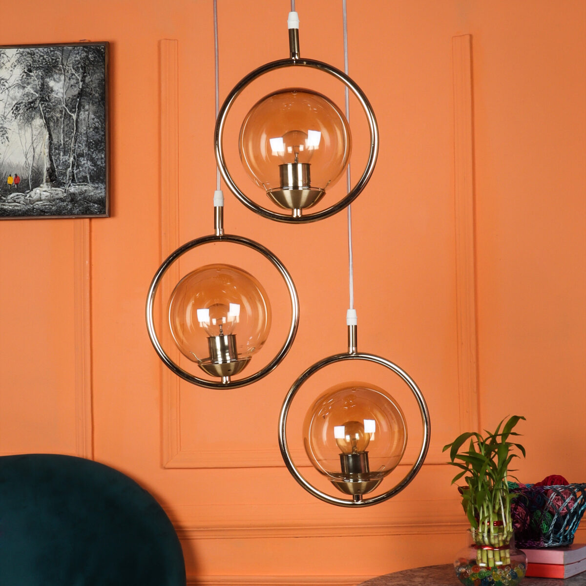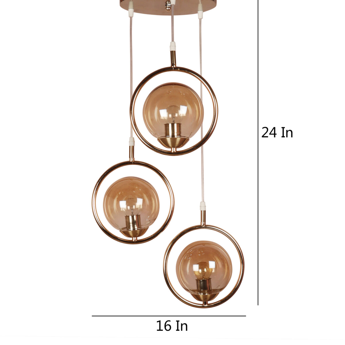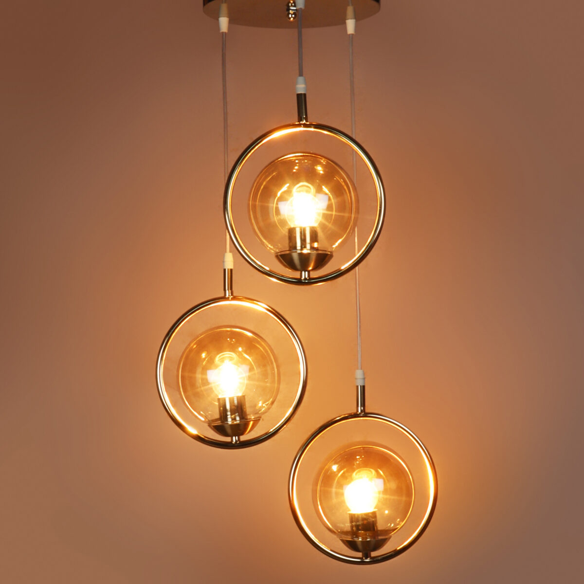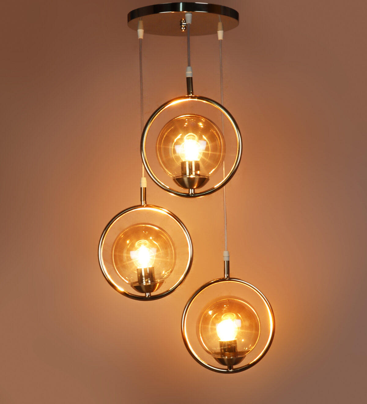 Gold modern, mild steel triple hanging light in campaign glass. The suspension can be adjusted at time of installation to the desired height. It is maintenance free, comes with an E27 holder, only the change of lamp is required, which is available locally everywhere. LED filament lamp is recommended to enhance its beauty. Matching single hanging code – HL6075-1. Application includes both residential and commercial premises wherever it matches with your interiors. Can be customized as per requirement in case of bulk quantities. LAMP NOT INCLUDED.