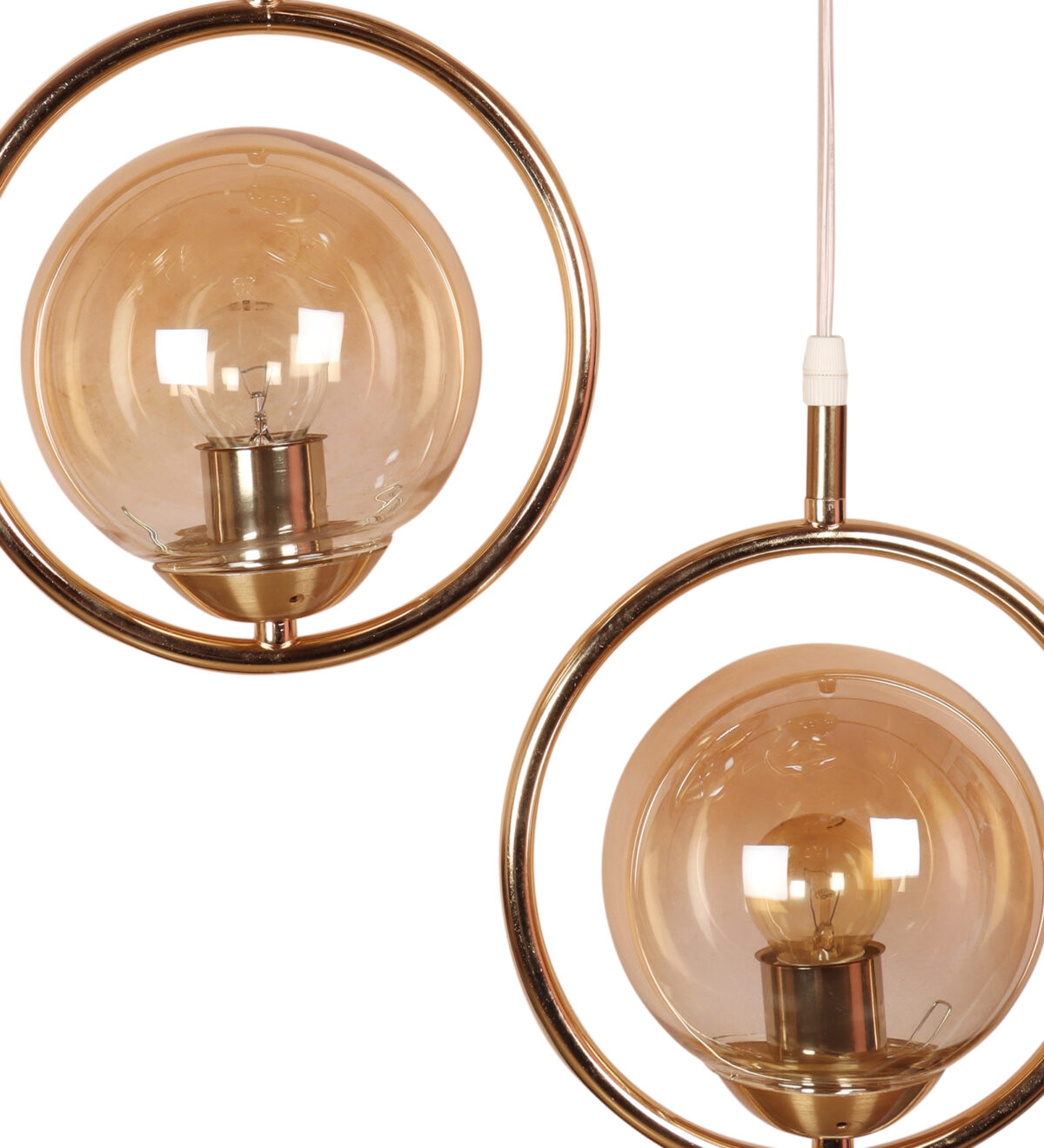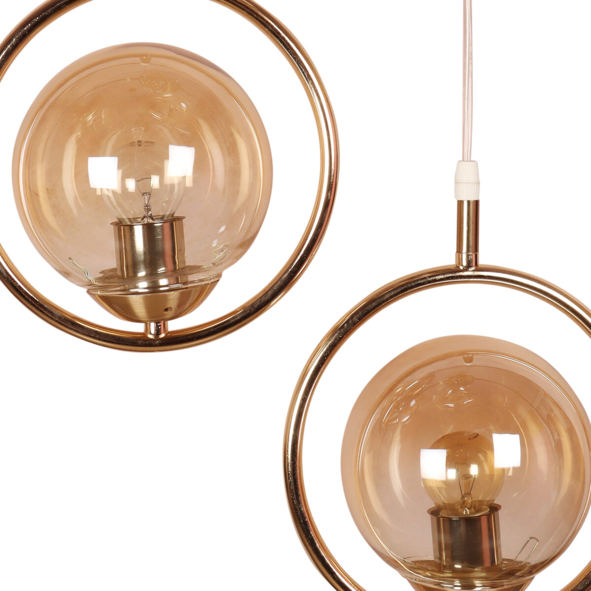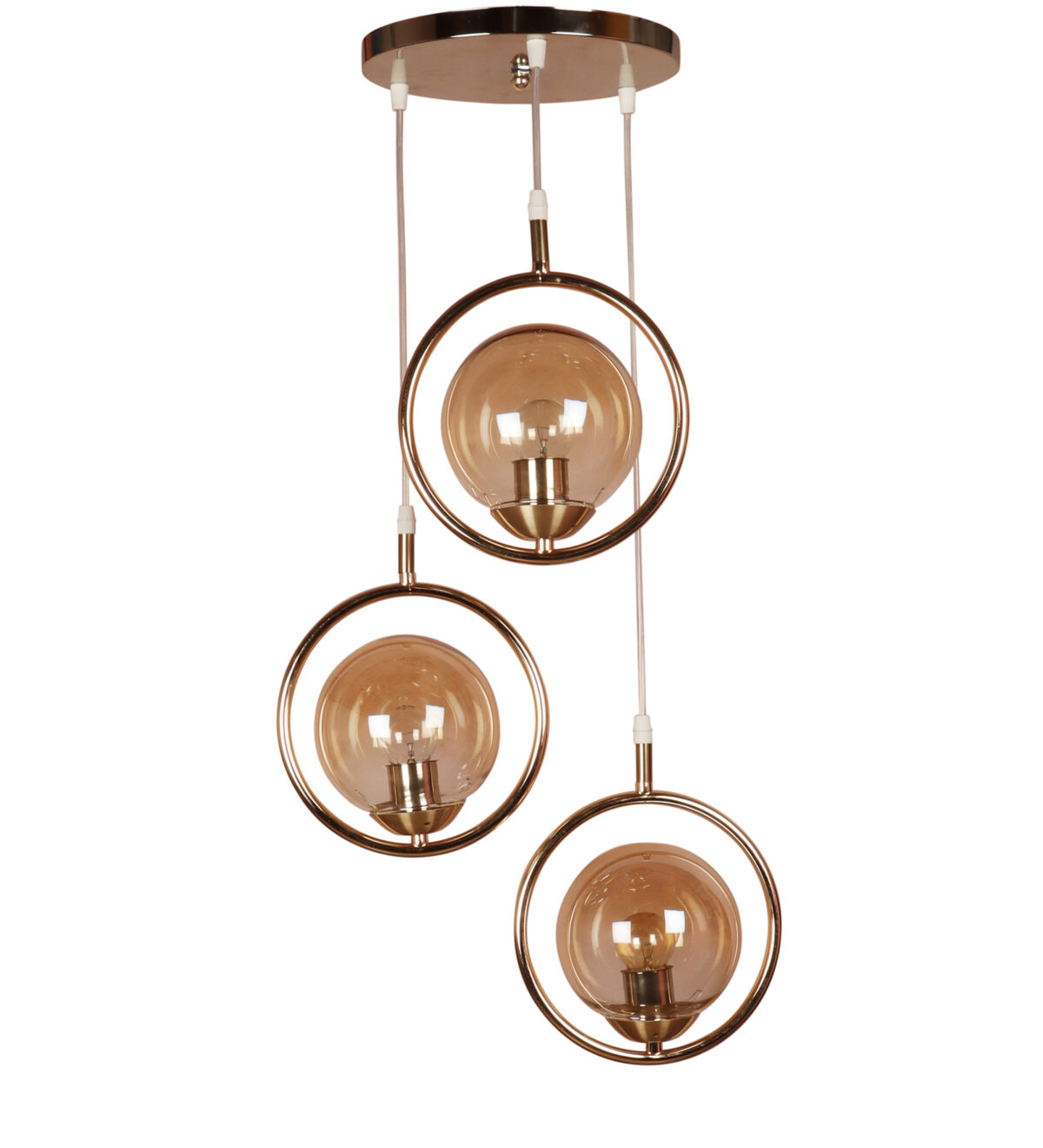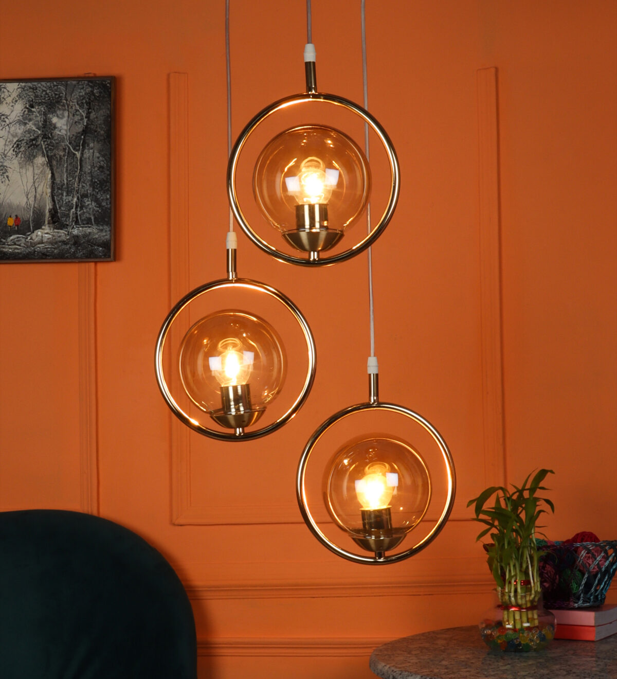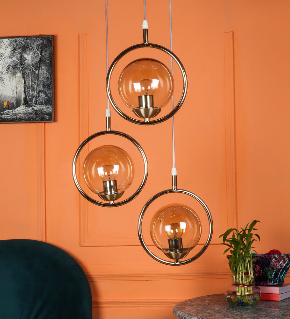 Gold modern, mild steel triple hanging light in campaign glass. The suspension can be adjusted at time of installation to the desired height. It is maintenance free, comes with an E27 holder, only the change of lamp is required, which is available locally everywhere. LED filament lamp is recommended to enhance its beauty. Matching single hanging code – HL6075-1. Application includes both residential and commercial premises wherever it matches with your interiors. Can be customized as per requirement in case of bulk quantities. LAMP NOT INCLUDED.