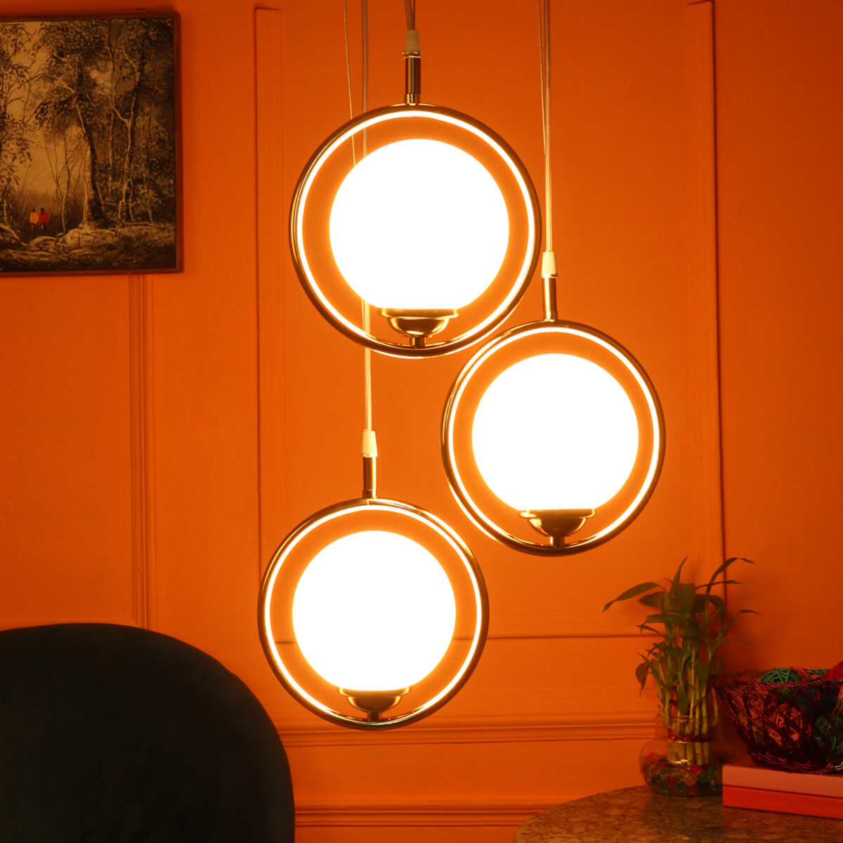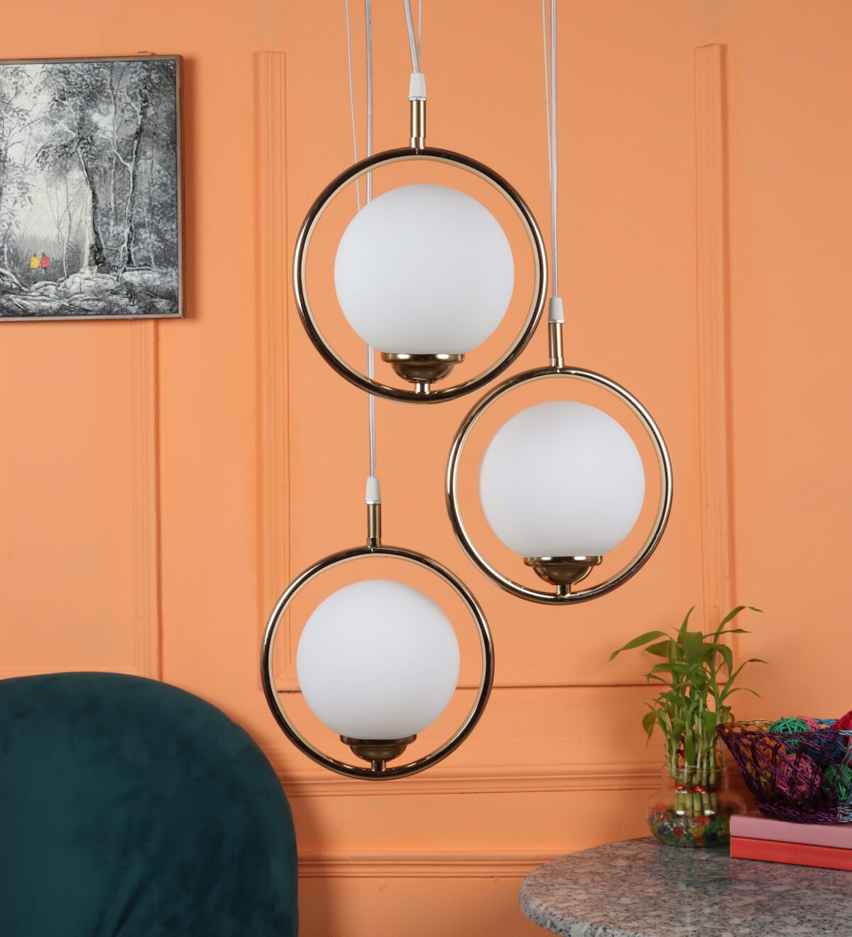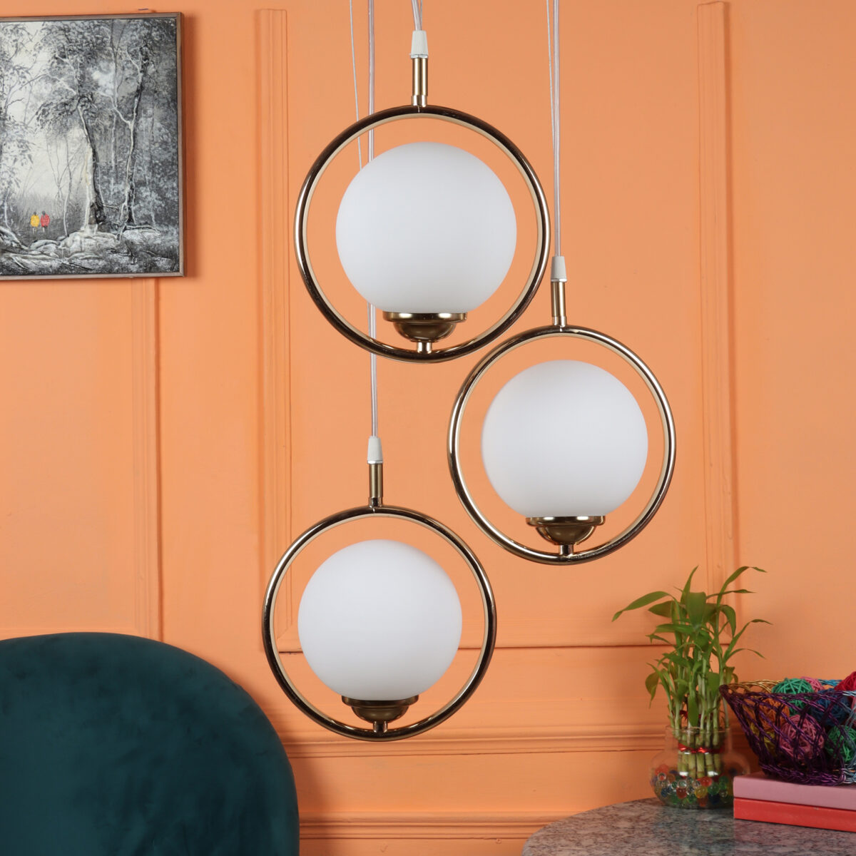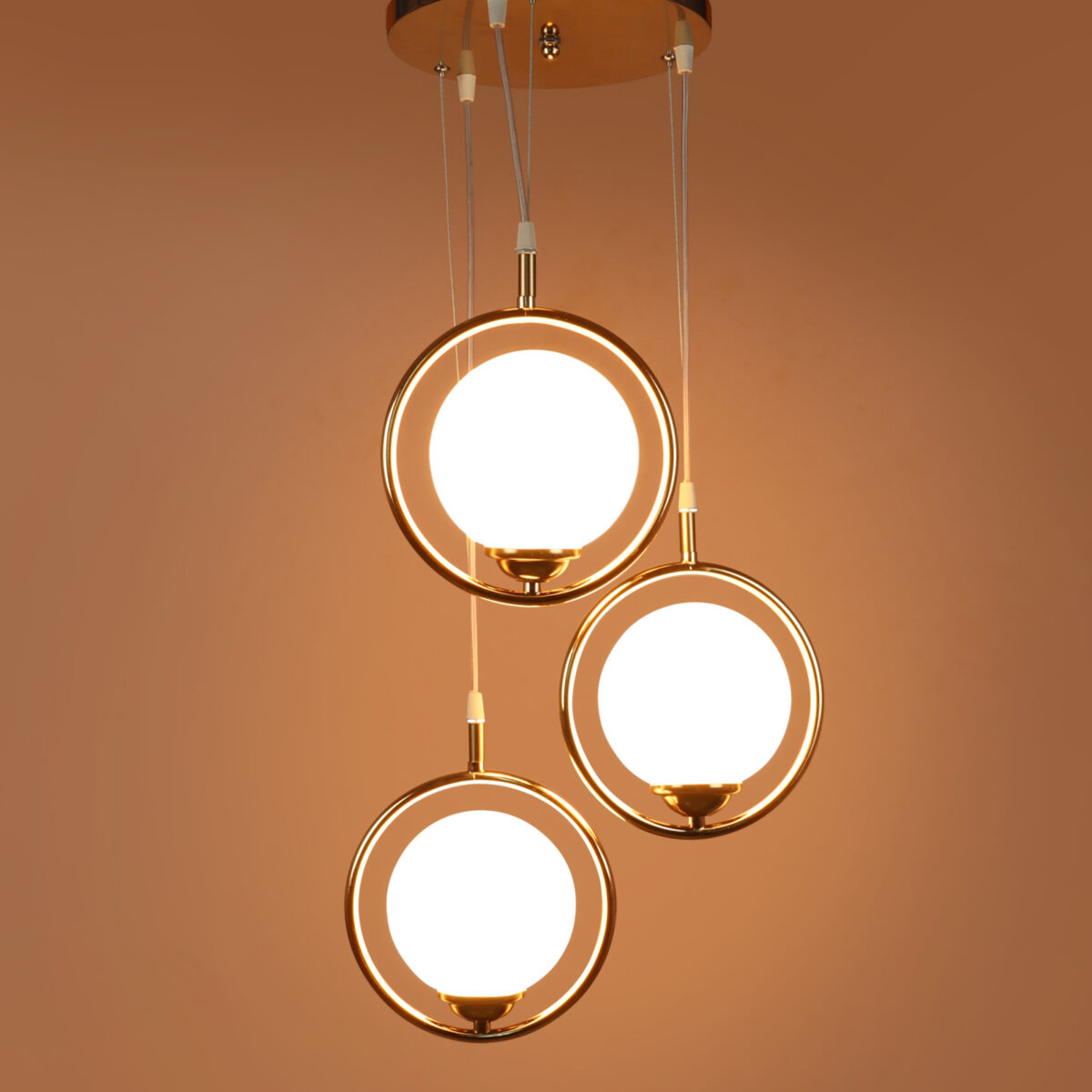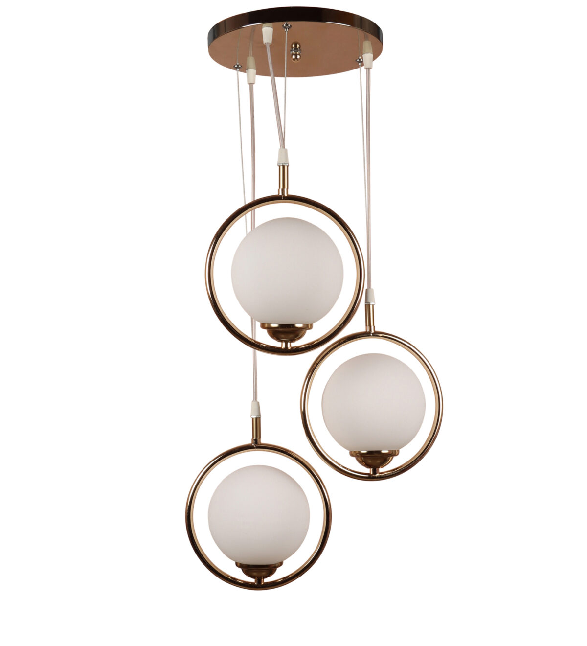 Gold modern mild steel triple hanging light in white doom glass. The suspension can be adjusted at time of installation to the desired height. It is maintenance free, comes with an E27 holder, only the change of lamp is required, which is available locally everywhere. Matching single hanging code – HL6077-1. Application includes both residential and commercial premises wherever it matches with your interiors. Can be customized as per requirement in case of bulk quantities. Lamp not included.