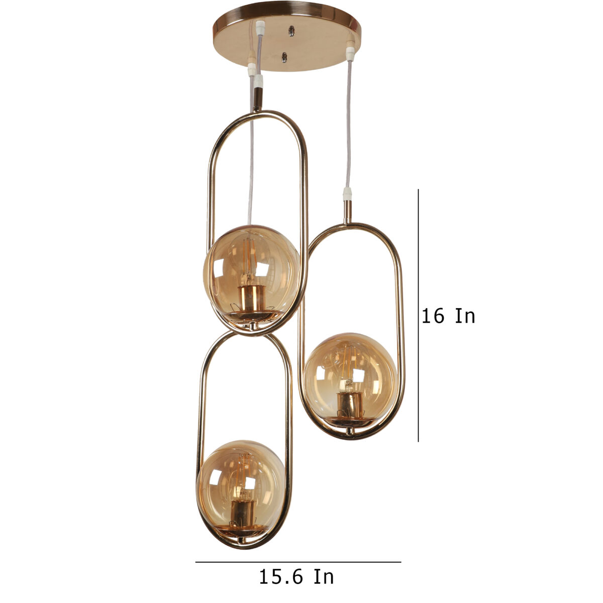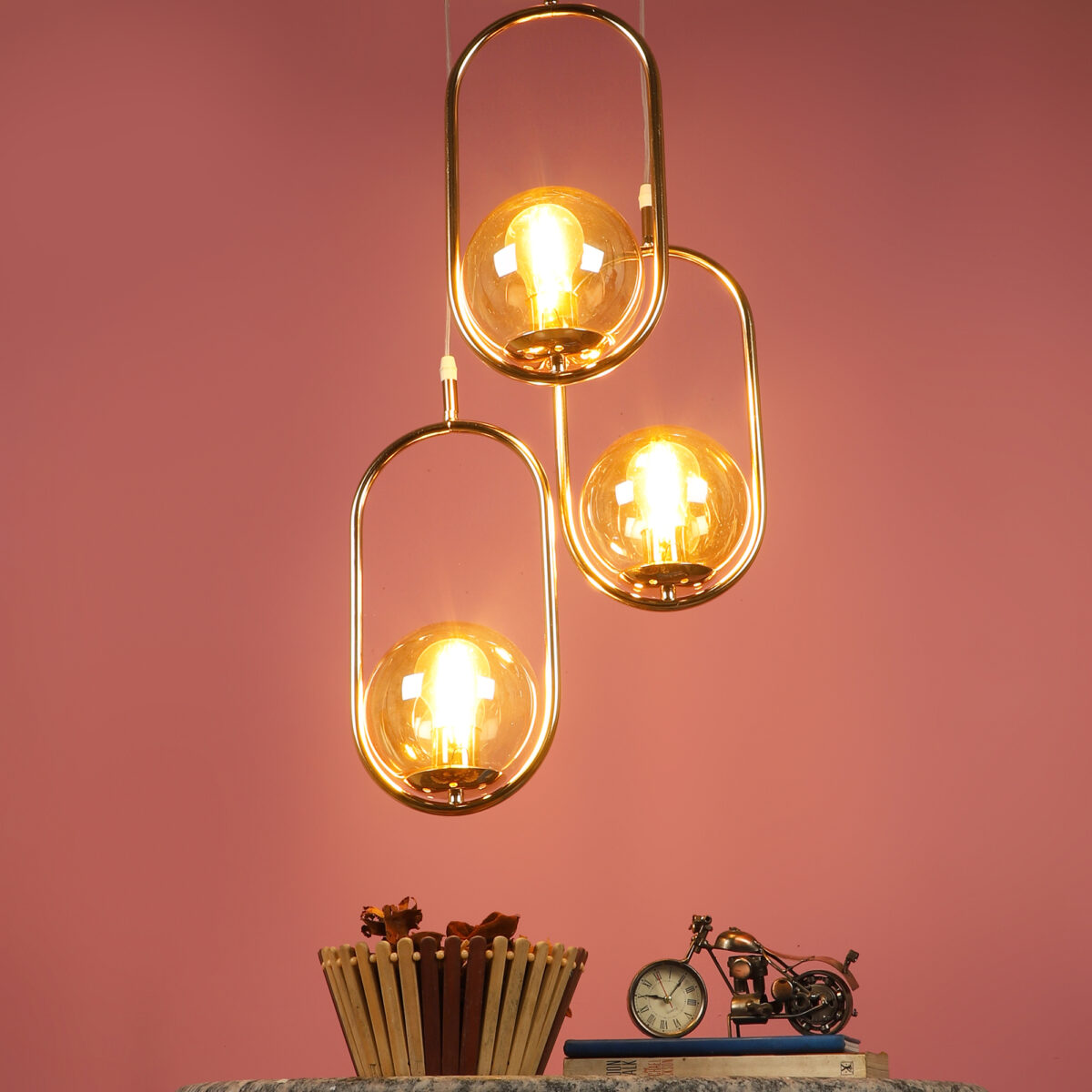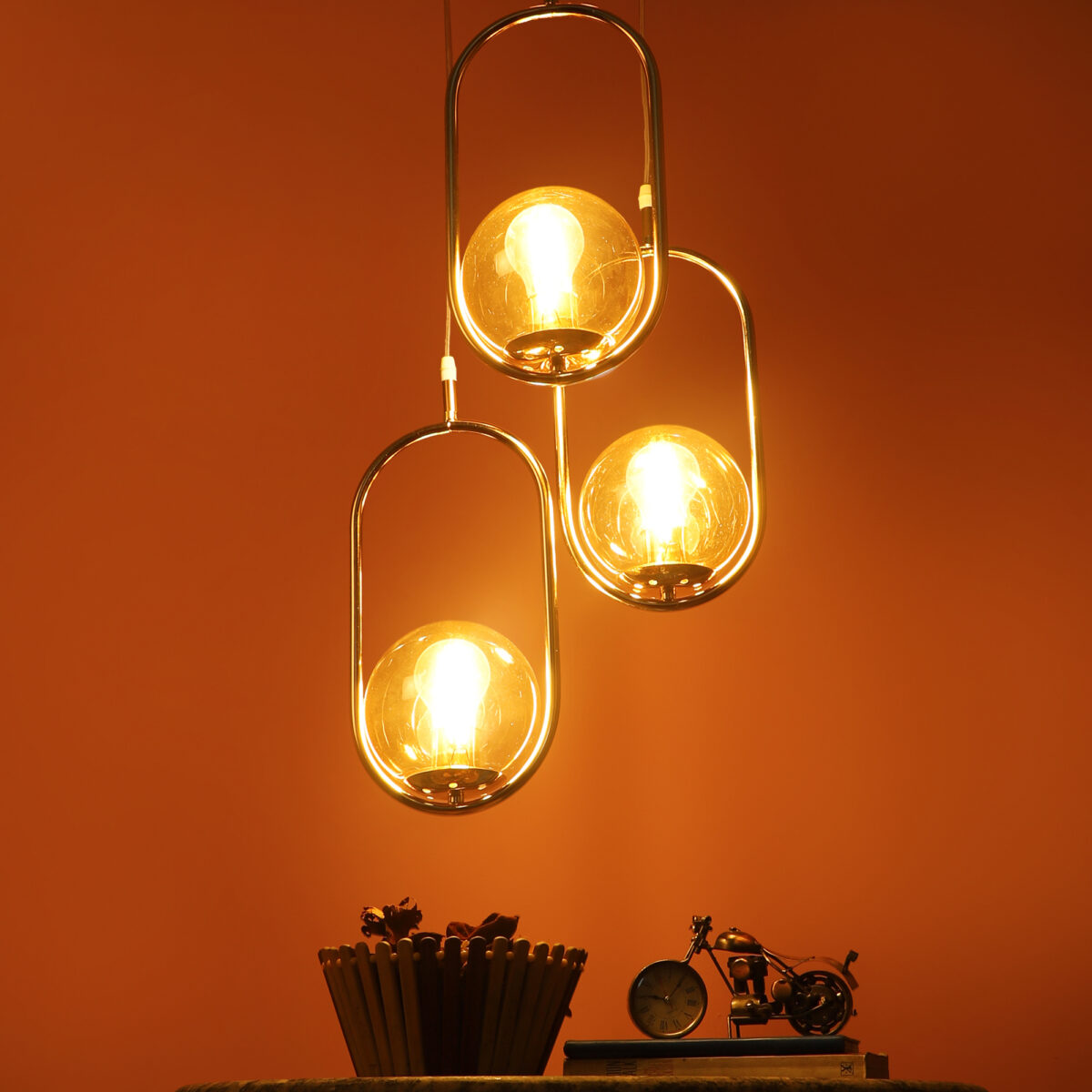 Gold modern mild steel triple hanging light in champaign coloured doom glass. The suspension can be adjusted at time of installation to the desired height. It is maintenance free, comes with an E27 holder, only the change of lamp is required, which is available locally everywhere. Application includes both residential and commercial premises wherever it matches with your interiors. Can be customized as per requirement in case of bulk quantities. Lamp not included.