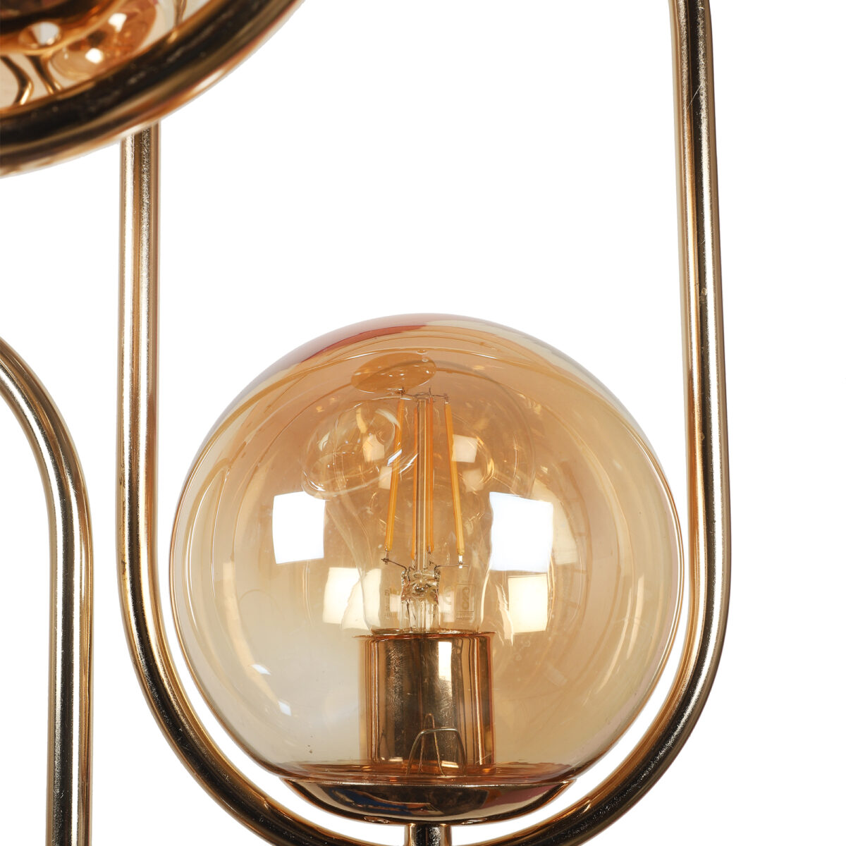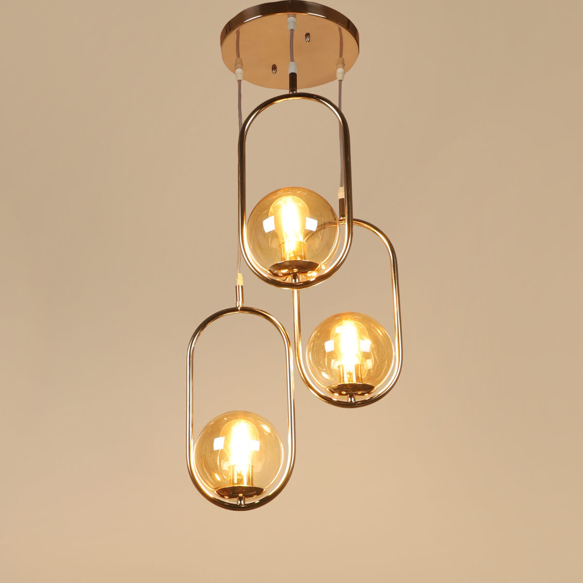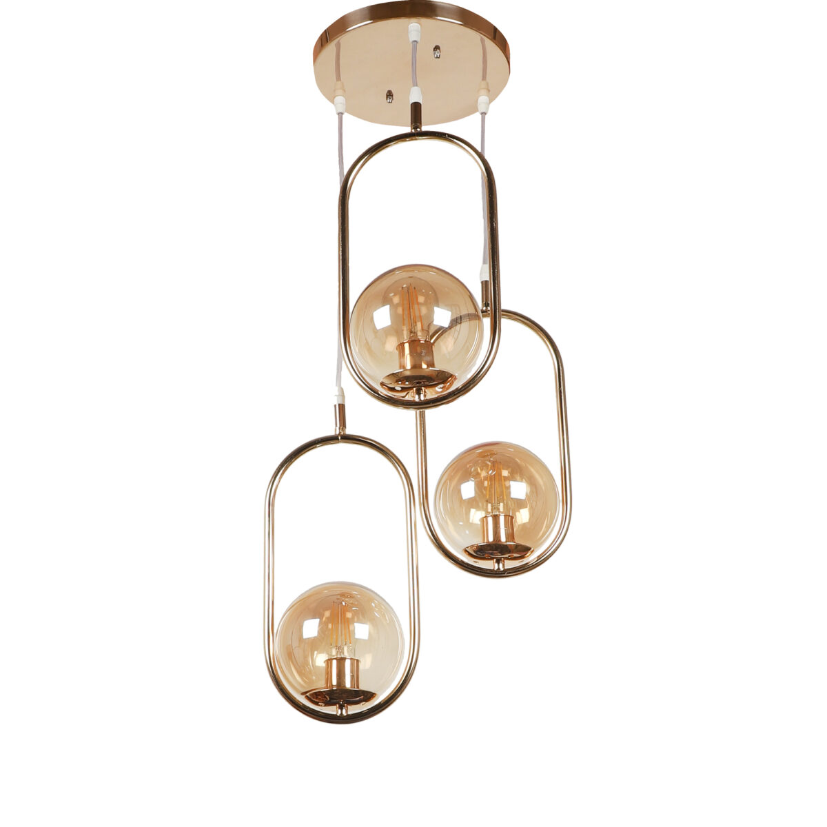 Gold modern mild steel triple hanging light in champaign coloured doom glass. The suspension can be adjusted at time of installation to the desired height. It is maintenance free, comes with an E27 holder, only the change of lamp is required, which is available locally everywhere. Application includes both residential and commercial premises wherever it matches with your interiors. Can be customized as per requirement in case of bulk quantities. Lamp not included.