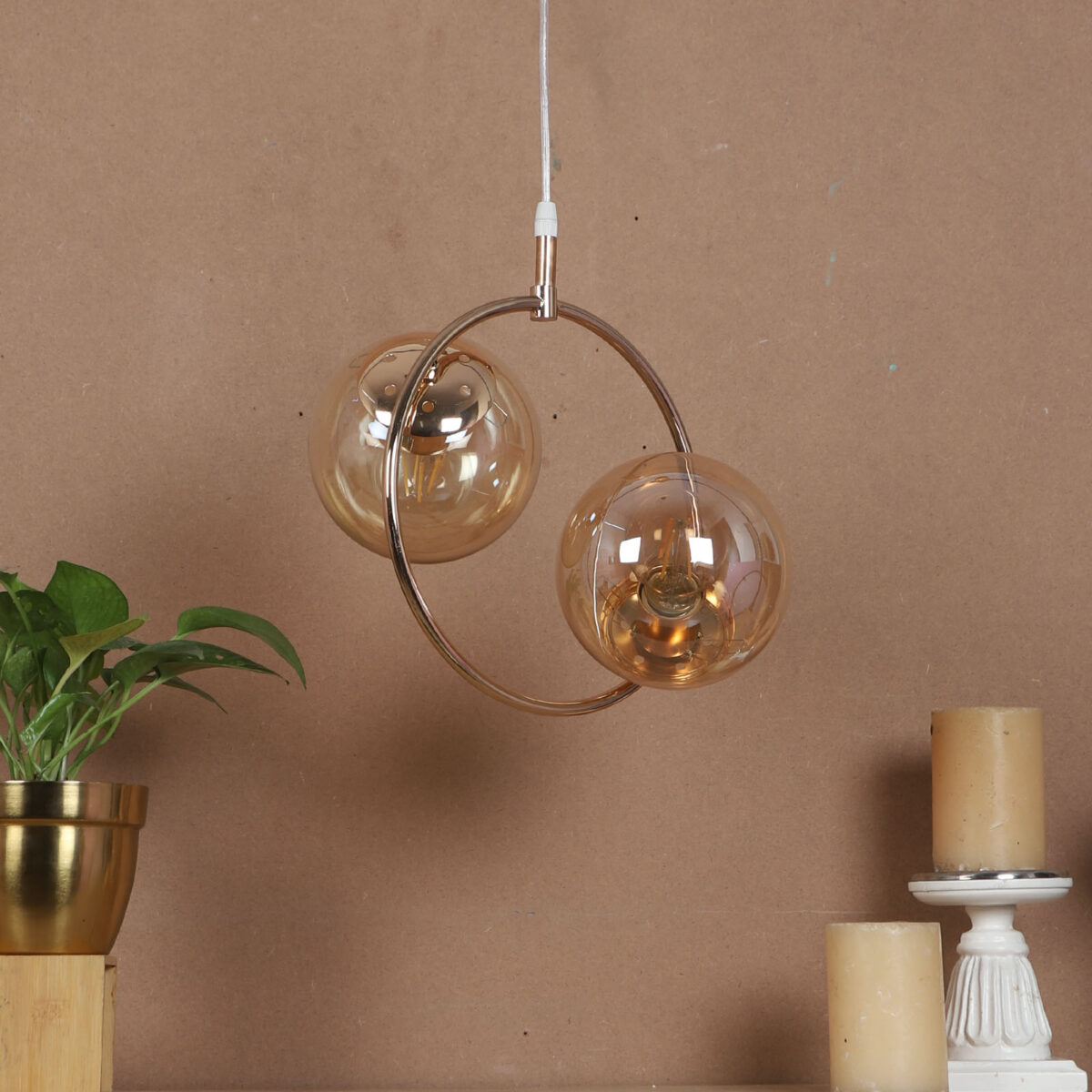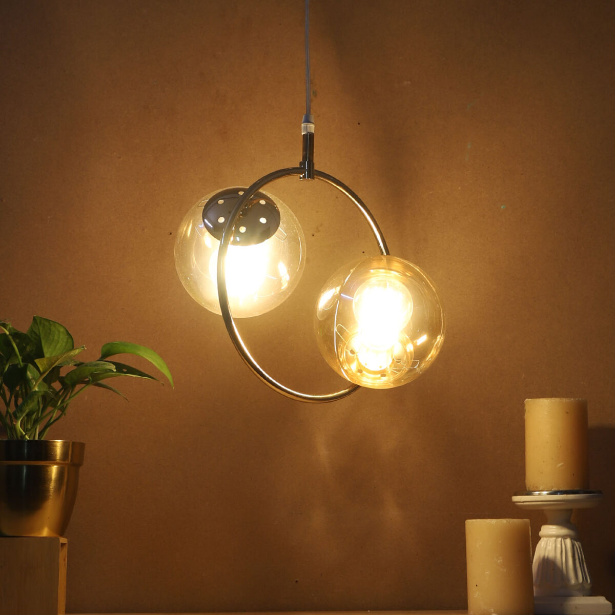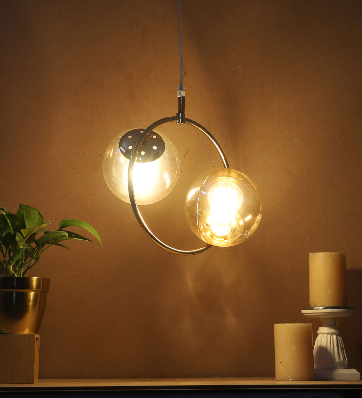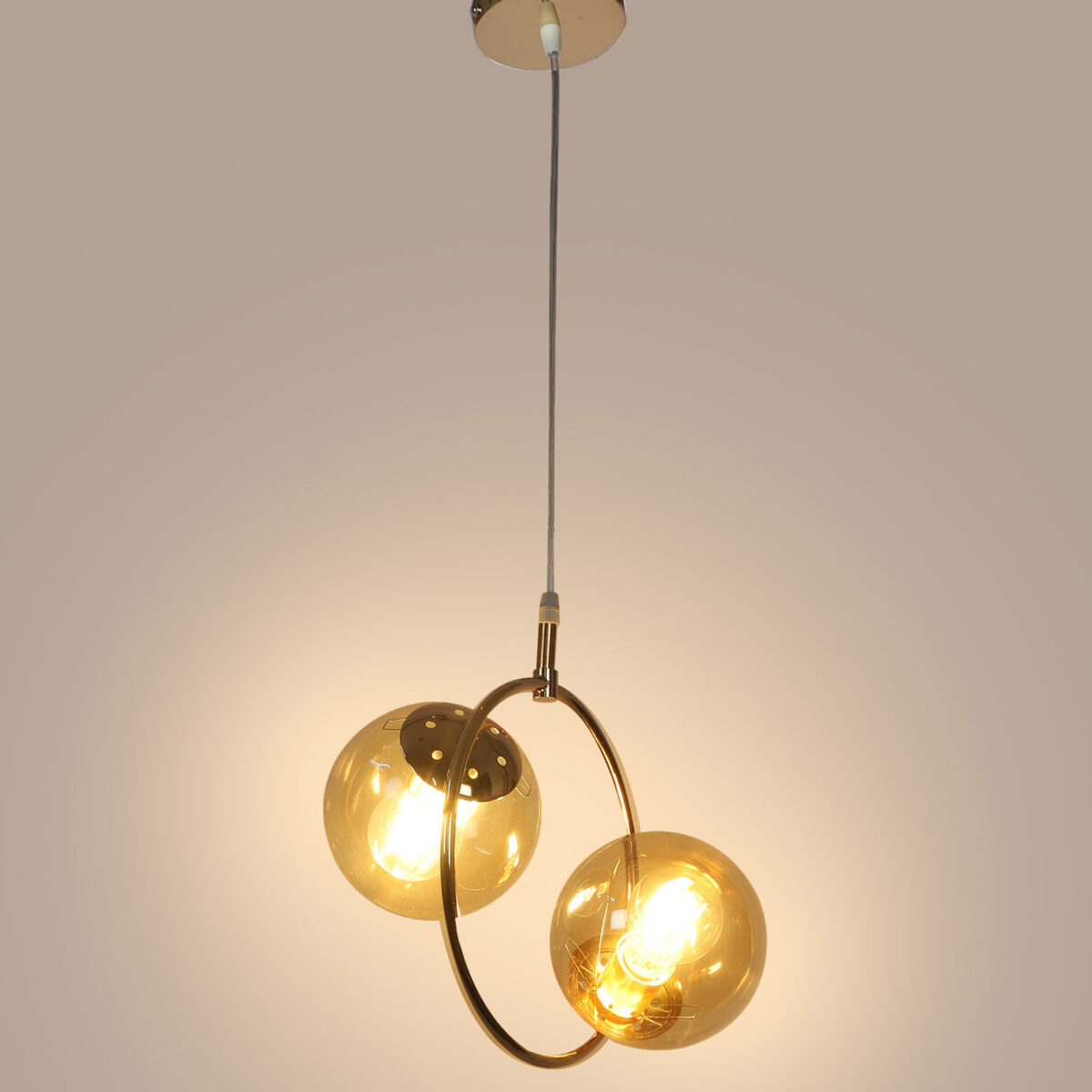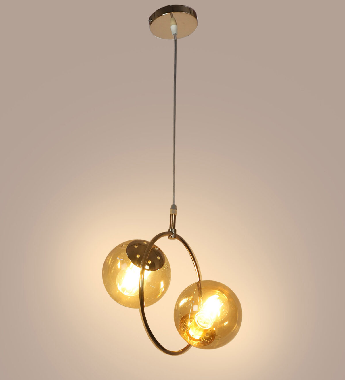 Golden modern hanging light having two lights in champaign coloured doom glass. The suspension can be adjusted at time of installation to the desired height. Looks amazing with LED filament lamp. Can be customized as per requirement. LAMP NOT INCLUDED.
