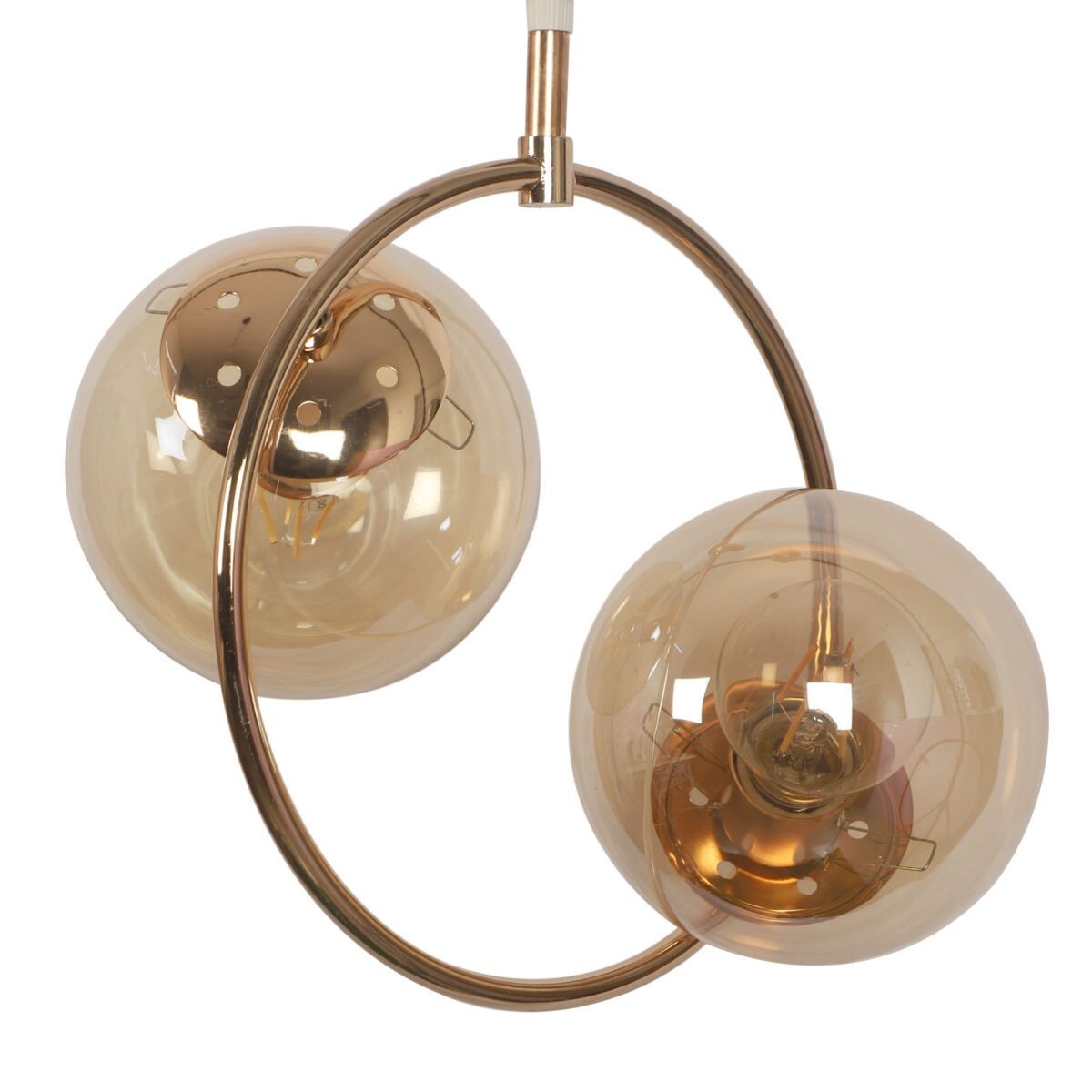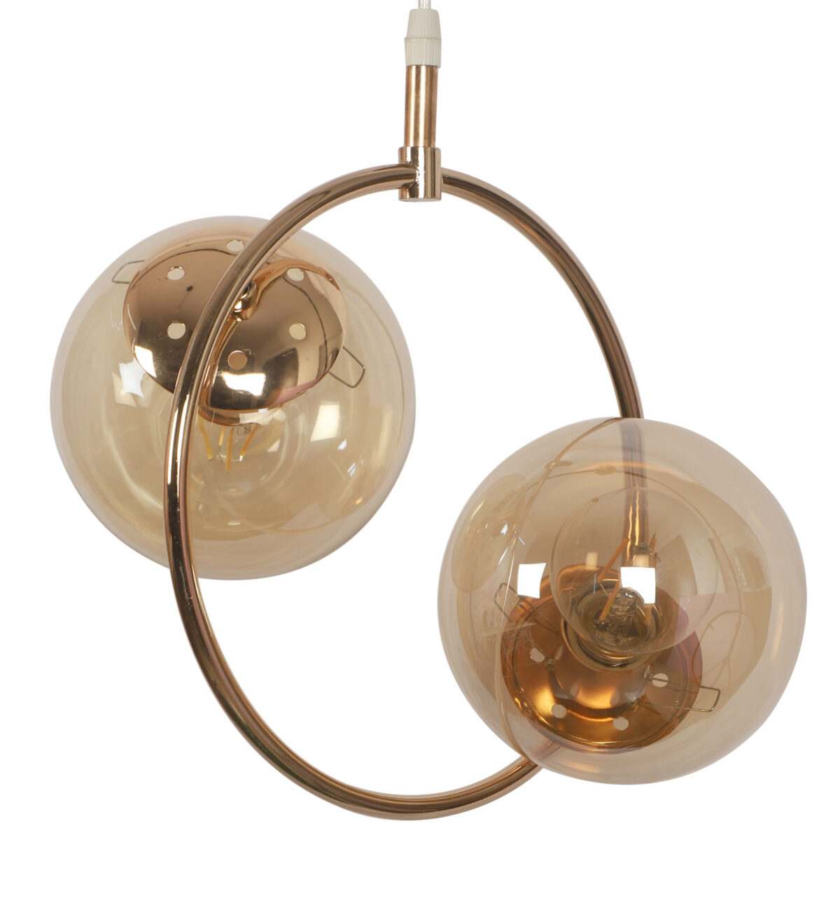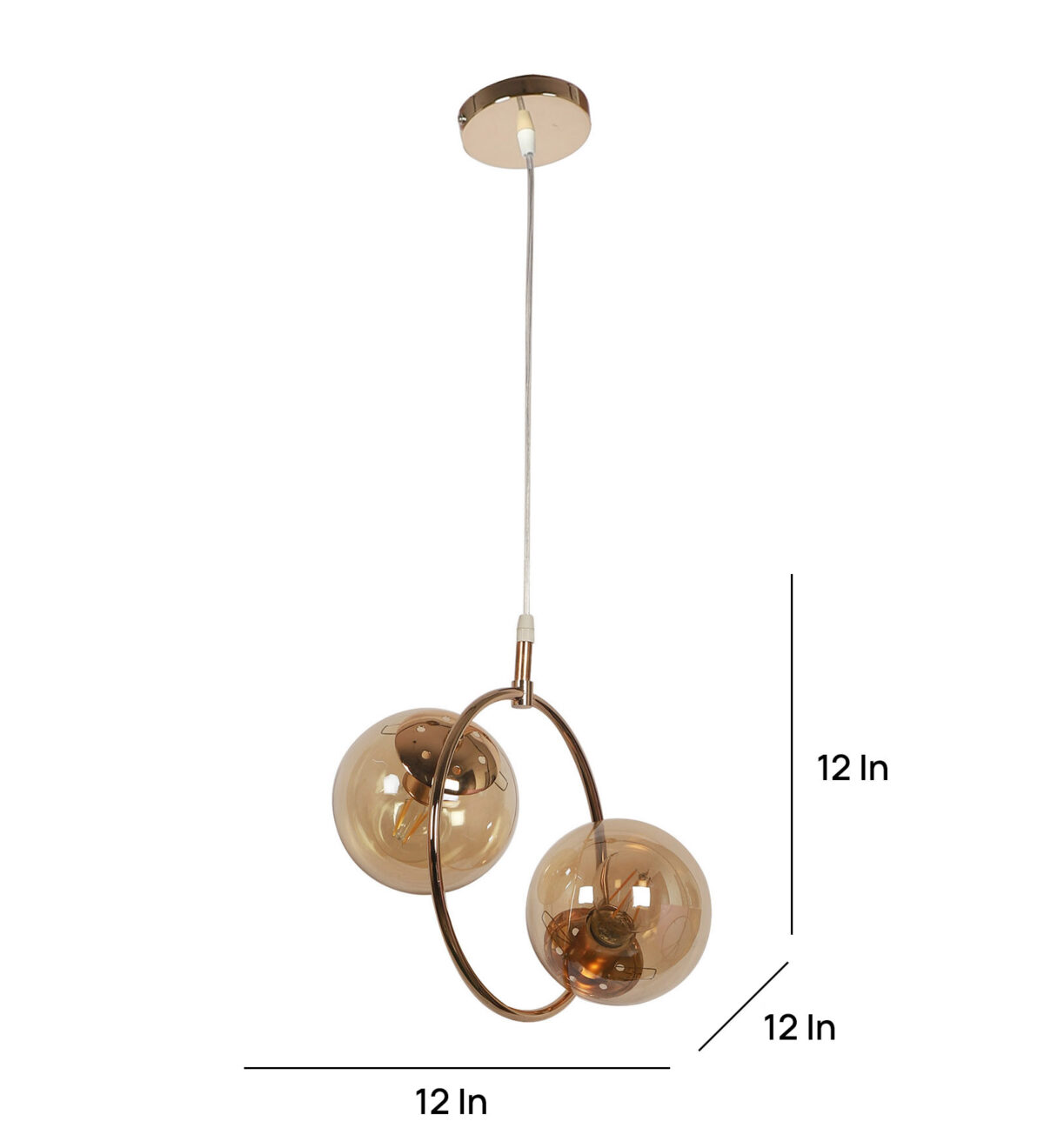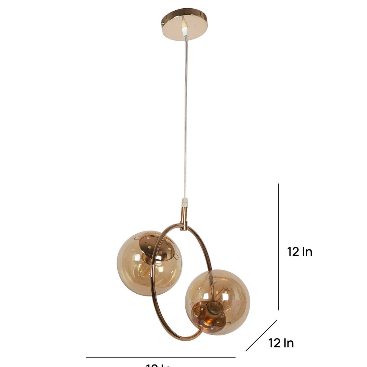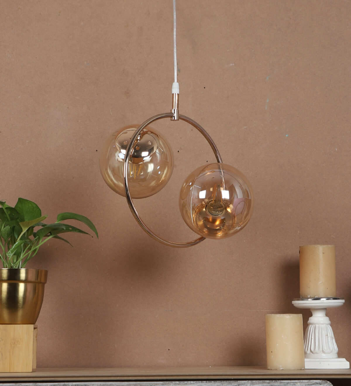 Golden modern hanging light having two lights in champaign coloured doom glass. The suspension can be adjusted at time of installation to the desired height. Looks amazing with LED filament lamp. Can be customized as per requirement. LAMP NOT INCLUDED.
