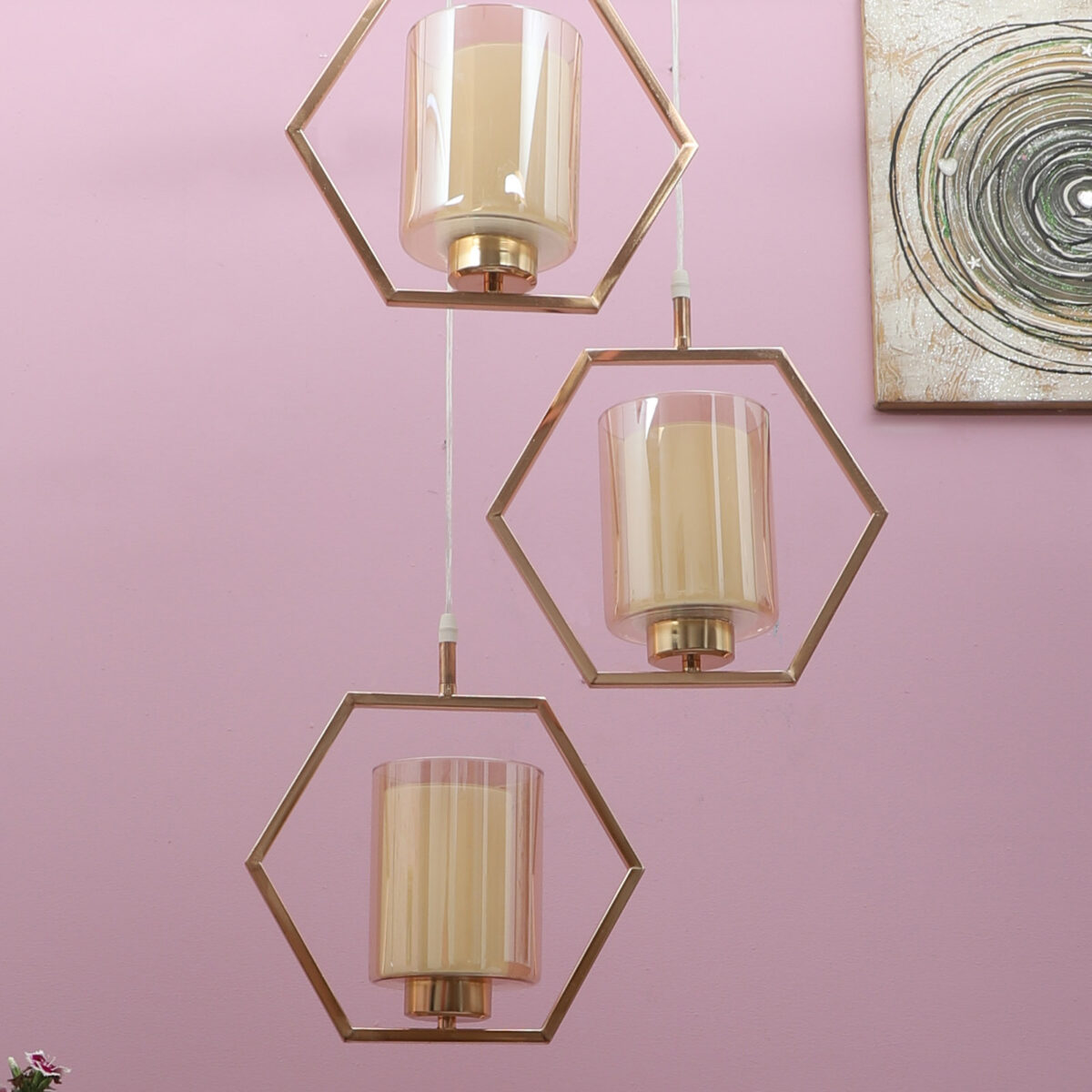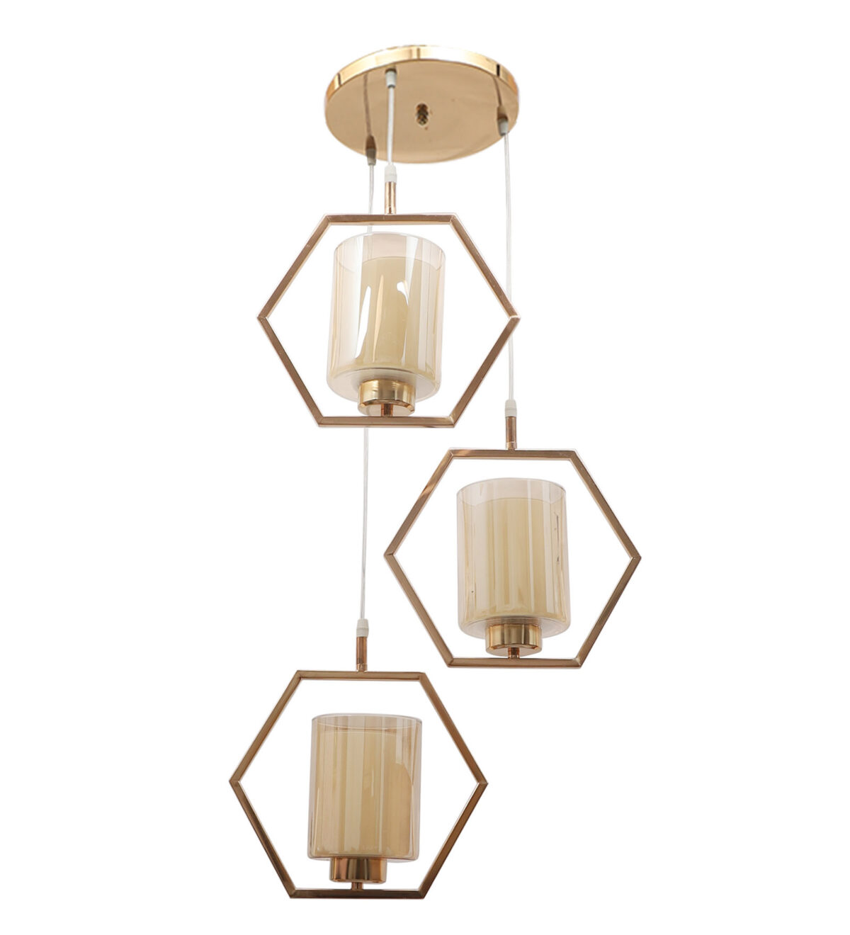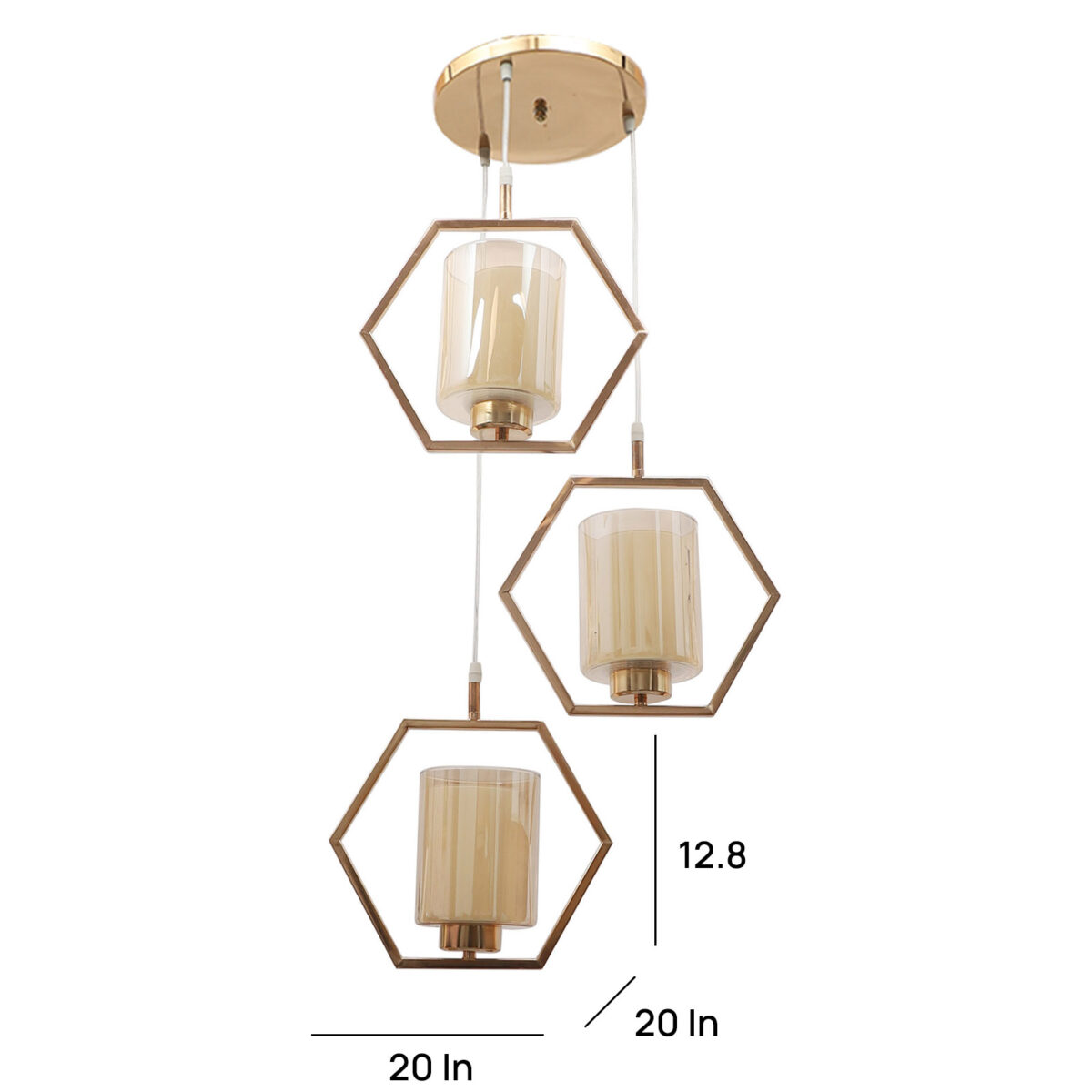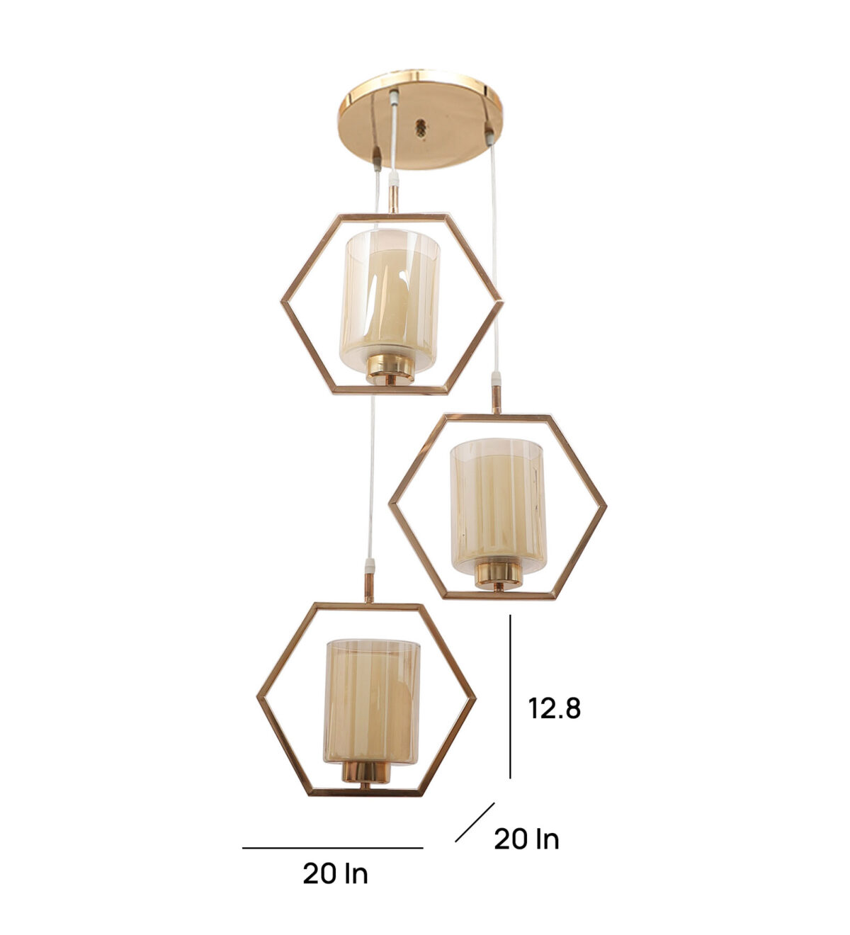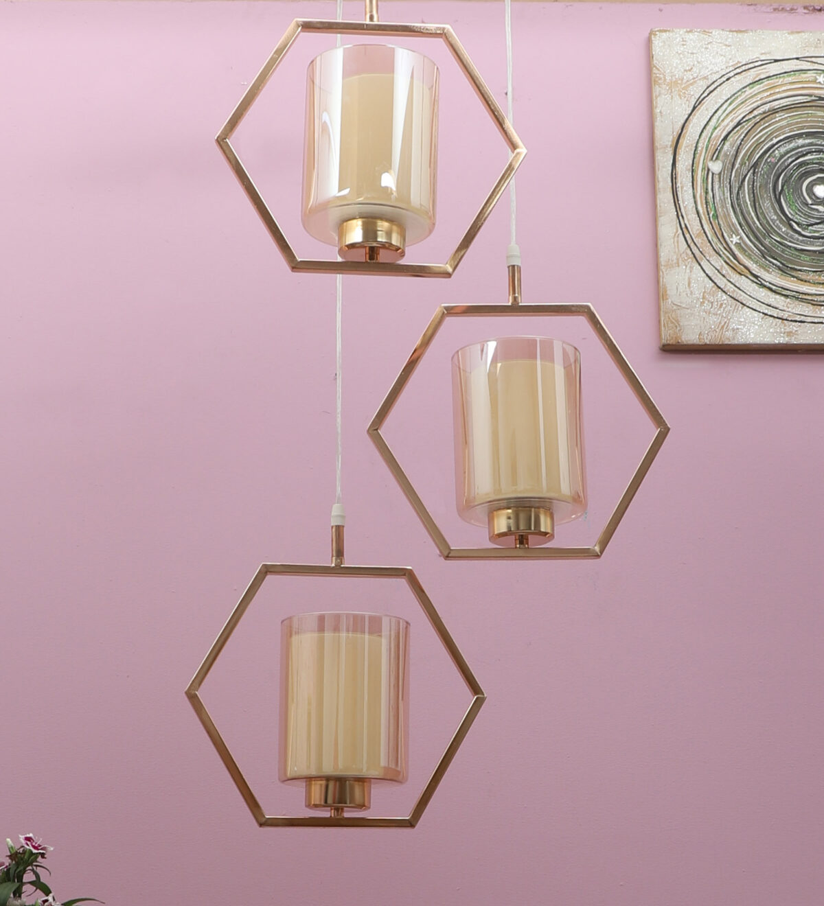Antique finish modern hanging light having three lights in champaign coloured glass. The suspension can be adjusted at time of installation to the desired height. Can be customized as per requirement. LAMP NOT INCLUDED.