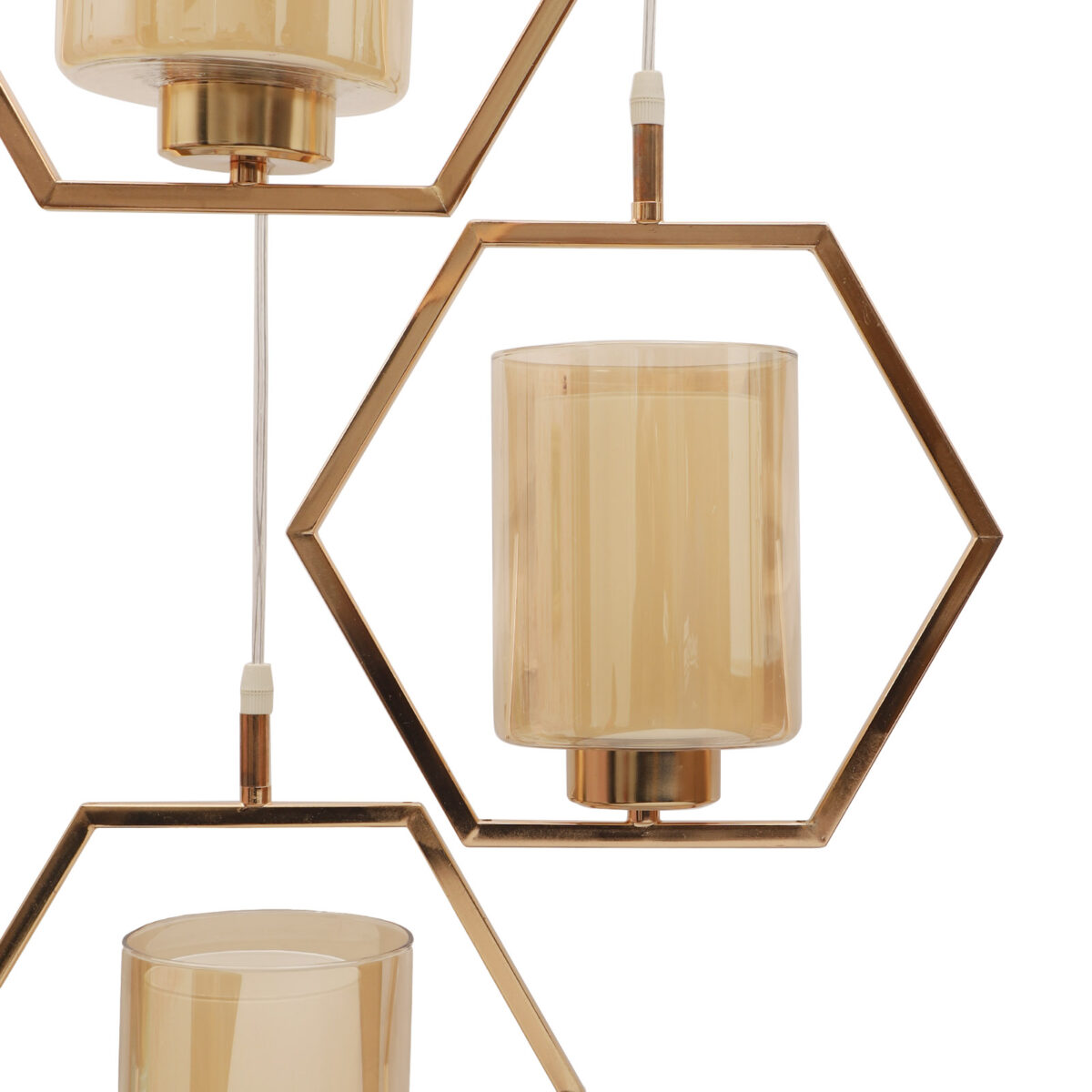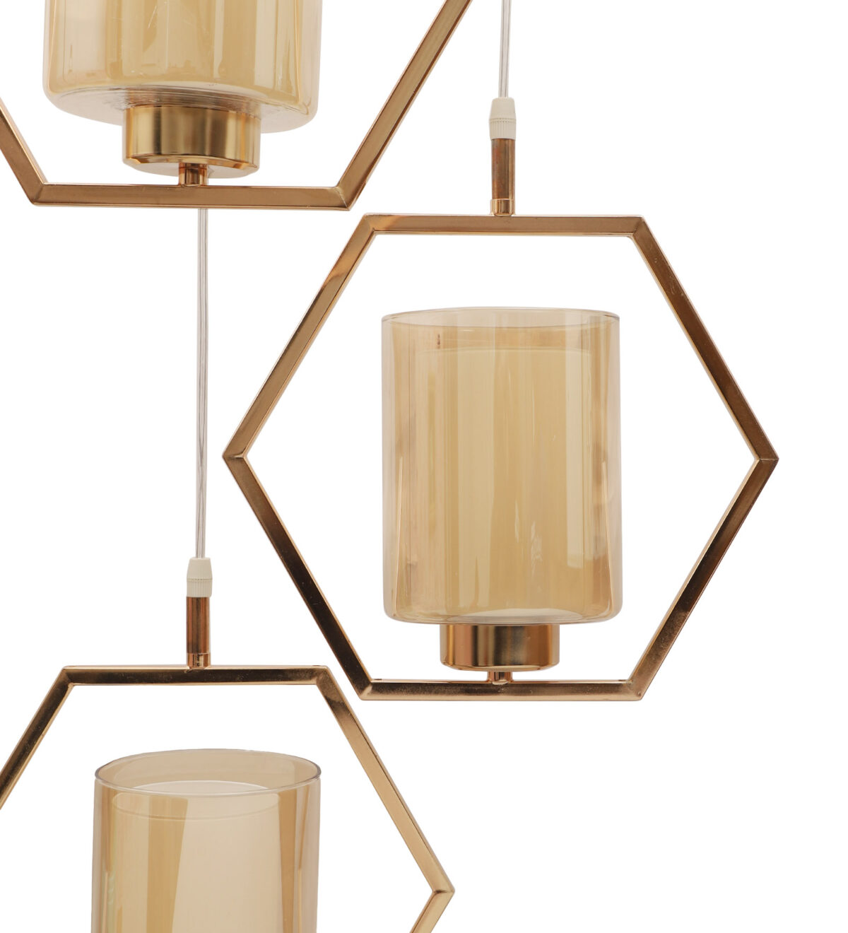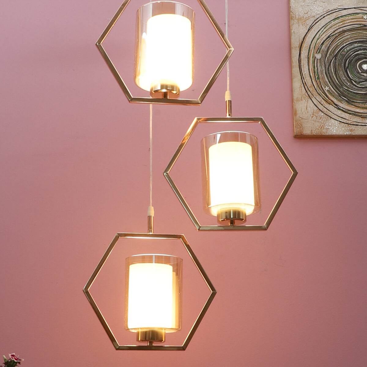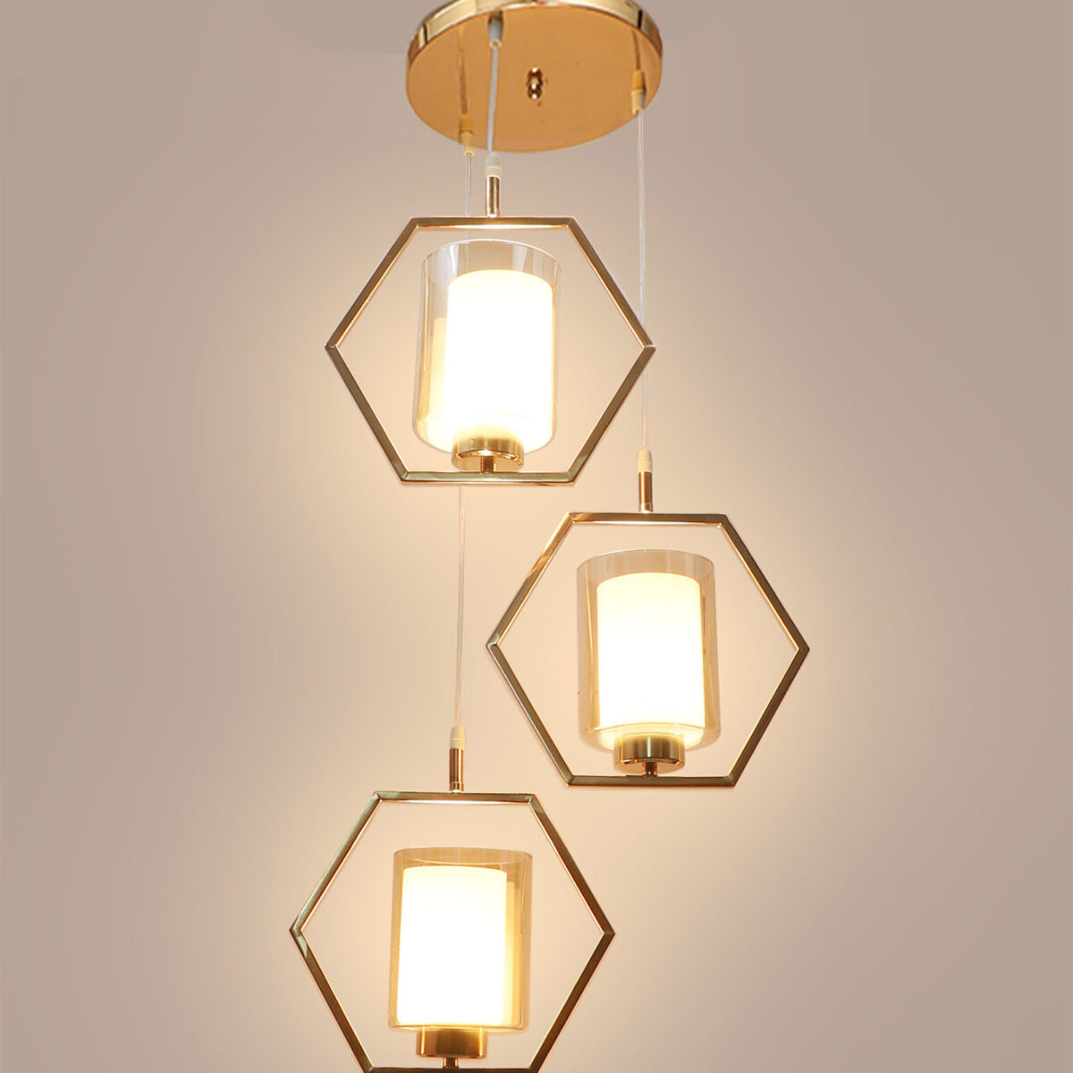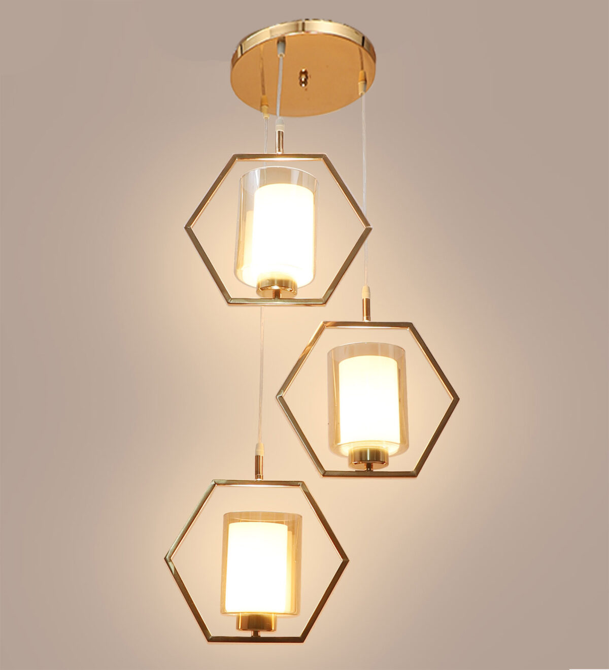 Antique finish modern hanging light having three lights in champaign coloured glass. The suspension can be adjusted at time of installation to the desired height. Can be customized as per requirement. LAMP NOT INCLUDED.