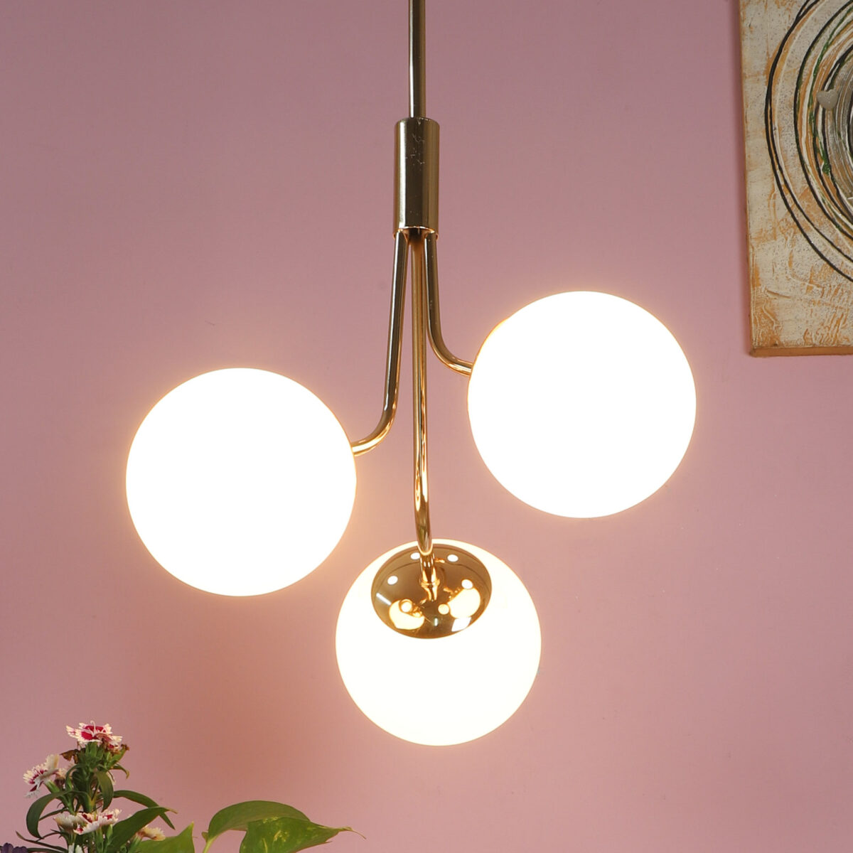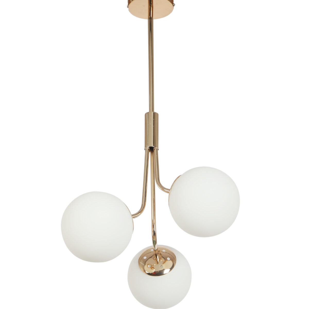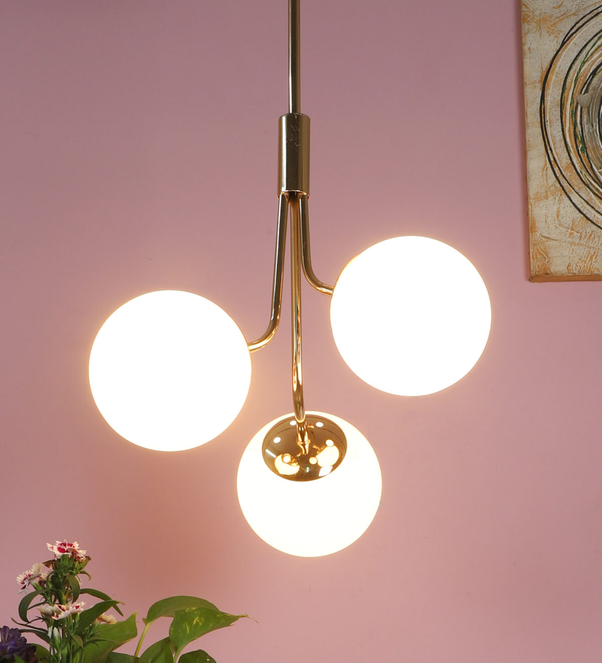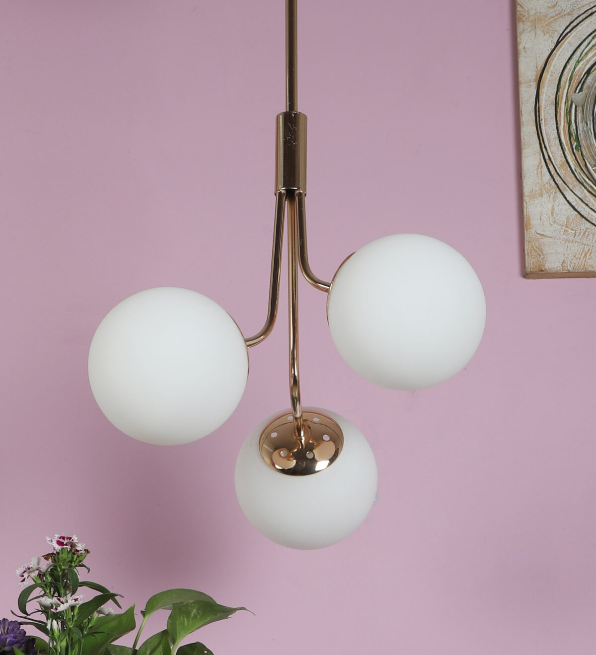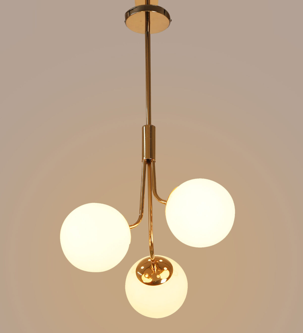 Golden modern hanging light having three lights in white doom glass. The suspension can be adjusted at time of installation to the desired height. Can be customized as per requirement. LAMP NOT INCLUDED.