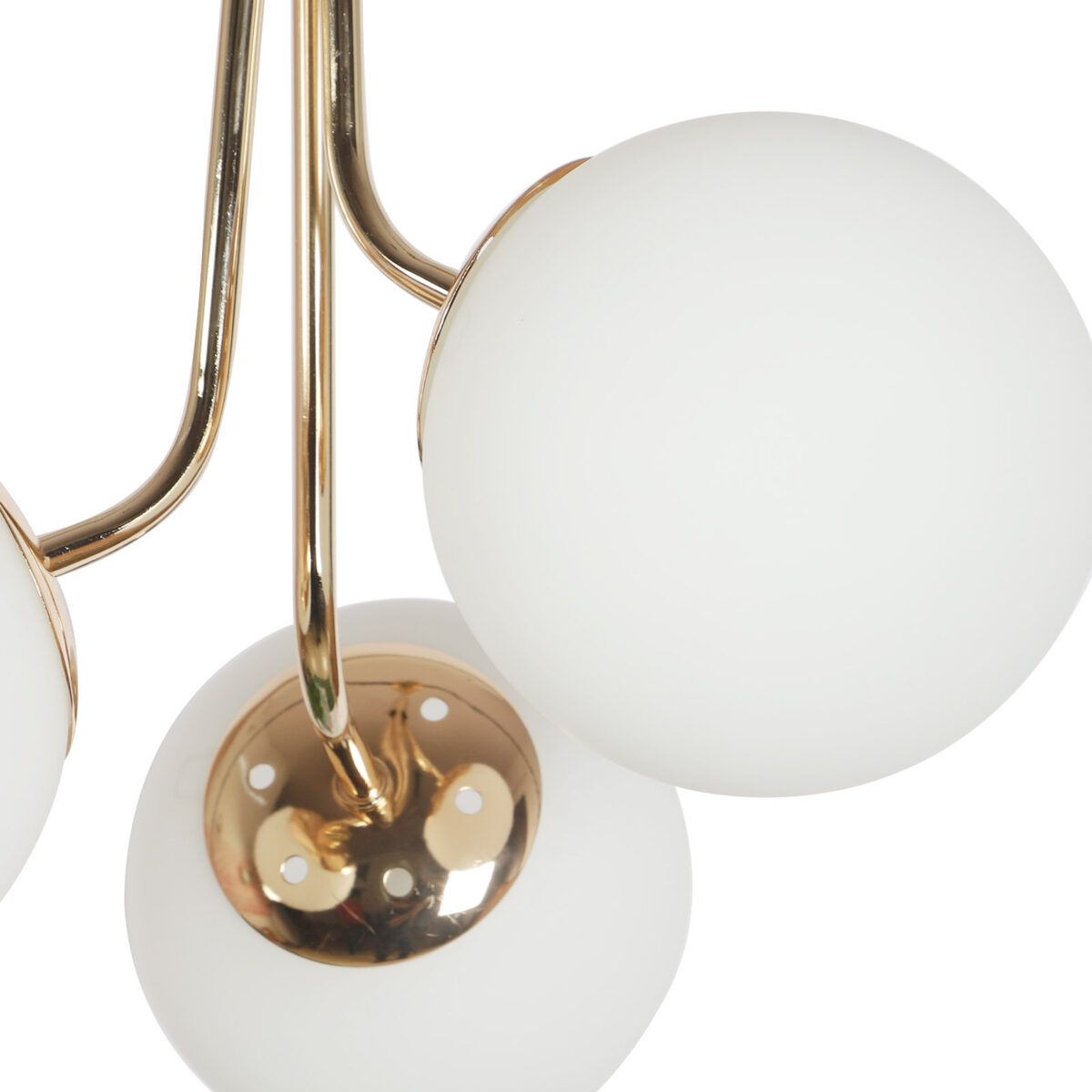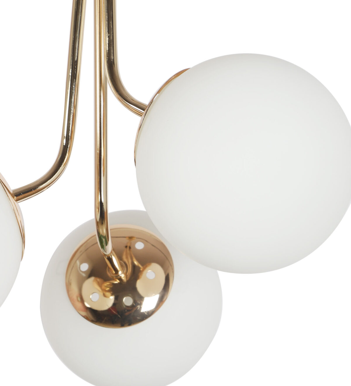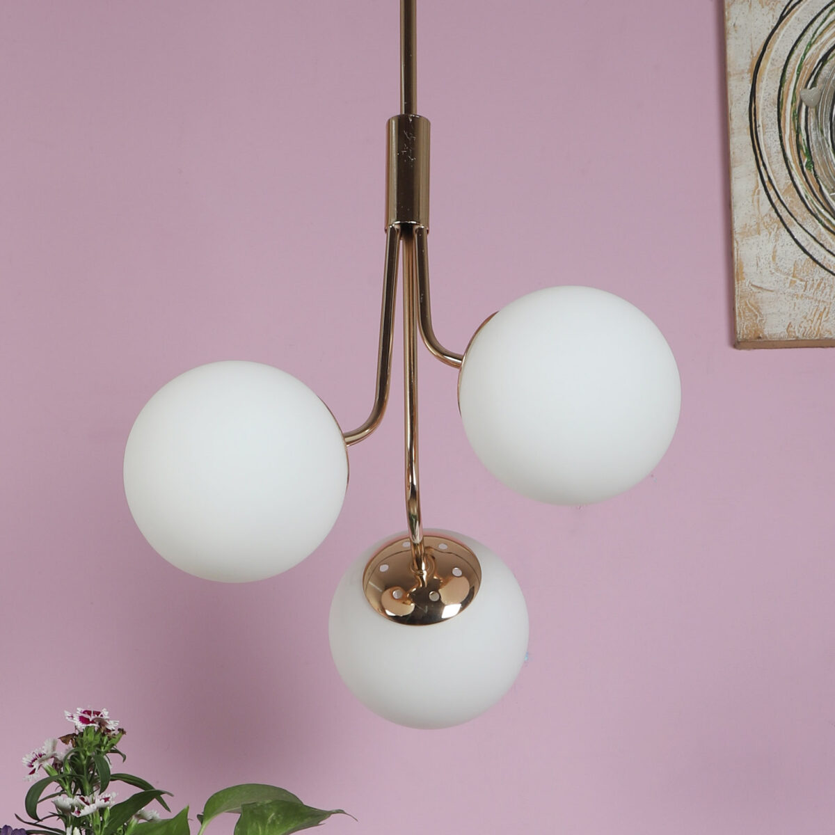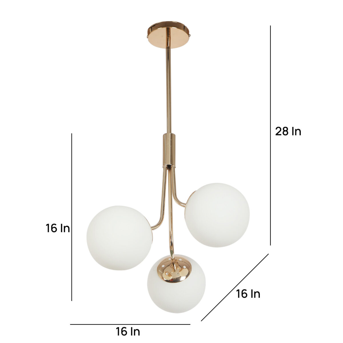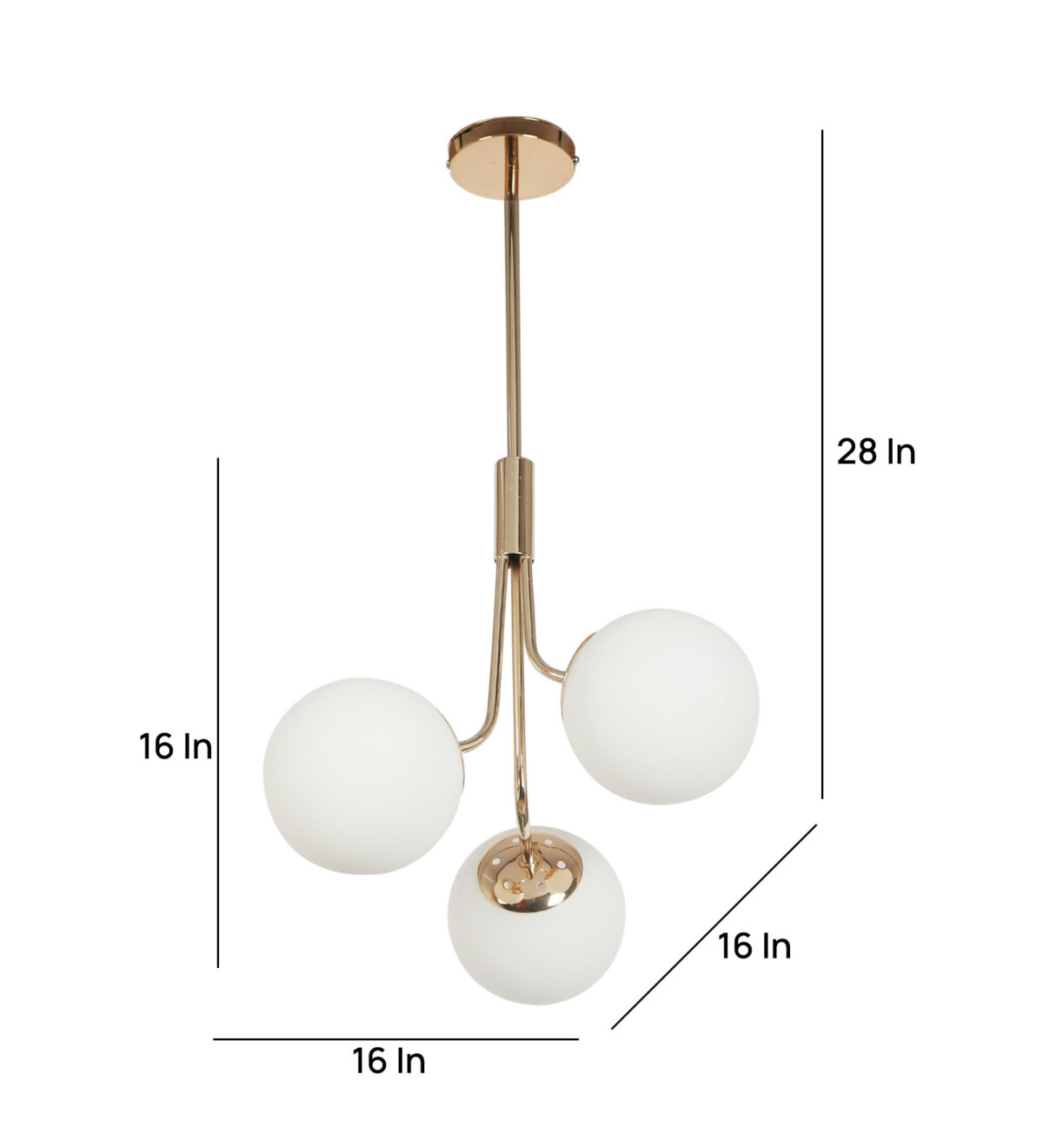 Golden modern hanging light having three lights in white doom glass. The suspension can be adjusted at time of installation to the desired height. Can be customized as per requirement. LAMP NOT INCLUDED.