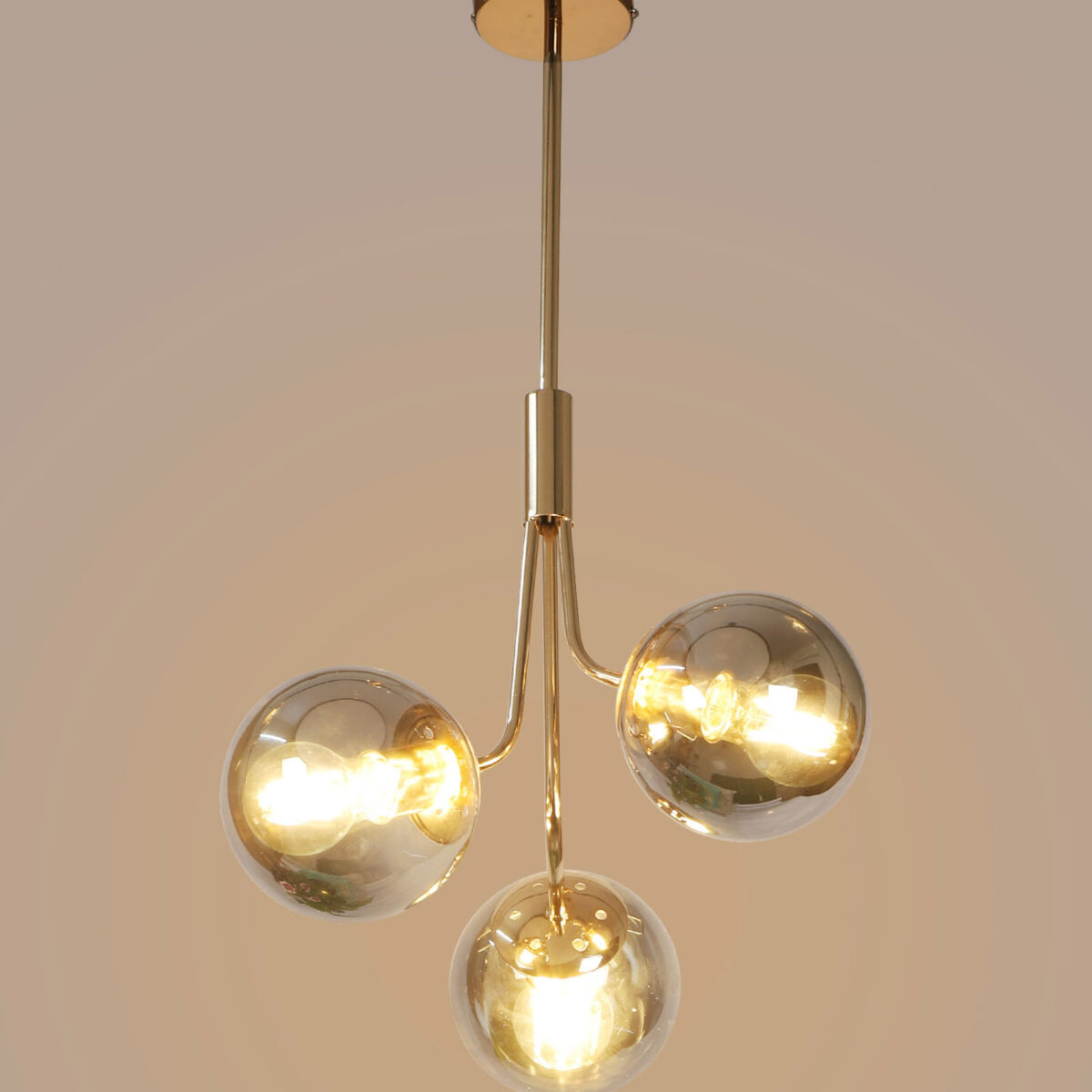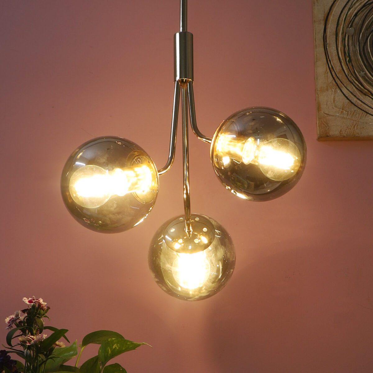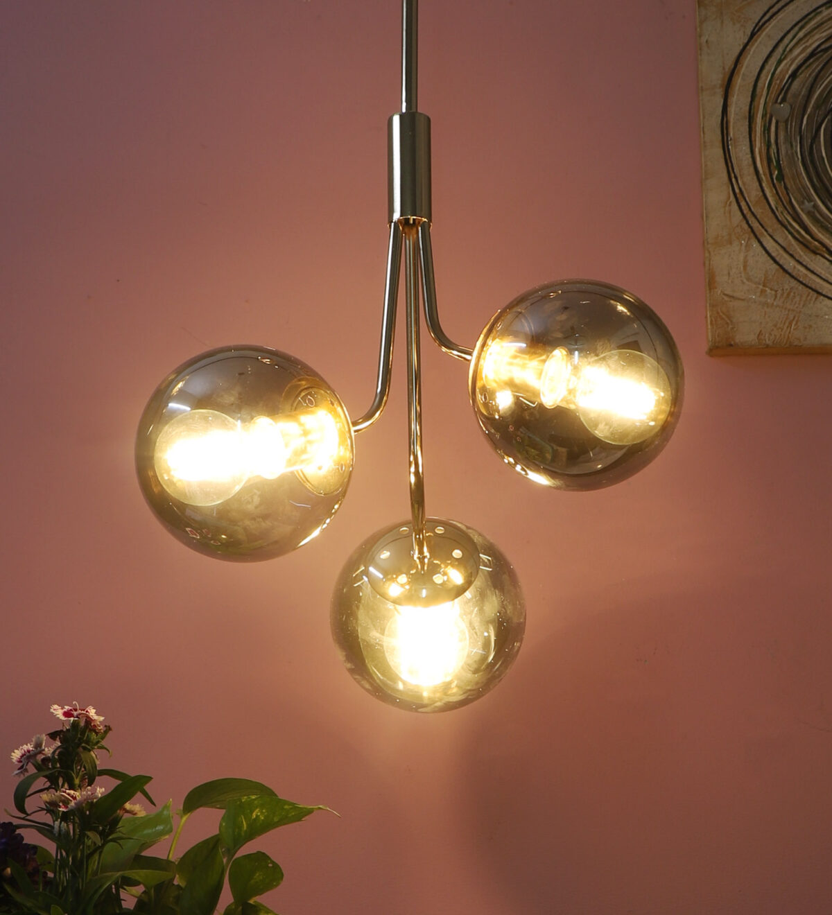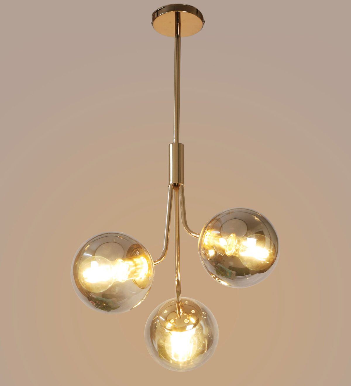 Golden modern hanging light having three lights in smoky doom glass. The suspension can be adjusted at time of installation to the desired height. Looks amazing with LED filament lamp. Can be customized as per requirement. LAMP NOT INCLUDED.
