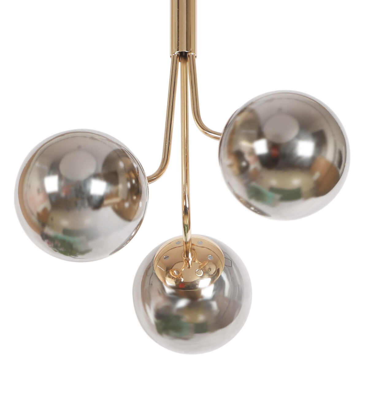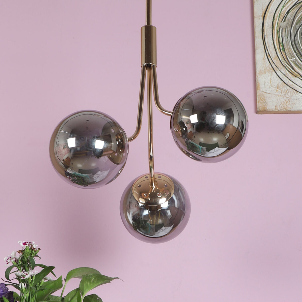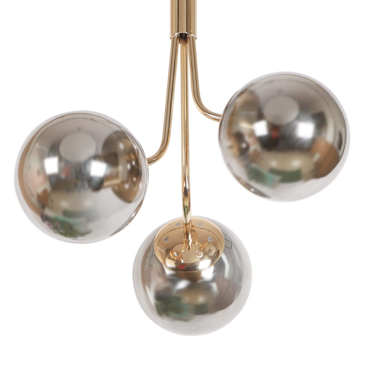 Golden modern hanging light having three lights in smoky doom glass. The suspension can be adjusted at time of installation to the desired height. Looks amazing with LED filament lamp. Can be customized as per requirement. LAMP NOT INCLUDED.