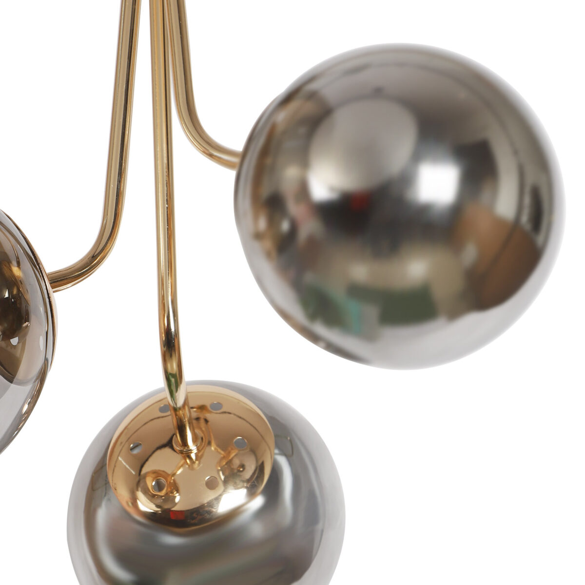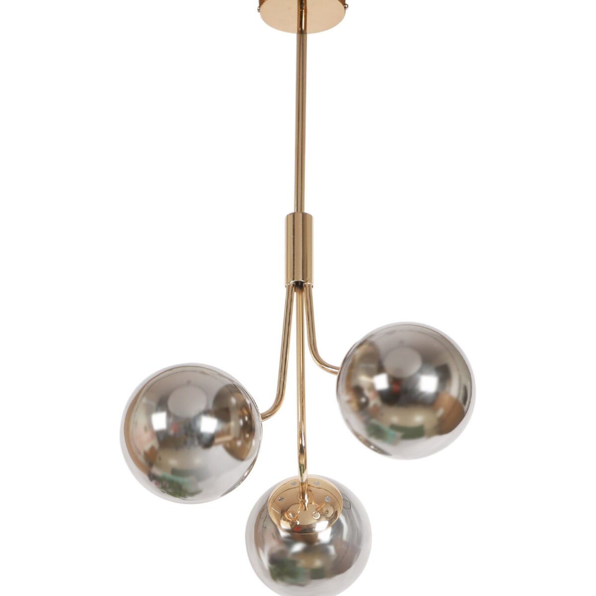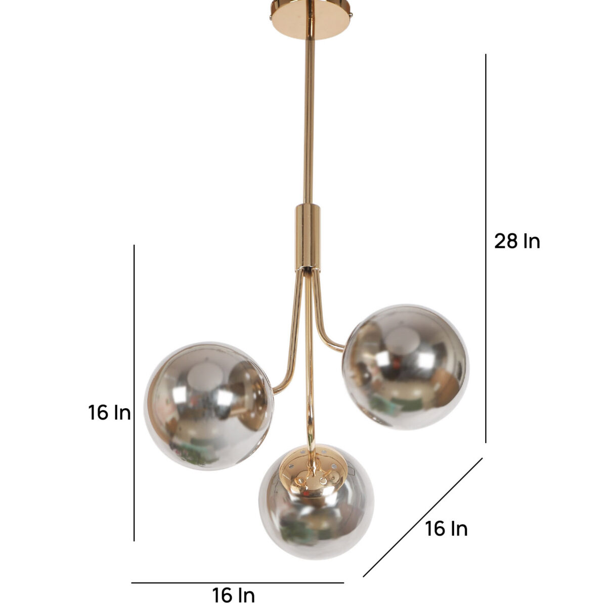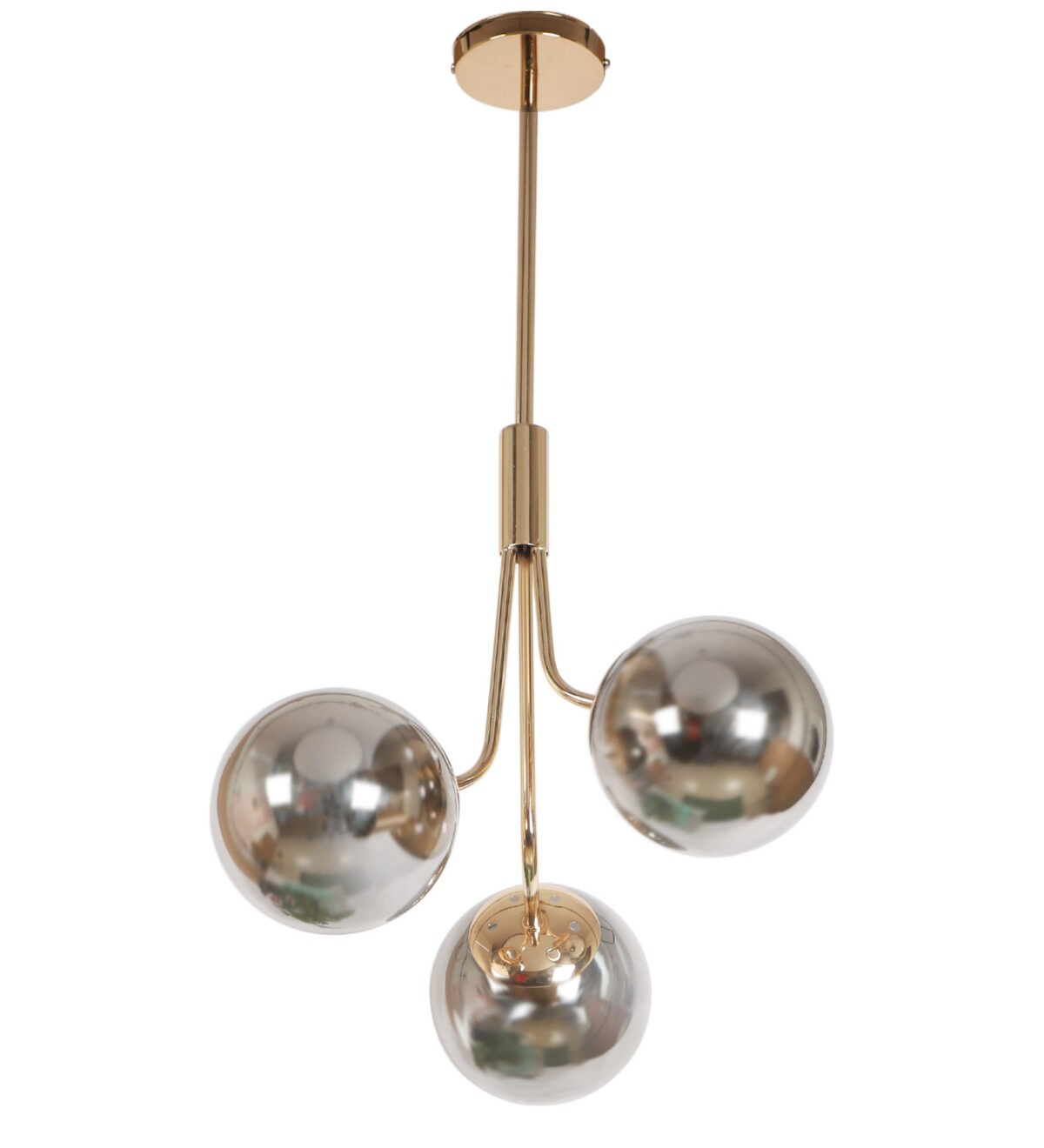 Golden modern hanging light having three lights in smoky doom glass. The suspension can be adjusted at time of installation to the desired height. Looks amazing with LED filament lamp. Can be customized as per requirement. LAMP NOT INCLUDED.