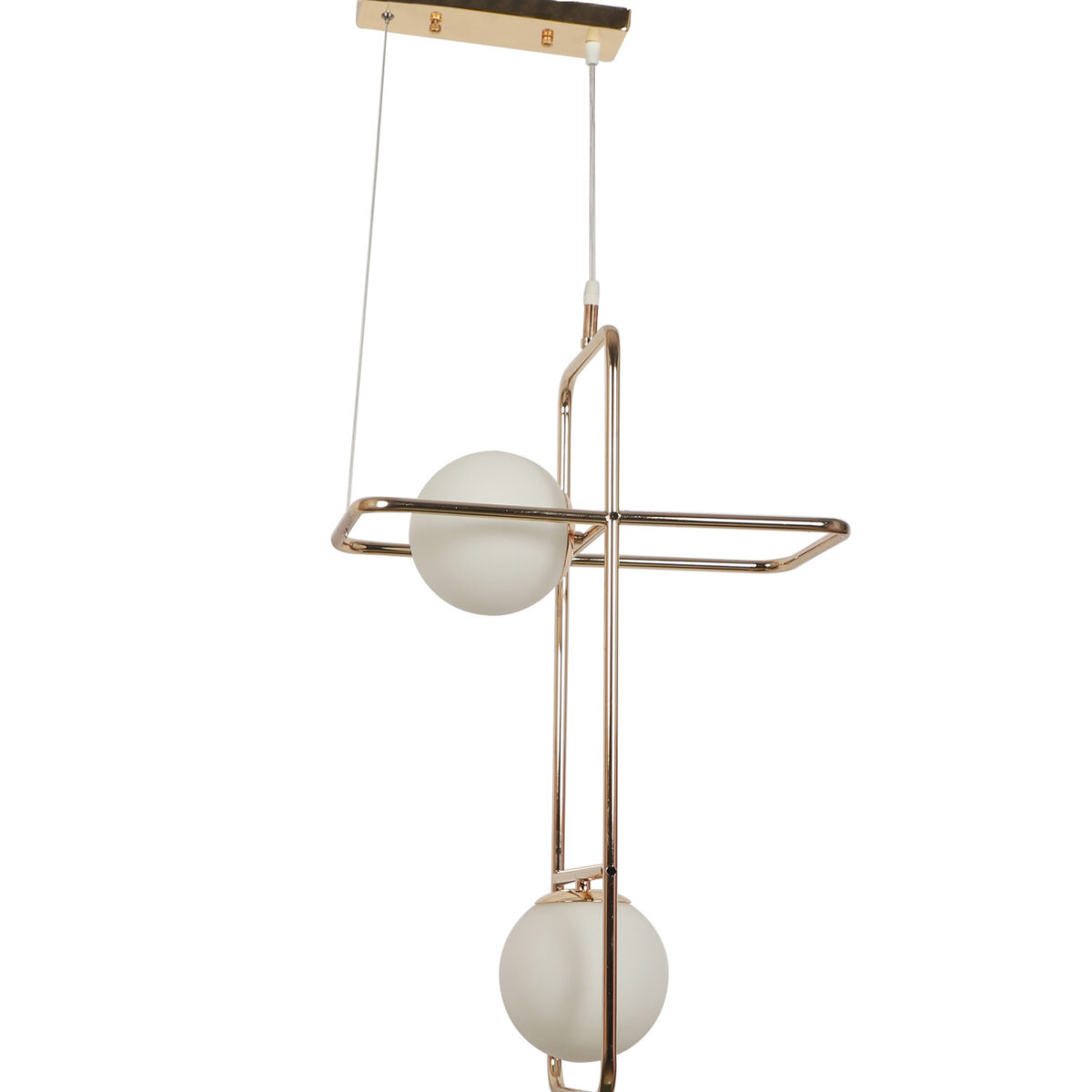 Golden modern hanging light having two lights in white doom glass. The suspension can be adjusted at time of installation to the desired height. Can be customized as per requirement. LAMP NOT INCLUDED.