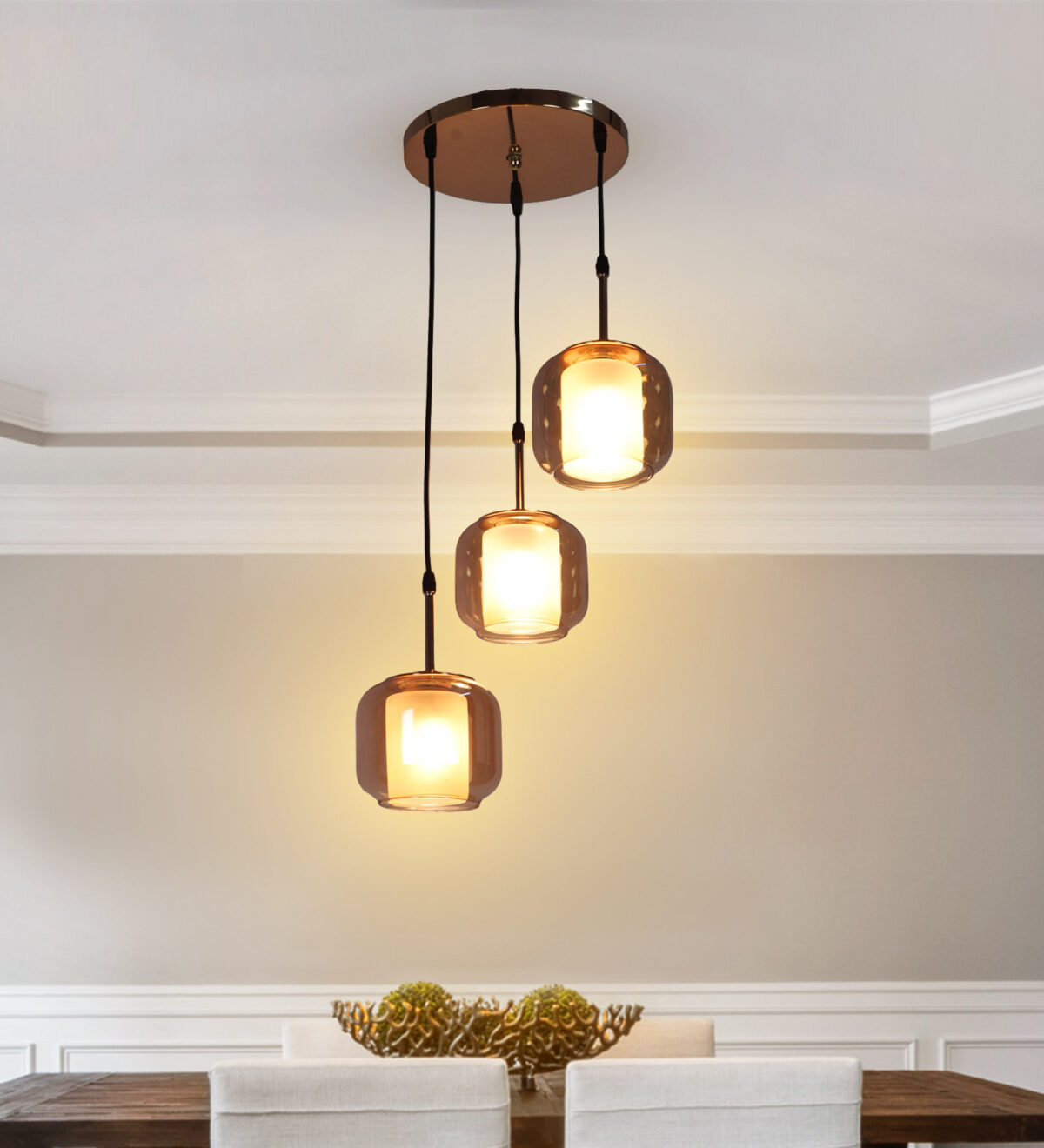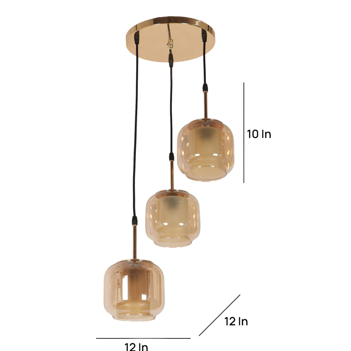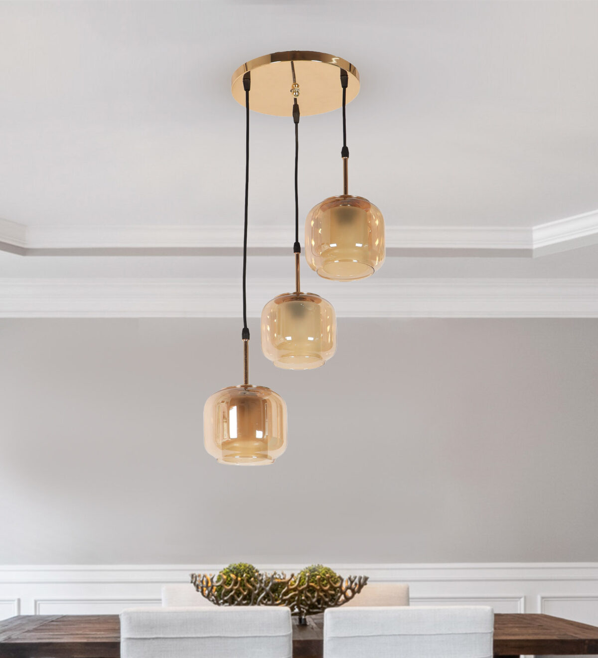 Gold finish tripple hanging light. Can be customised as per requirement in terms height, finish. Also availble in clusters of variable quantity. LAMPS NOT INCLUDED.