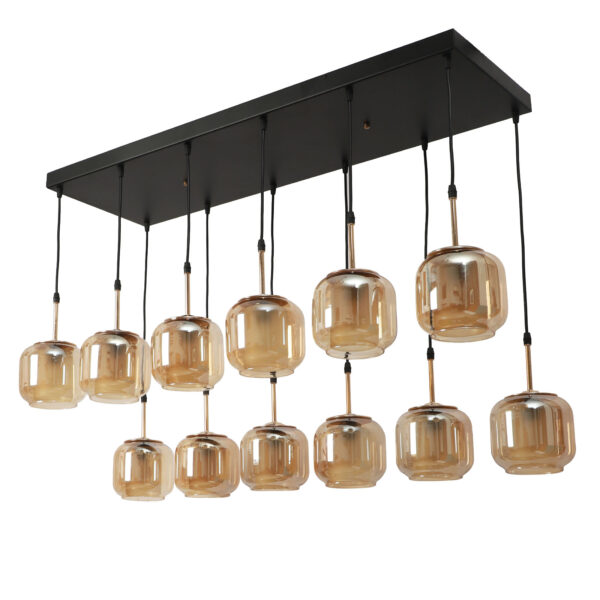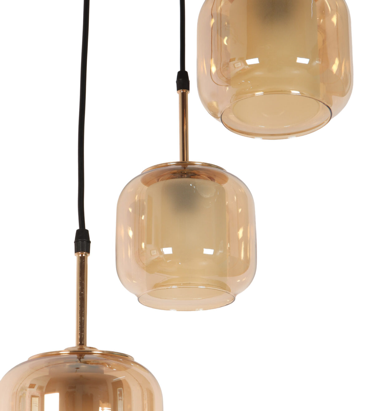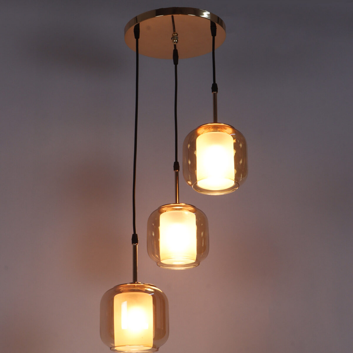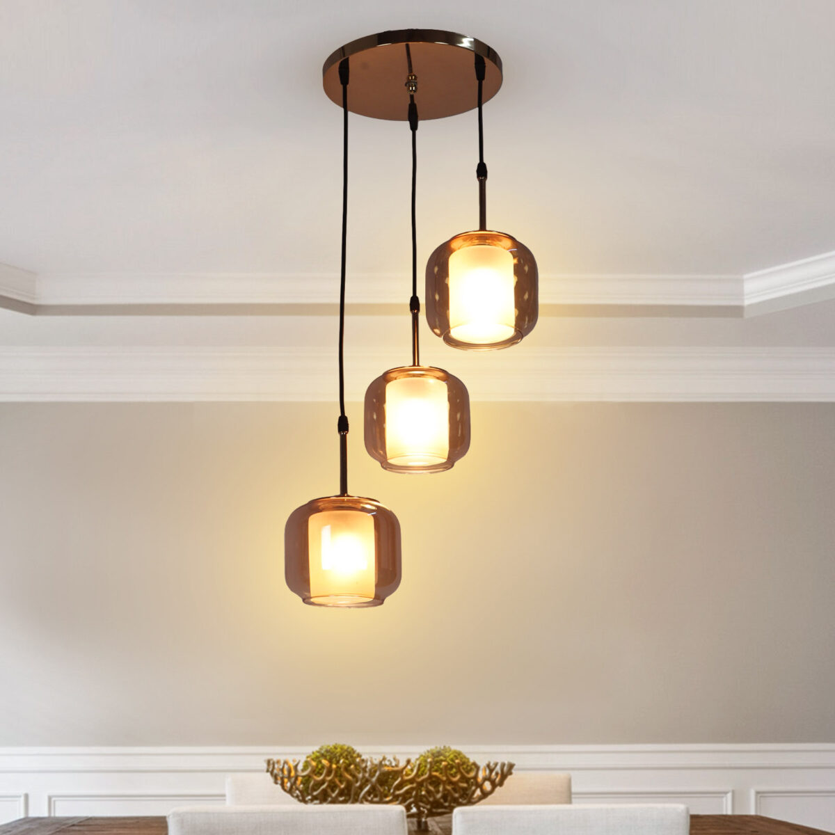 Gold finish tripple hanging light. Can be customised as per requirement in terms height, finish. Also availble in clusters of variable quantity. LAMPS NOT INCLUDED.