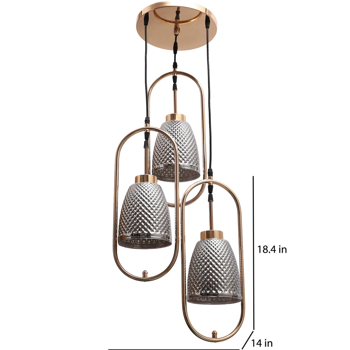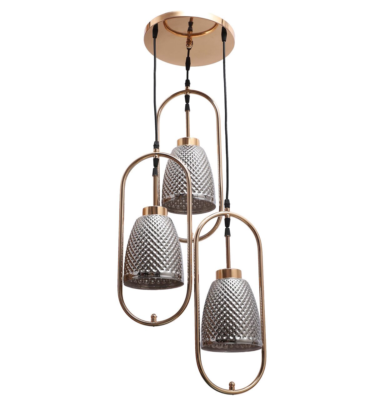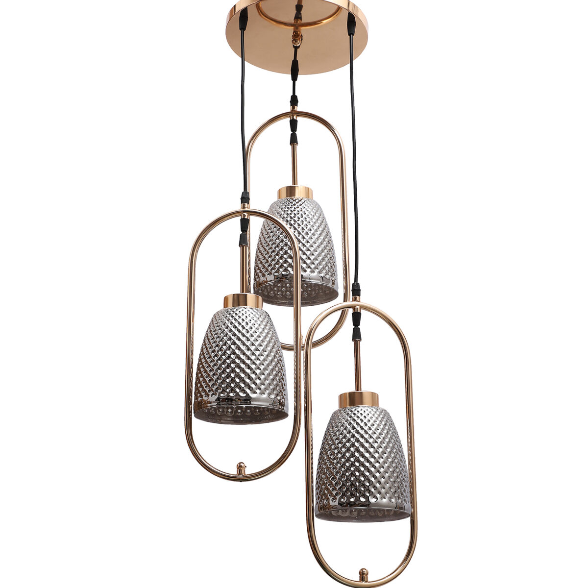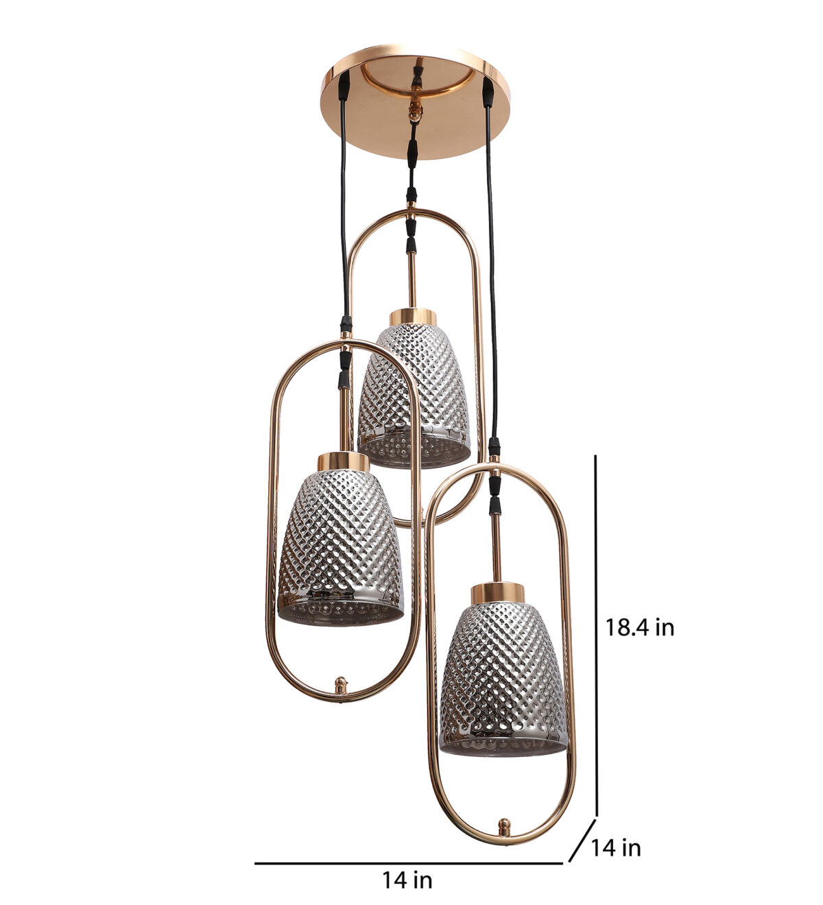 Gold finish tripple hanging light in smoke glass. The suspension can be adjusted at time of installation to the desired height. Can be customized as per requirement. LAMP NOT INCLUDED.