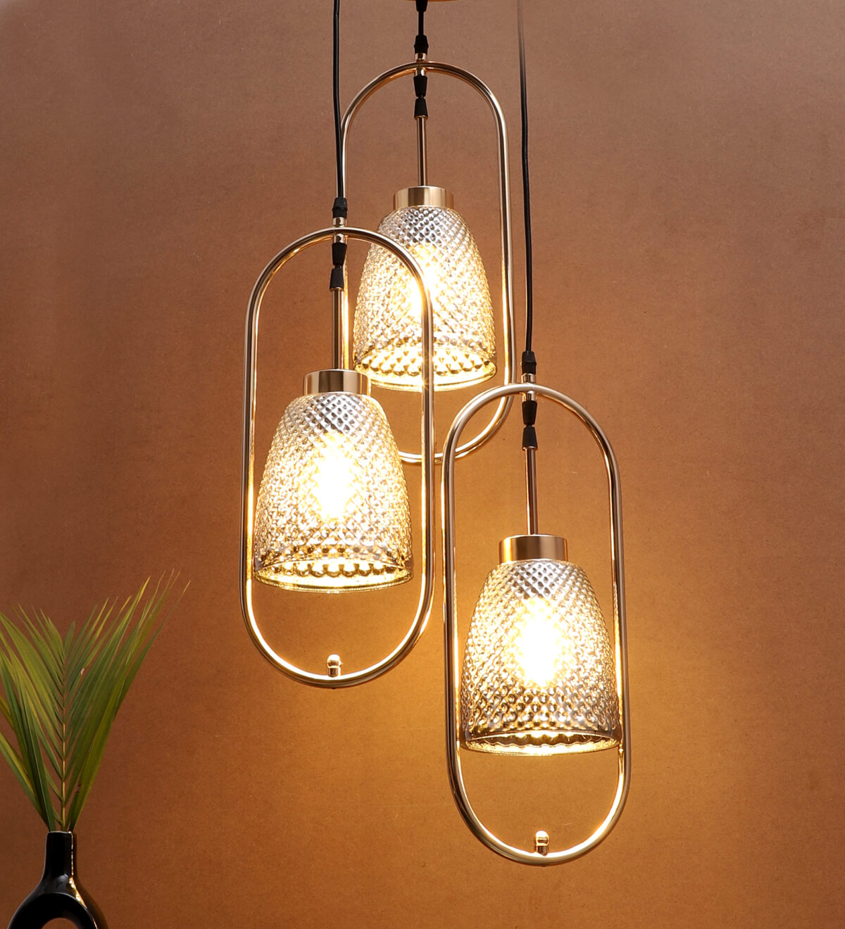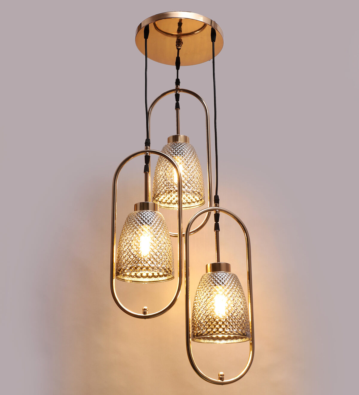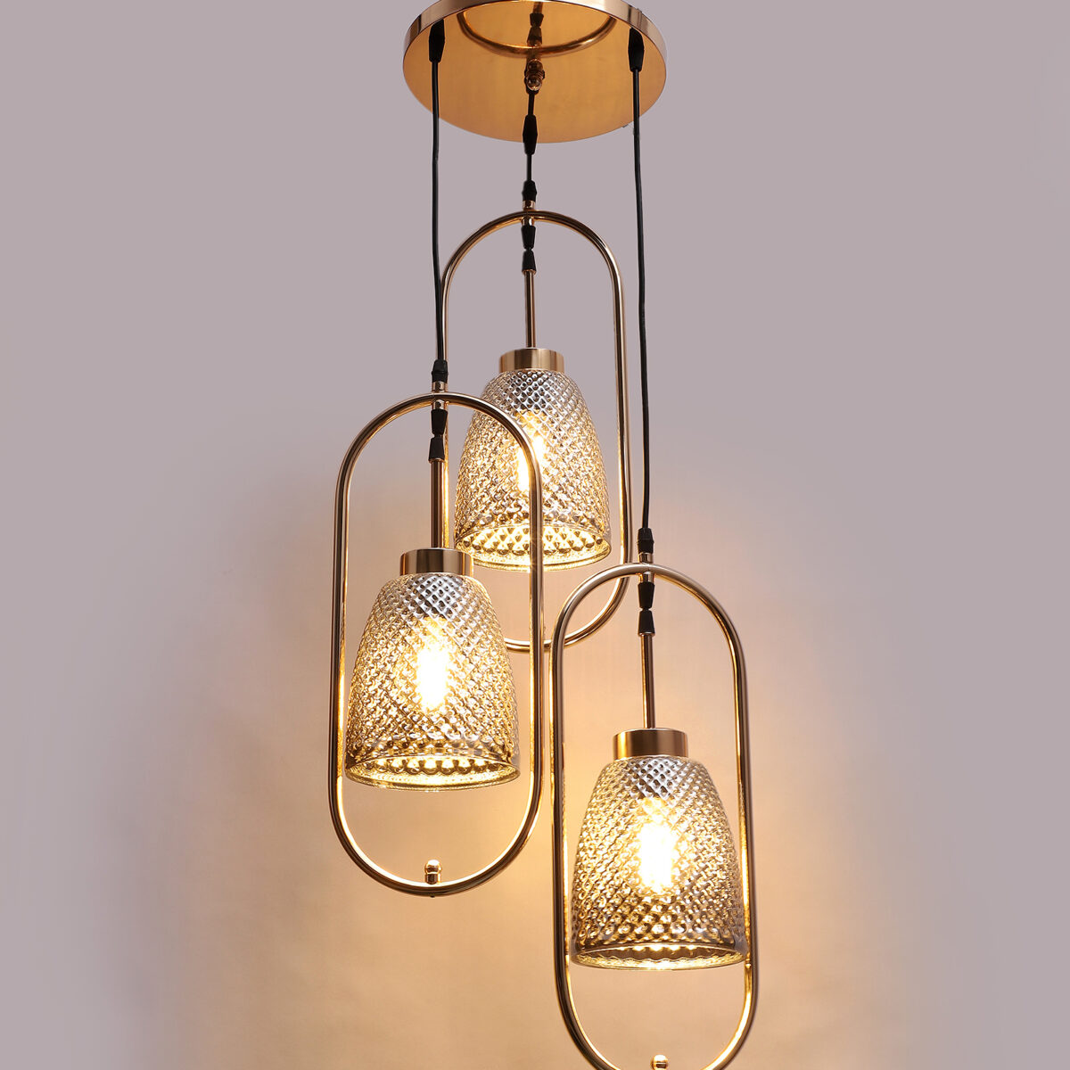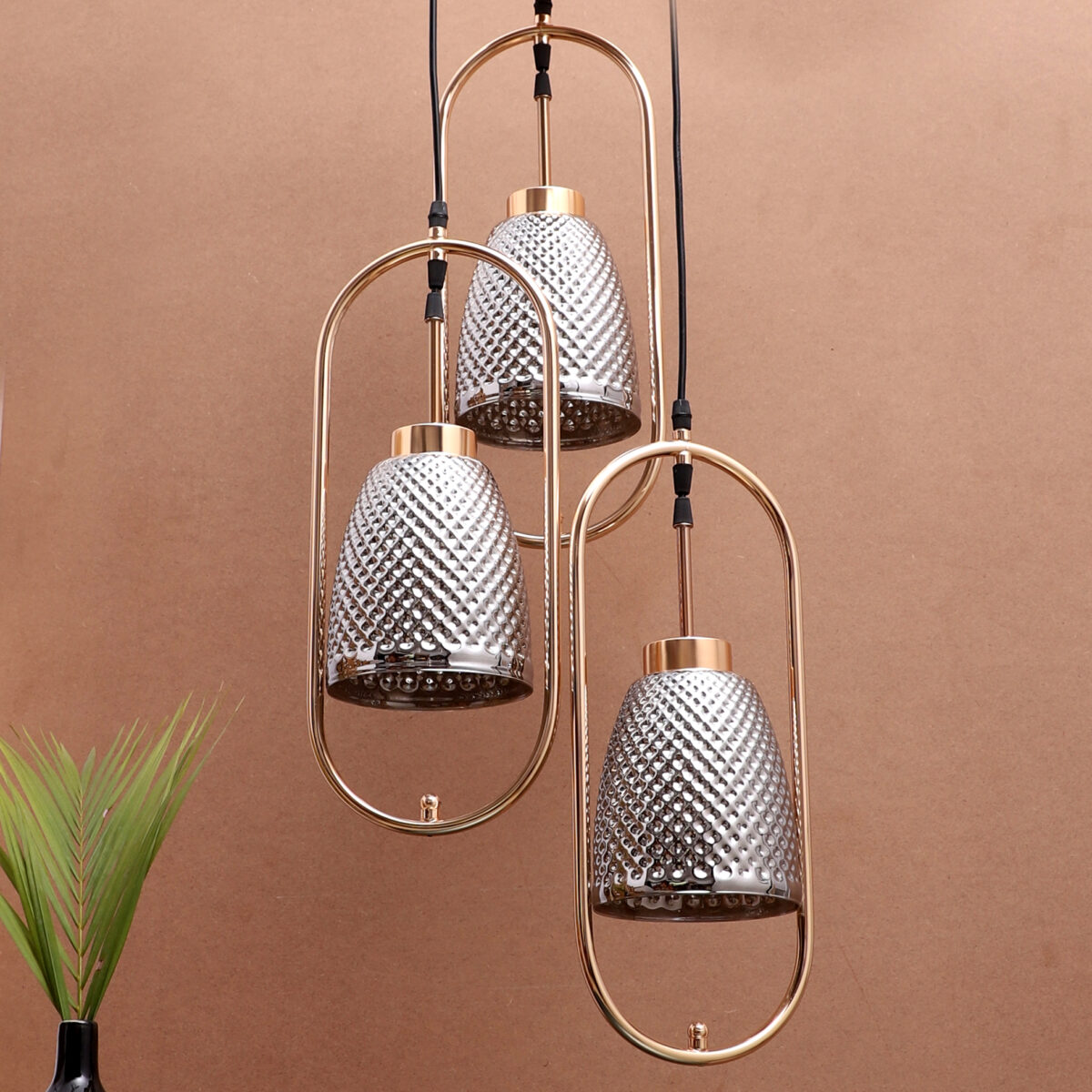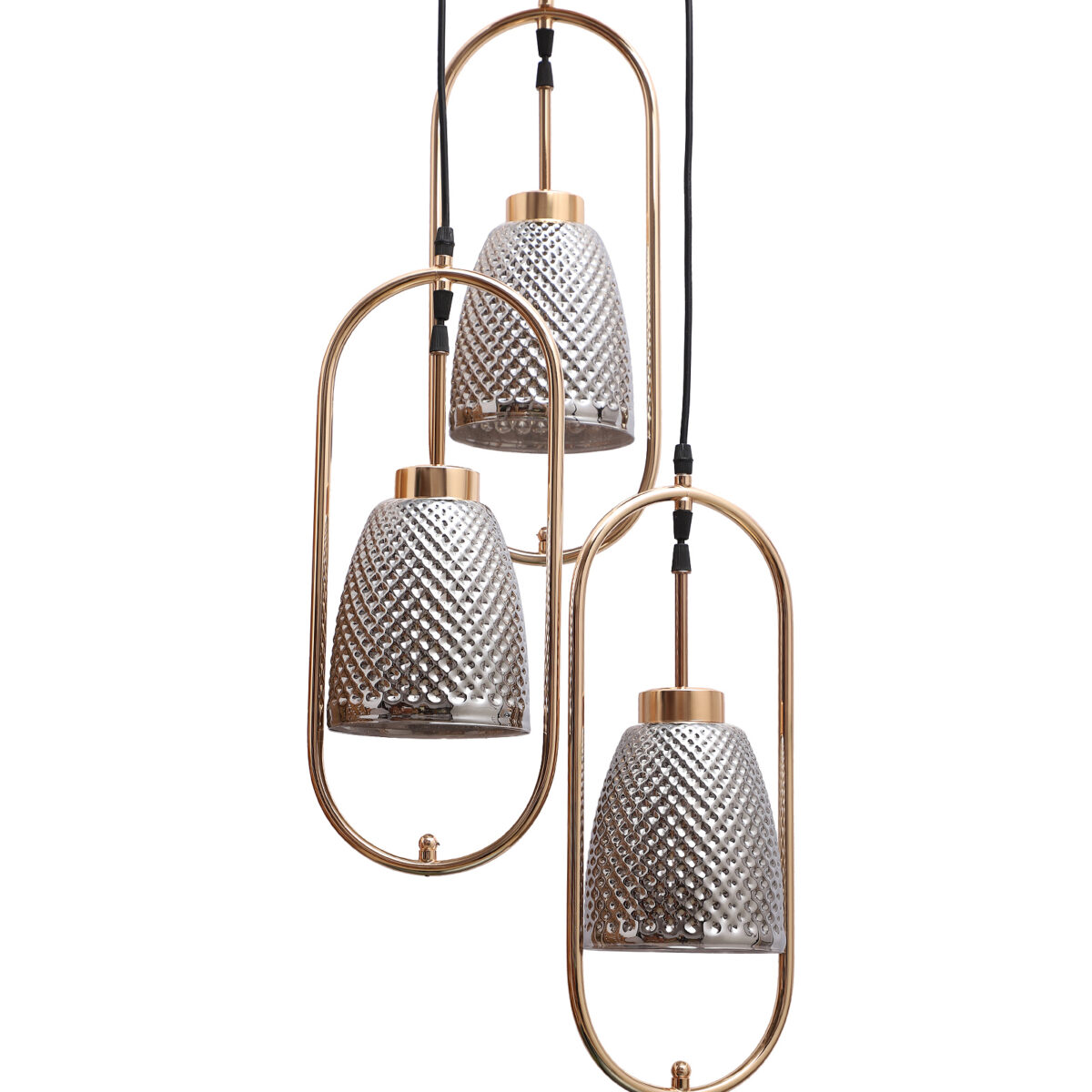 Gold finish tripple hanging light in smoke glass. The suspension can be adjusted at time of installation to the desired height. Can be customized as per requirement. LAMP NOT INCLUDED.