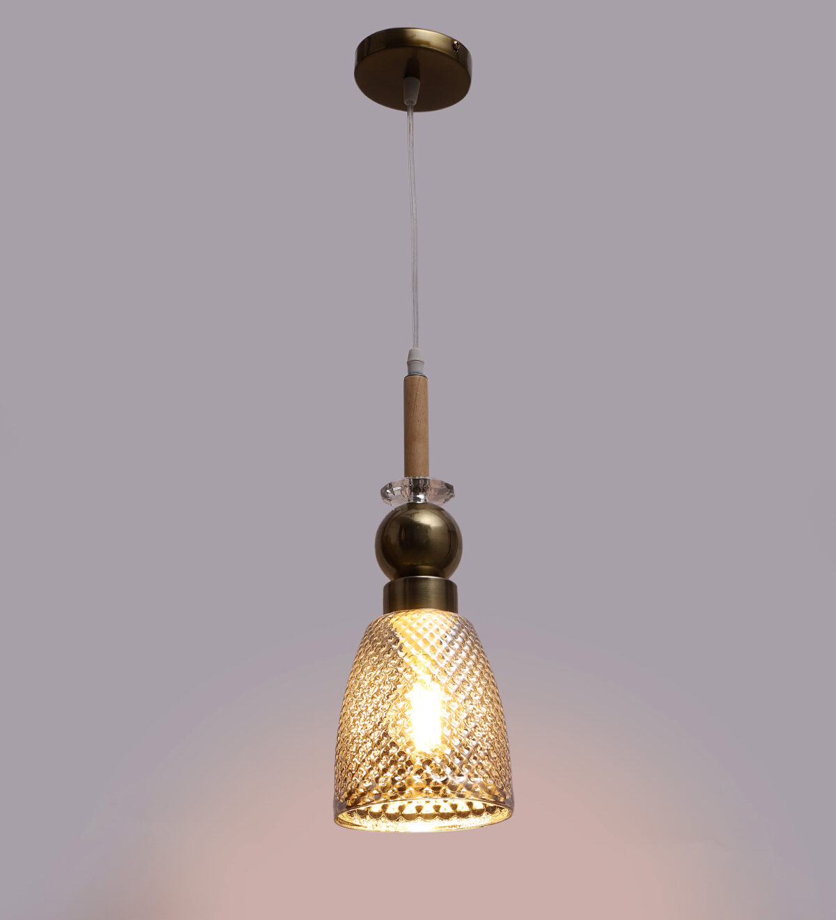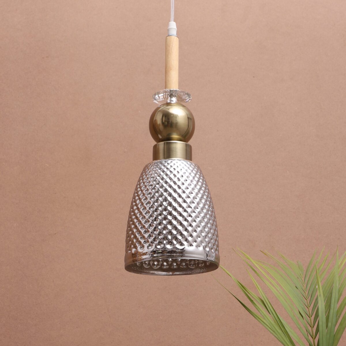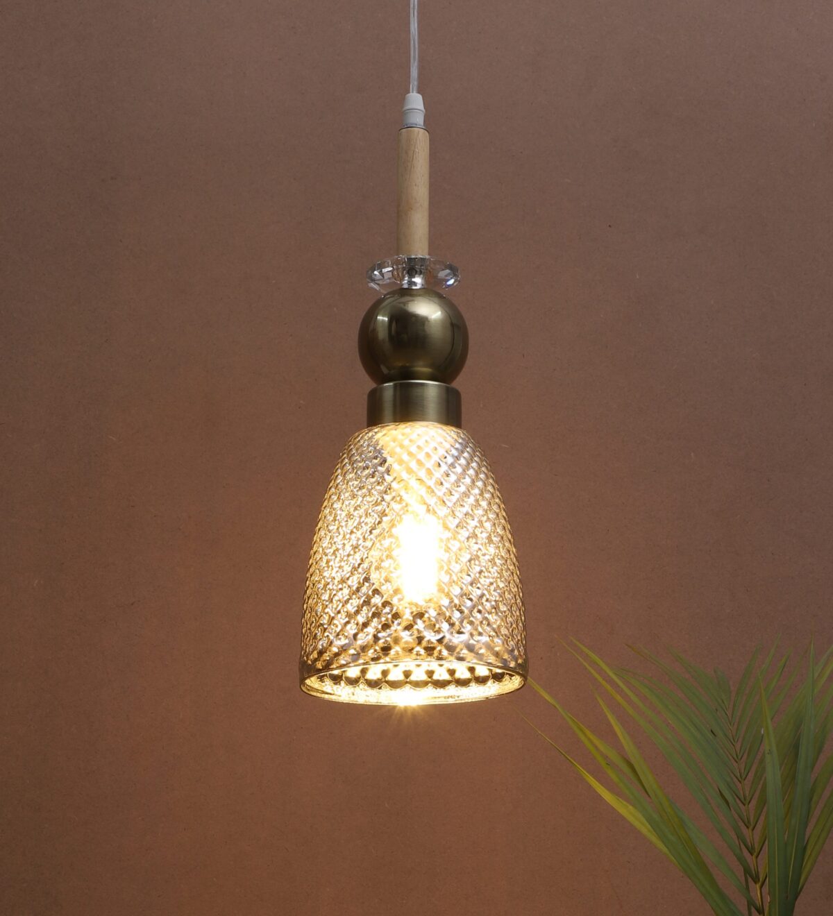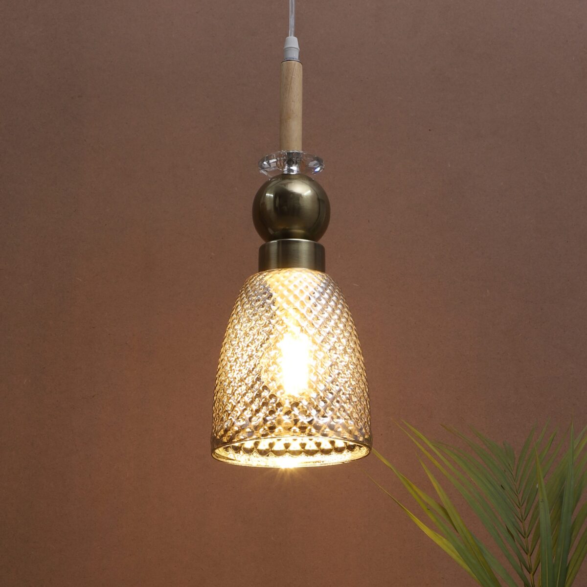 Antique finish single hanging light made of wood, mild steel and glass. The suspension can be adjusted at time of installation to the desired height. Can be customized as per requirement. LAMP NOT INCLUDED.