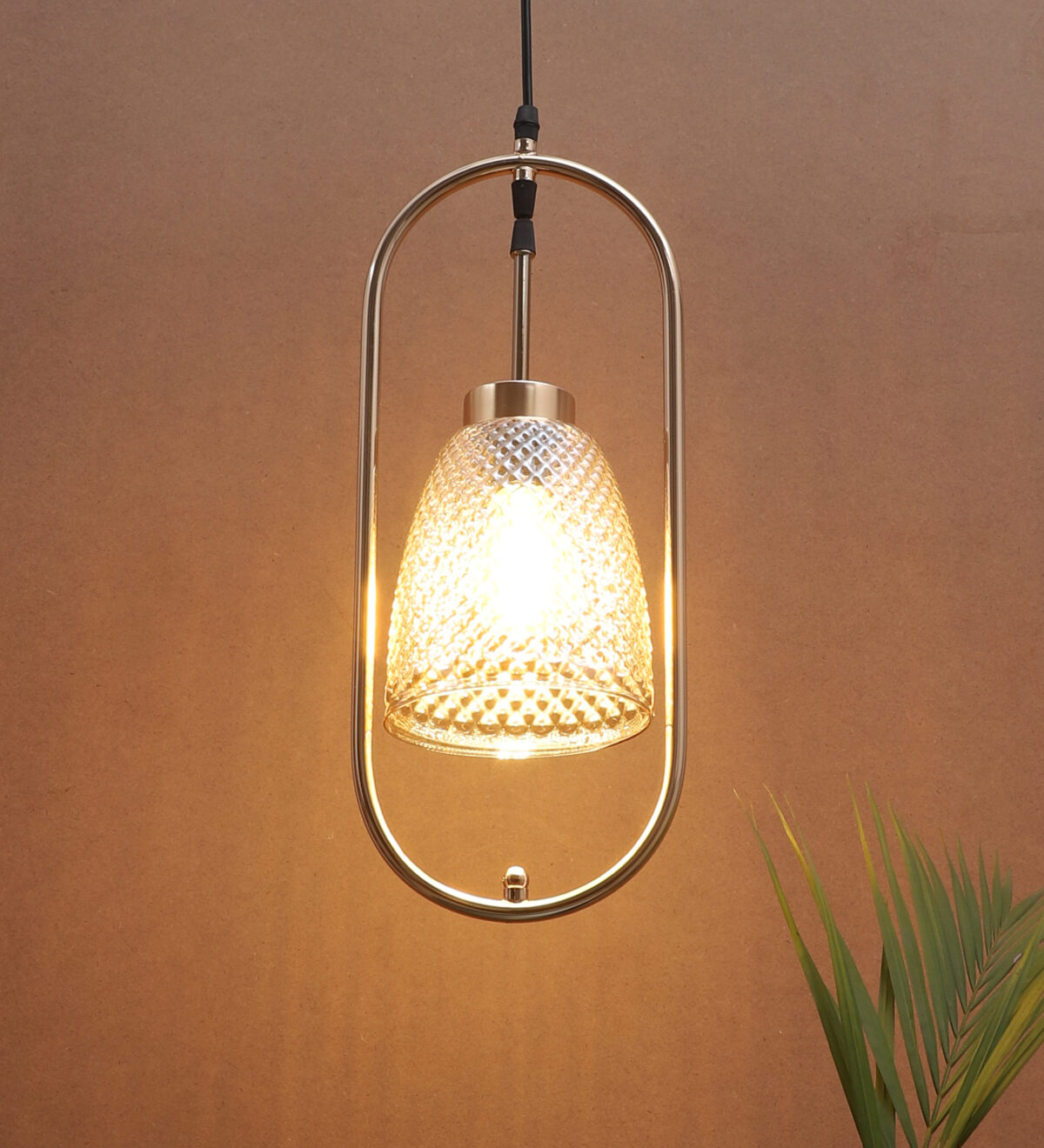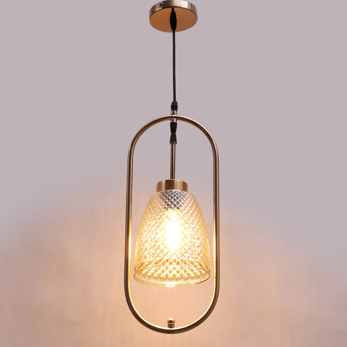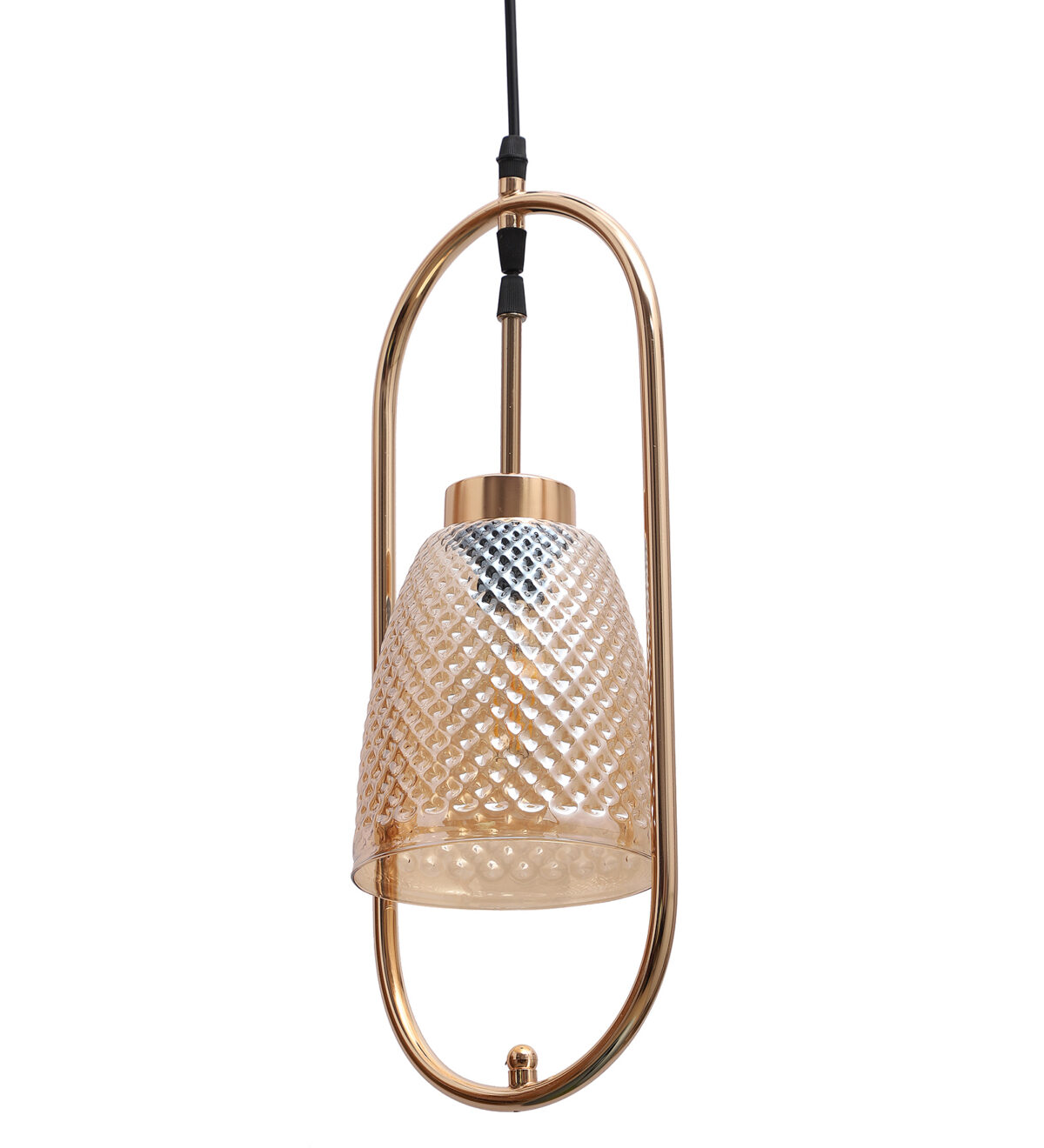 Gold modern, single hanging light in champaign glass. The suspension can be adjusted at time of installation to the desired height. It is maintenance free, comes with an E27 holder.Can be customized as per requirement. LAMP NOT INCLUDED.
