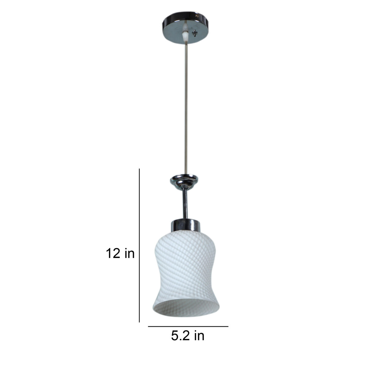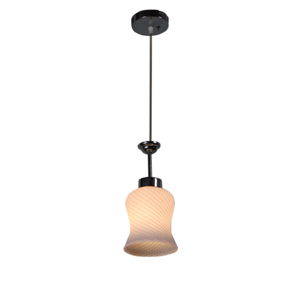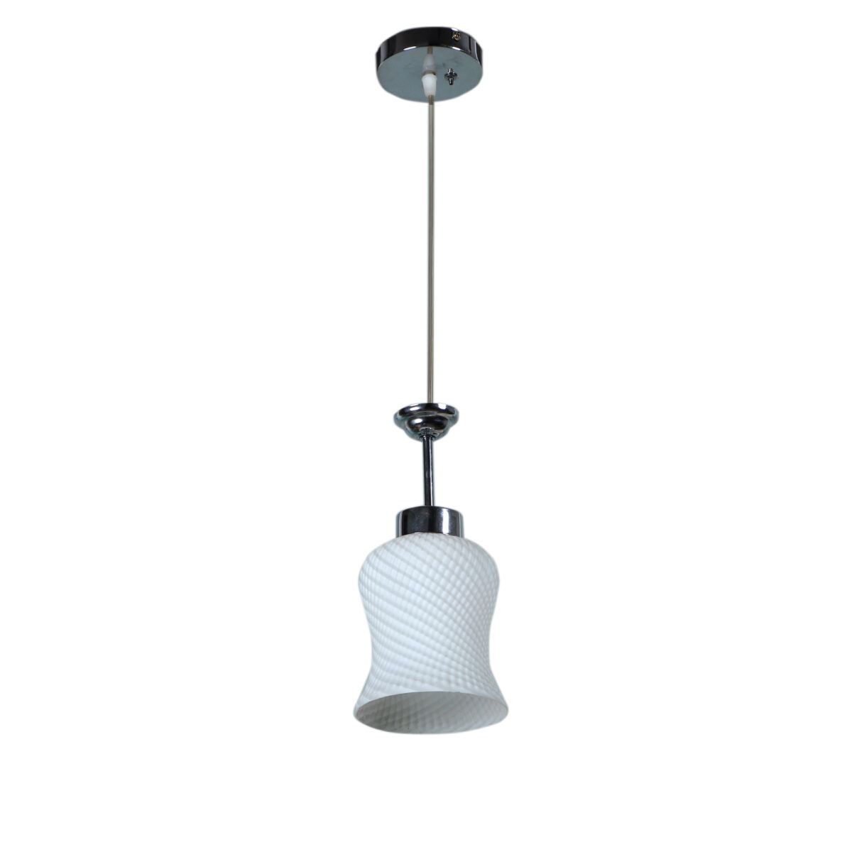 Silver (chrome) finish,modern bell shaped glass, single hanging light made of mild steel and glass. This light is having a nice self design on the glass which is liked by many. The suspension can be adjusted at time of installation to the desired height. It is maintenance free, easy to remove glass and wash them, comes with an E27 holder, only the change of lamp is required, which is available locally everywhere. Application includes both residential and commercial premises wherever it matches with your interiors. Also available in three lamp option with code HL3841-3. Matching wall light code – WL1063, WL1285. Matching fixed ceiling code – CL413. Can be customized as per requirement in case of bulk quantities. Lamp not included.
