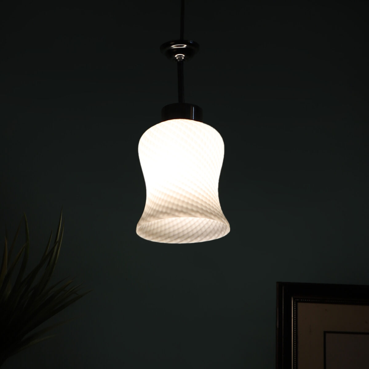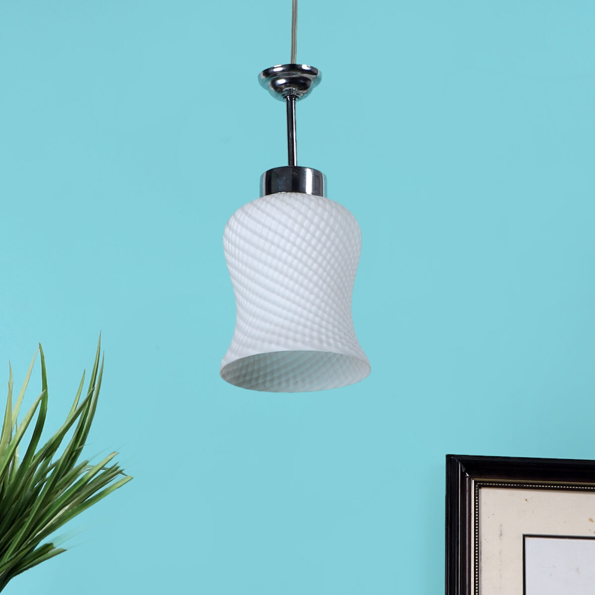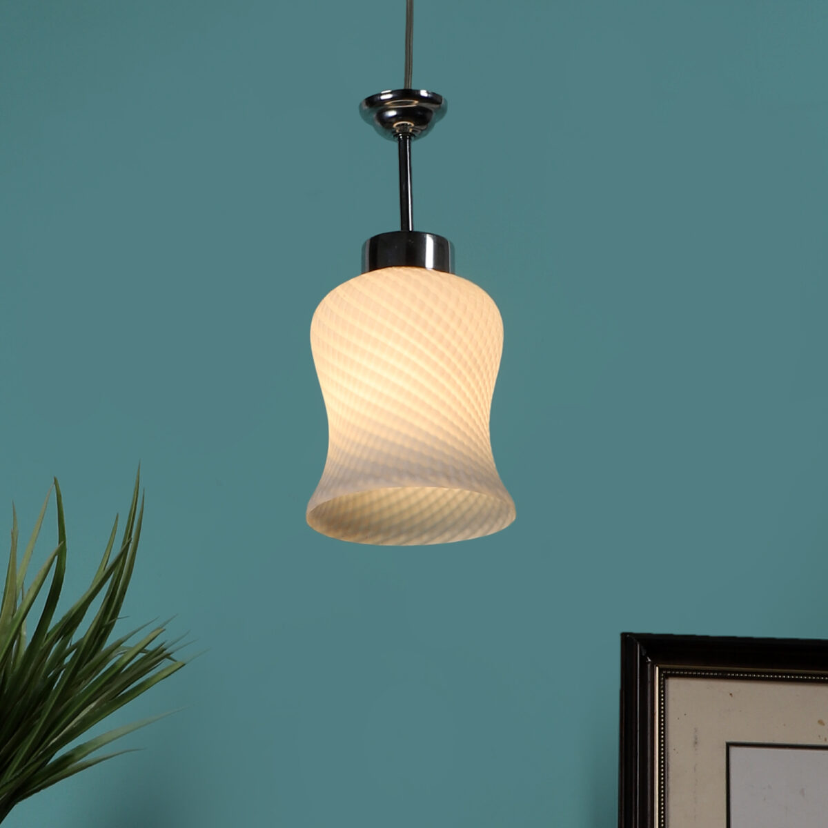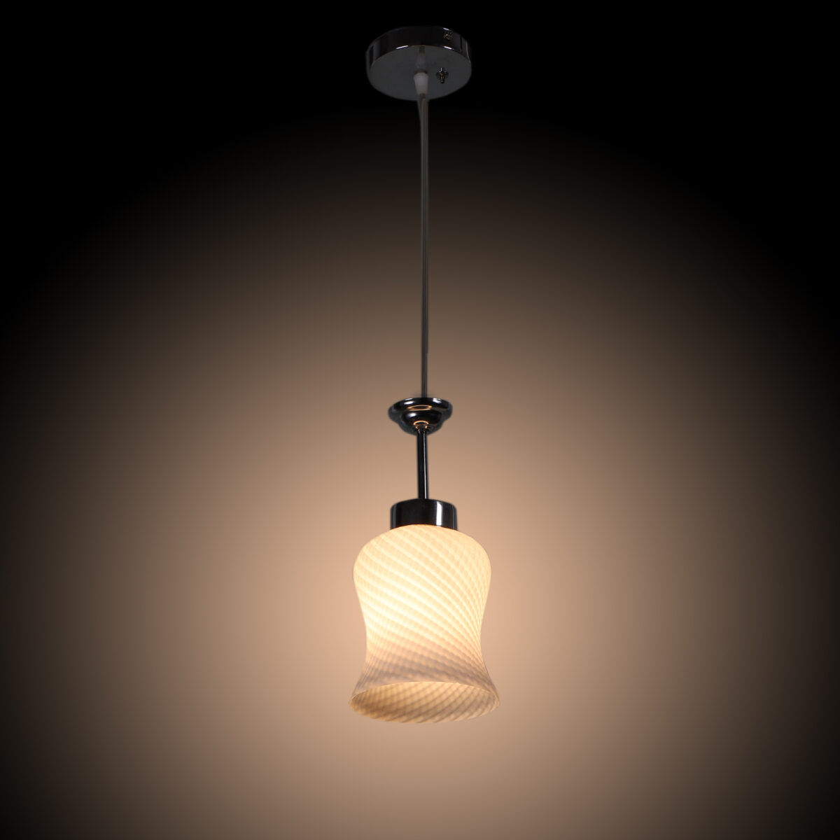 Silver (chrome) finish,modern bell shaped glass, single hanging light made of mild steel and glass. This light is having a nice self design on the glass which is liked by many. The suspension can be adjusted at time of installation to the desired height. It is maintenance free, easy to remove glass and wash them, comes with an E27 holder, only the change of lamp is required, which is available locally everywhere. Application includes both residential and commercial premises wherever it matches with your interiors. Also available in three lamp option with code HL3841-3. Matching wall light code – WL1063, WL1285. Matching fixed ceiling code – CL413. Can be customized as per requirement in case of bulk quantities. Lamp not included.