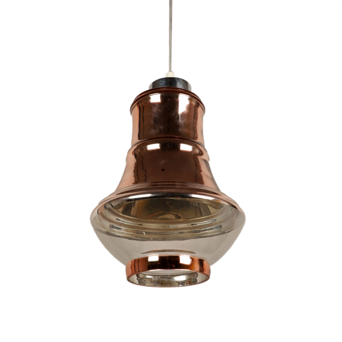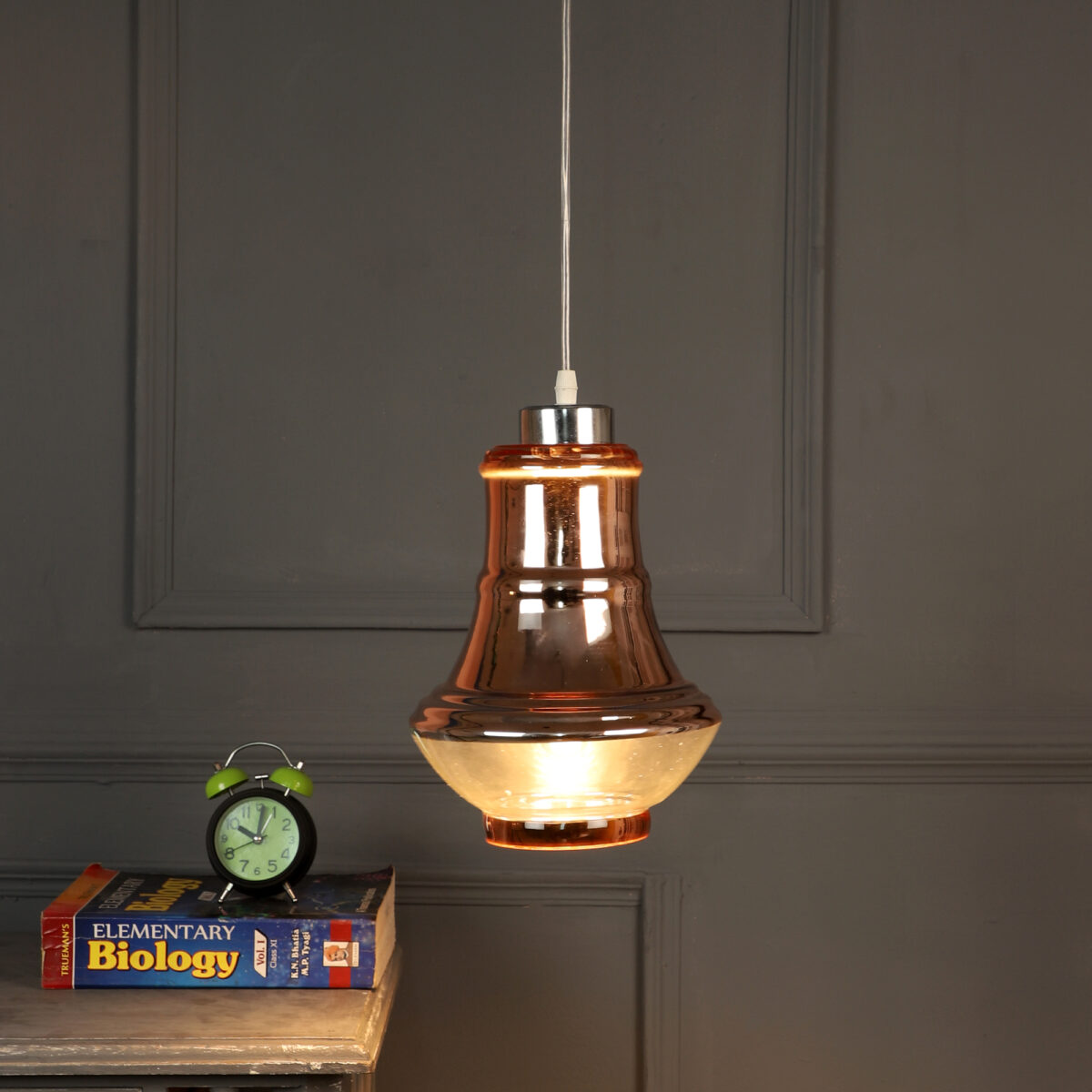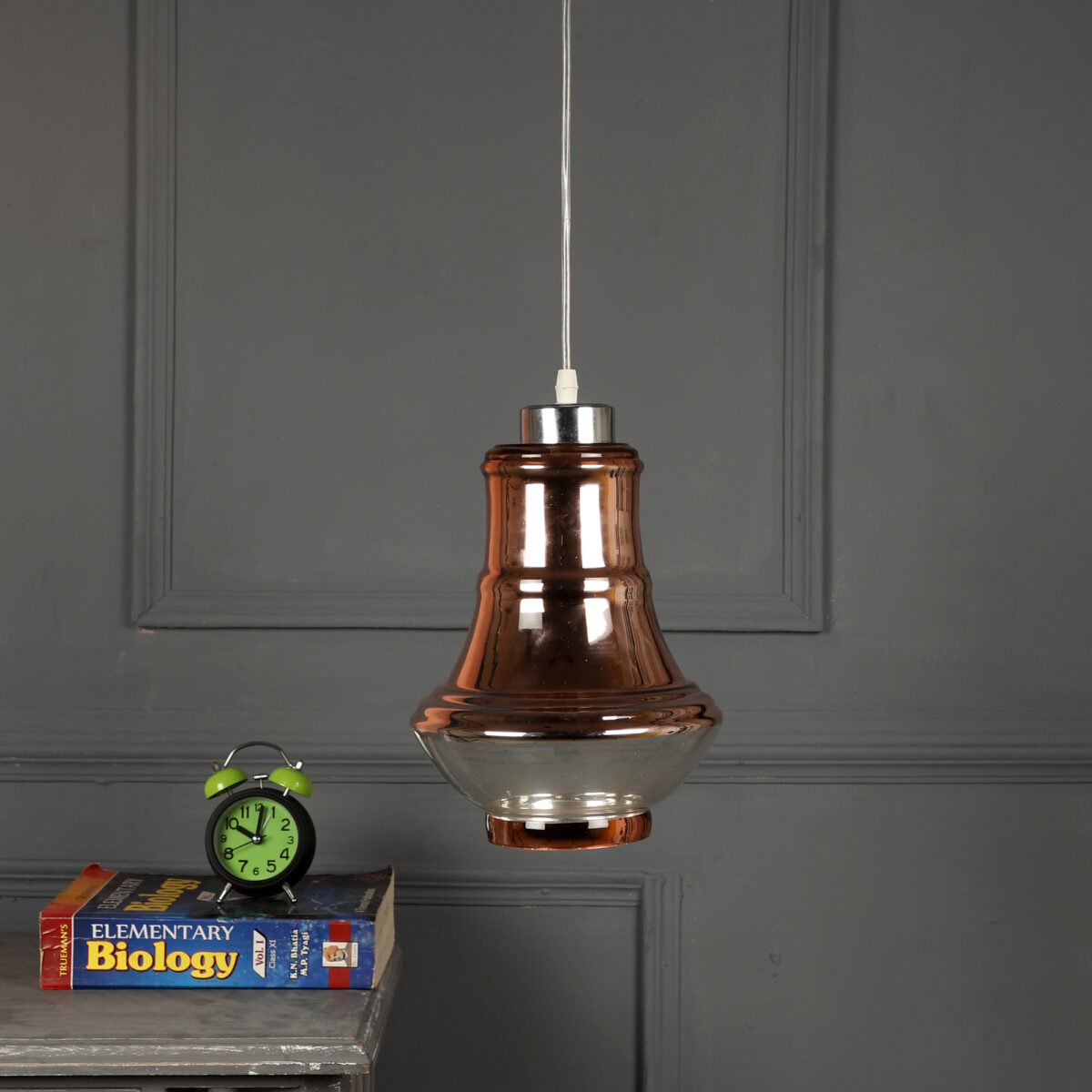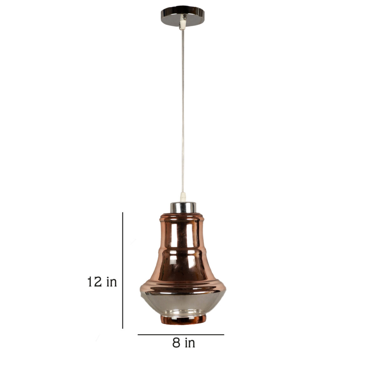 Ultra modern, premium, mild steel silver (chrome – copper) finish, single hanging light. The suspension can be adjusted at time of installation to the desired height. It is maintenance free, easy to remove glass and wash them, comes with an E27 holder, only the change of lamp is required, which is available locally everywhere. Application includes both residential and commercial premises wherever it matches with your interiors. Lamp not included.