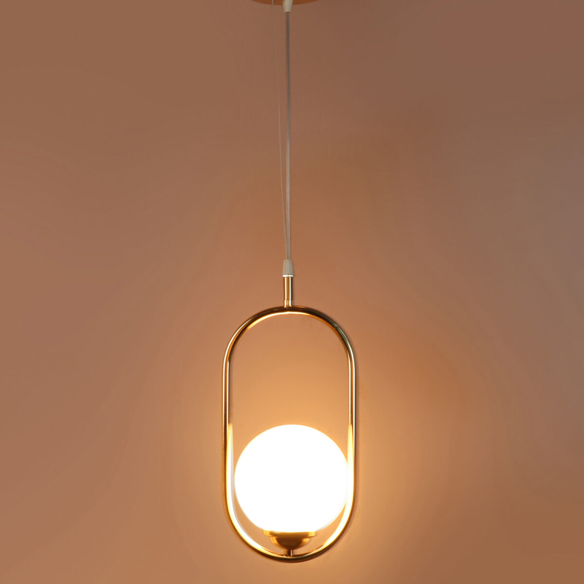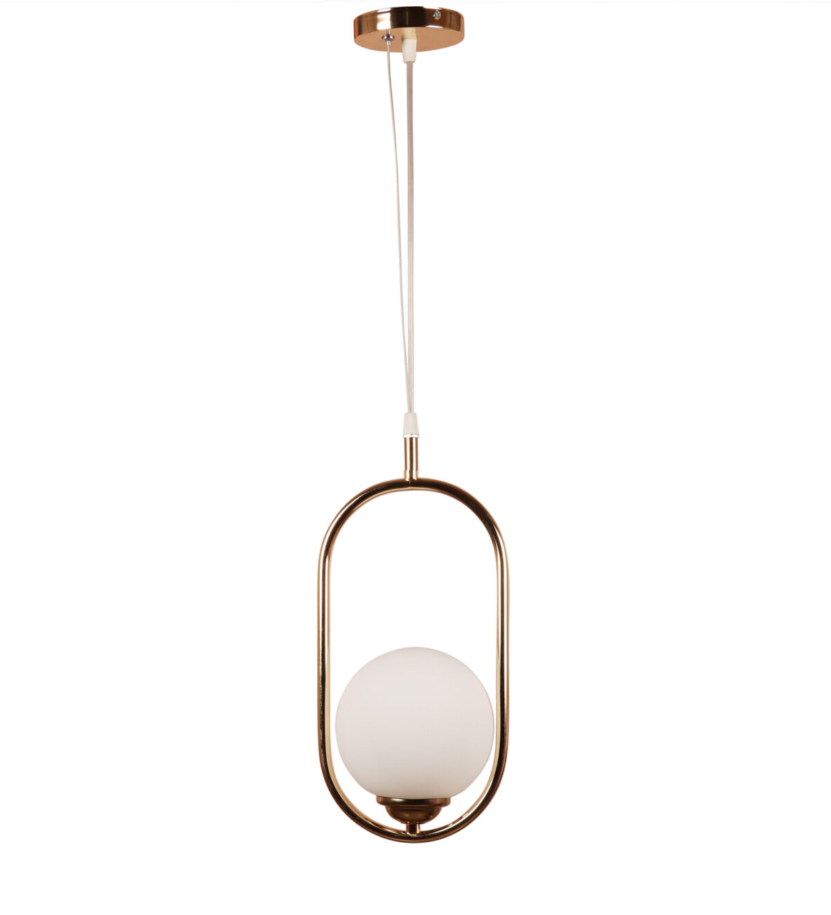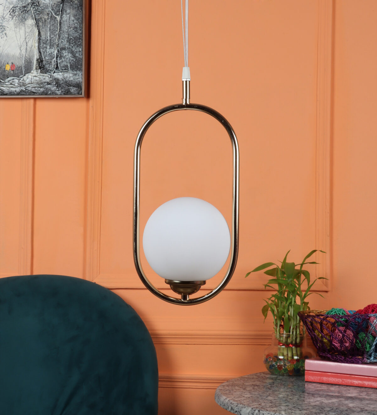 Gold modern, mild steel single hanging light in white doom glass. The suspension can be adjusted at time of installation to the desired height. It is maintenance free, comes with an E27 holder, only the change of lamp is required, which is available locally everywhere. Matching three light hanging code – HL6076-3. Application includes both residential and commercial premises wherever it matches with your interiors. Can be customized as per requirement in case of bulk quantities. LAMP NOT INCLUDED.