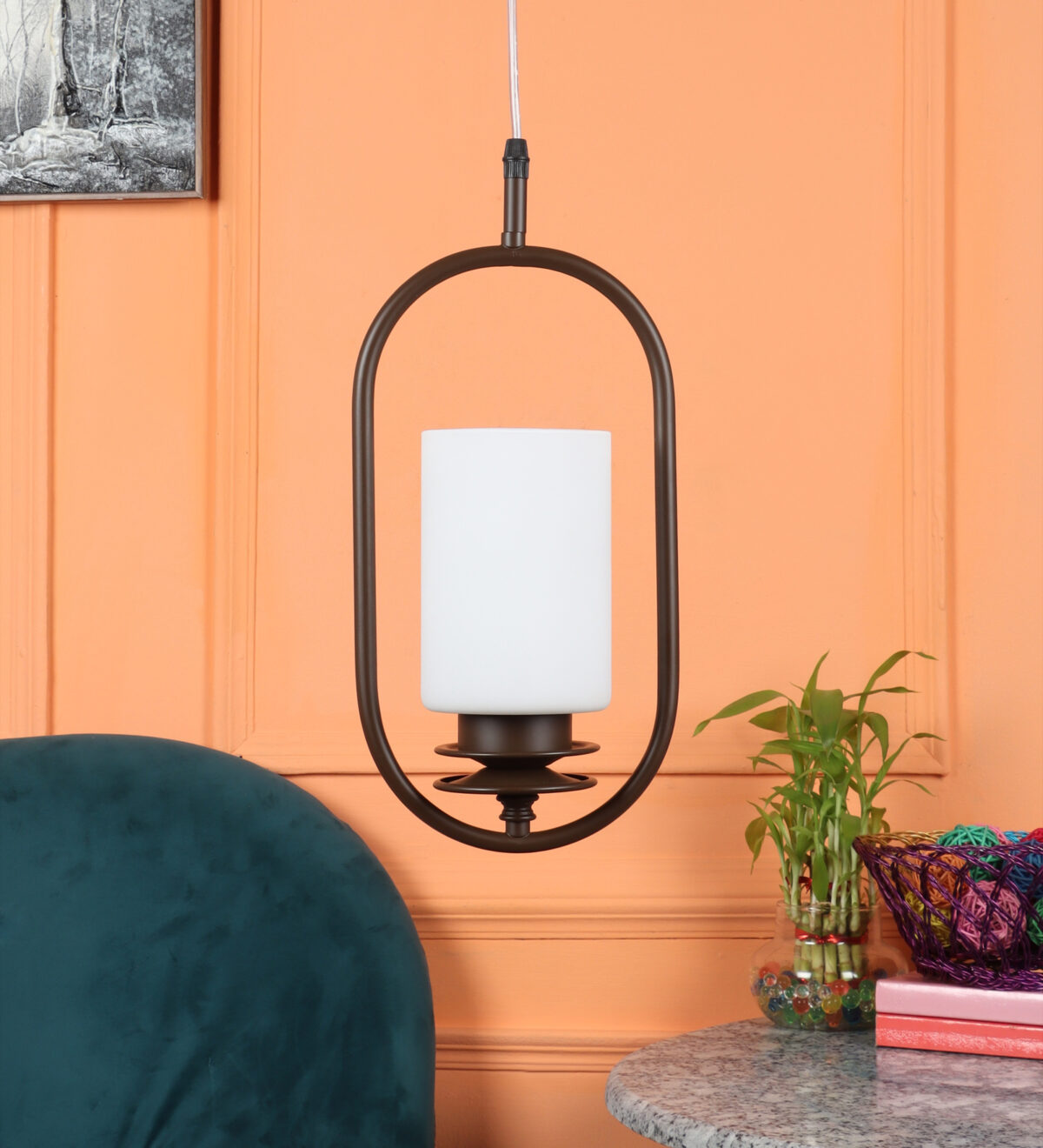 Dark brown (wood) finish, cylinderical white glass single hanging light, made of mild steel and glass. The suspension can be adjusted at time of installation to the desired height. It is maintenance free, easy to remove glass and wash it, comes with an E27 holder, only the change of lamp is required, which is available locally everywhere. Application includes both residential and commercial premises wherever it matches with your interiors. Other variants with different glass are HL6078, HL6080. Can be customized as per requirement in case of bulk quantities. LAMP NOT INCLUDED.