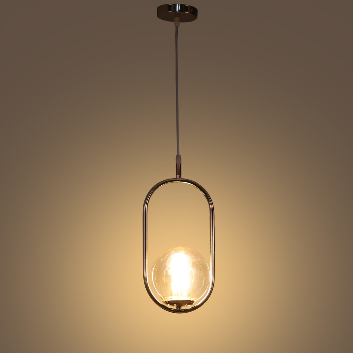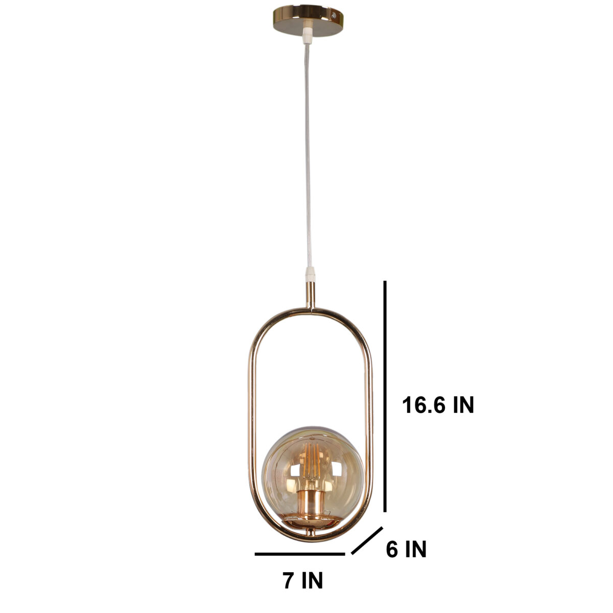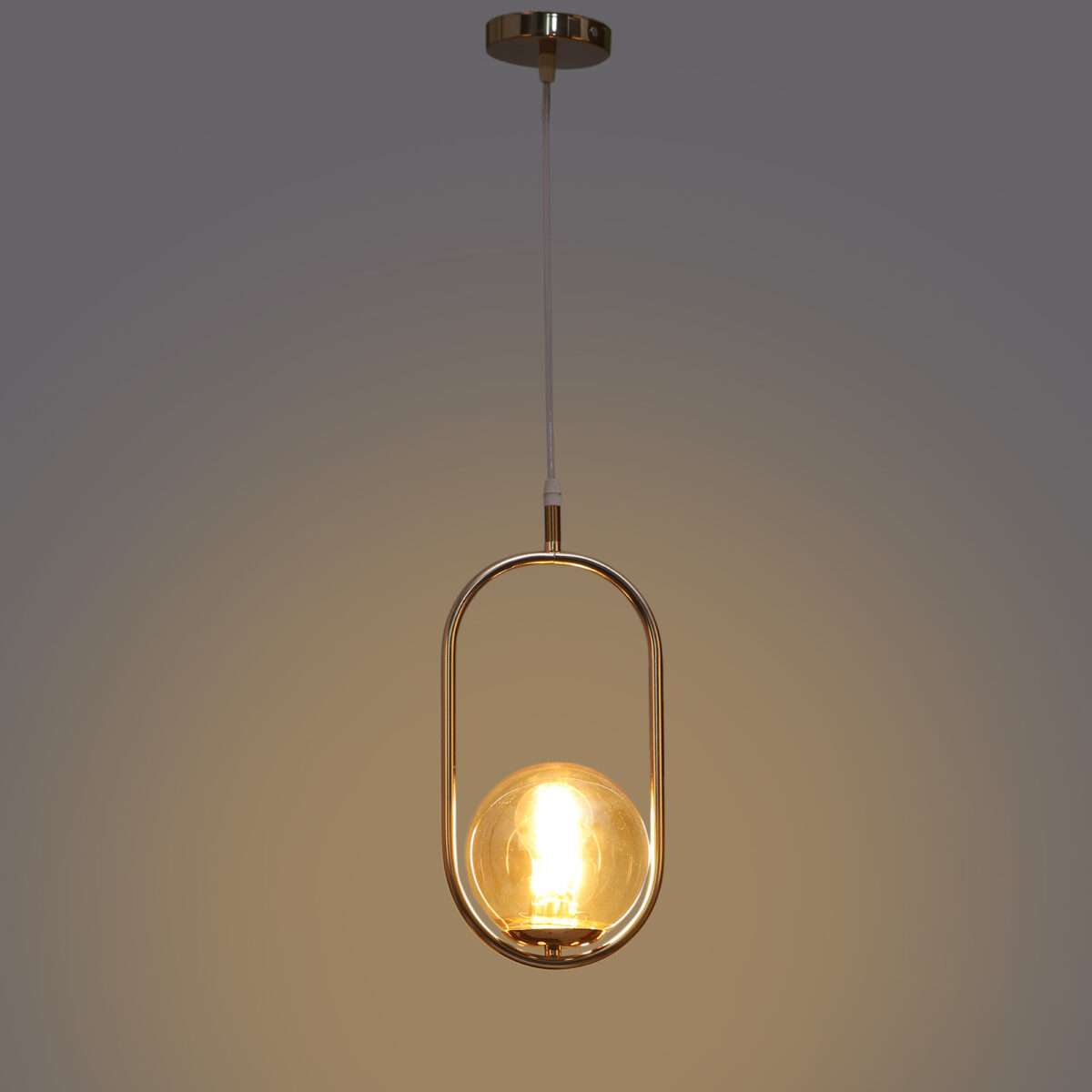 Gold modern, mild steel single hanging light in champaign coloured doom glass. The suspension can be adjusted at time of installation to the desired height. It is maintenance free, comes with an E27 holder, only the change of lamp is required, which is available locally everywhere. Can be customized as per requirement. LAMP NOT INCLUDED.