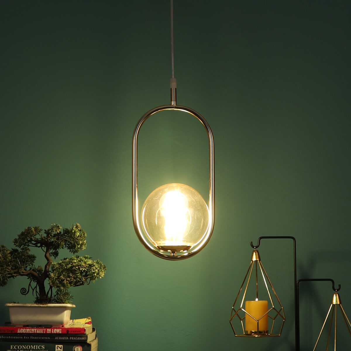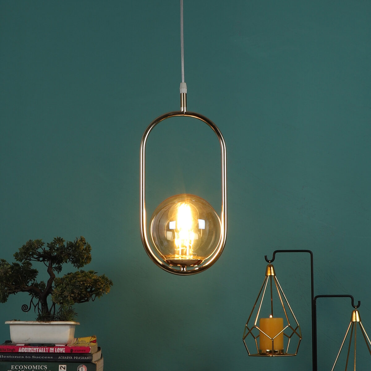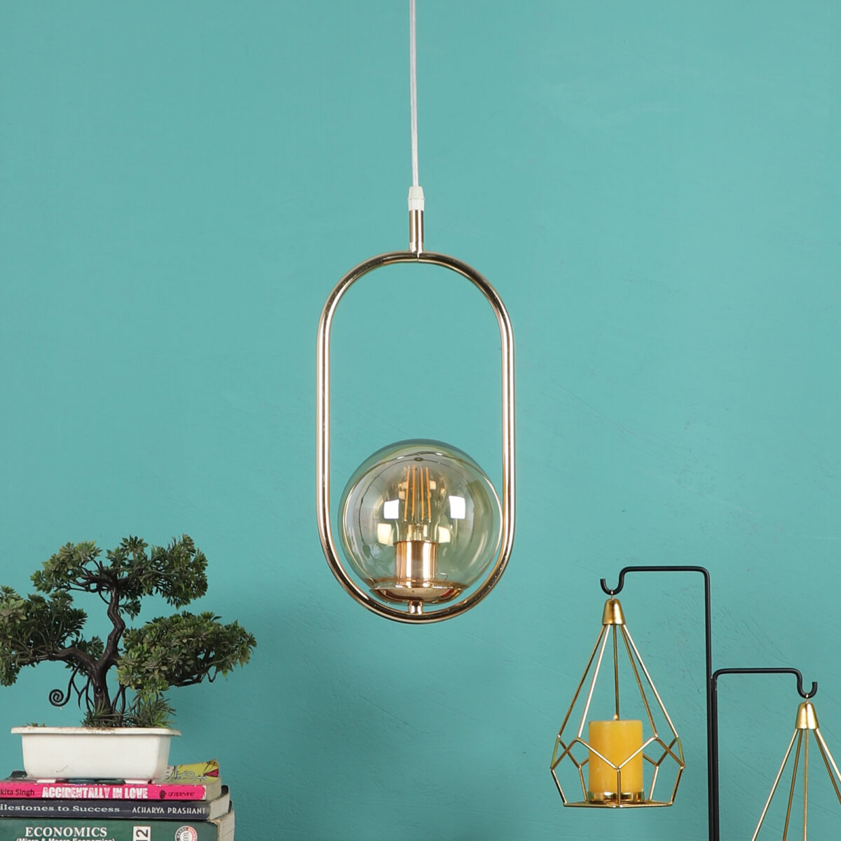 Gold modern, mild steel single hanging light in champaign coloured doom glass. The suspension can be adjusted at time of installation to the desired height. It is maintenance free, comes with an E27 holder, only the change of lamp is required, which is available locally everywhere. Can be customized as per requirement. LAMP NOT INCLUDED.