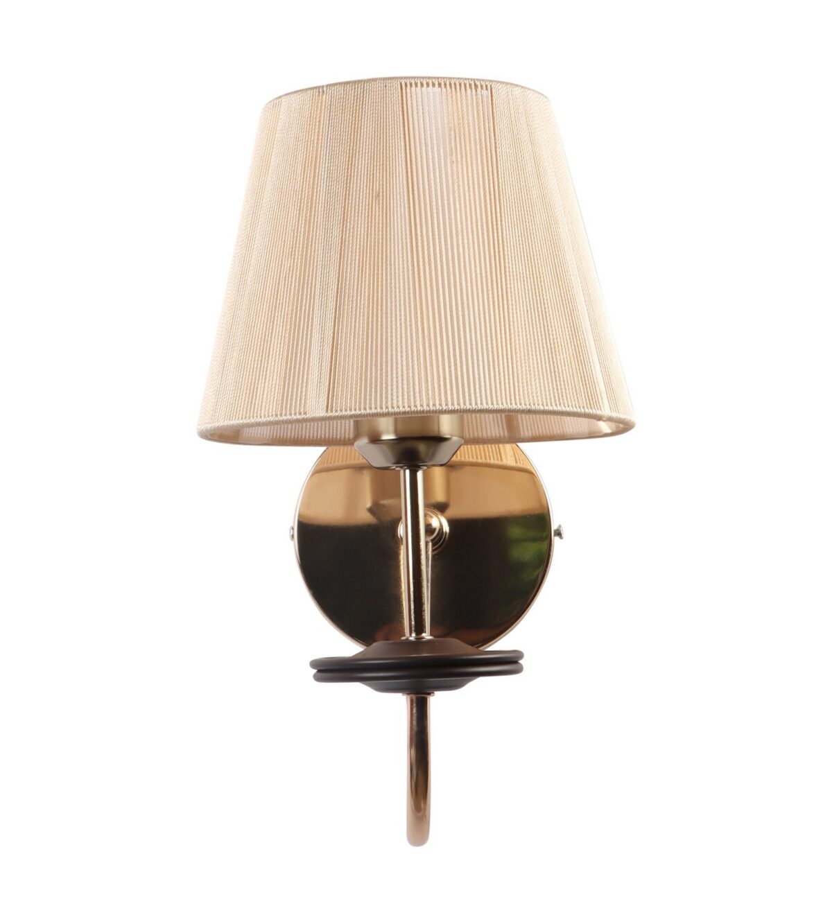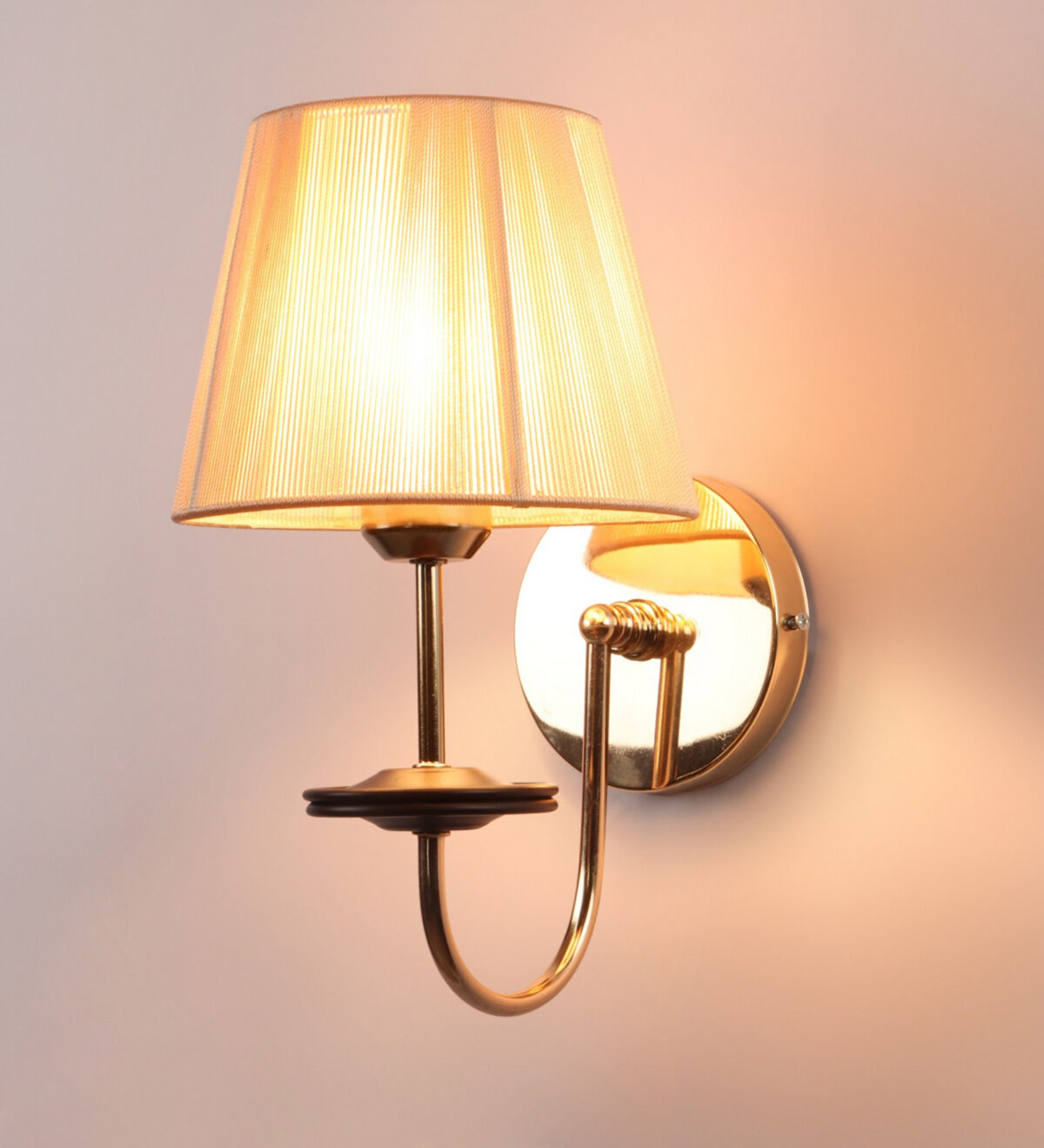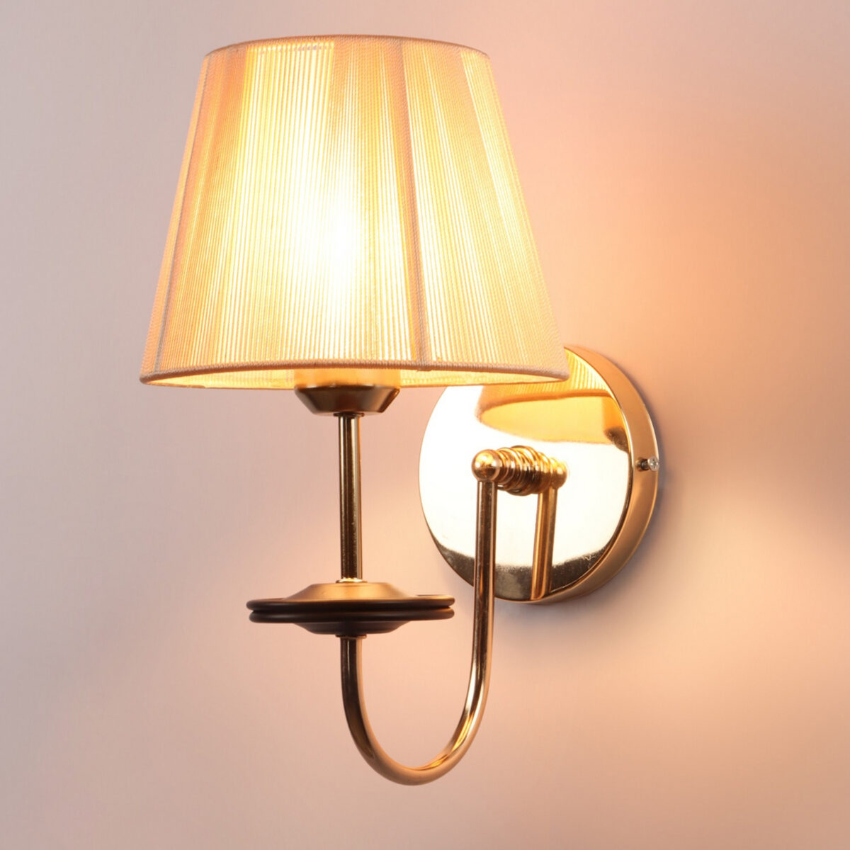Gold finish modern single wall light with taper off white fabric shade. It is maintenance free, comes with an E27 holder, only the change of lamp is required, which is available locally everywhere. Application includes both residential and commercial premises wherever it matches with your interiors. It is ideal for installing on both sides of the bed at a low height. Ideal for hotel or guest rooms.Matching double wall light code – WL2720. LAMP NOT INCLUDED.