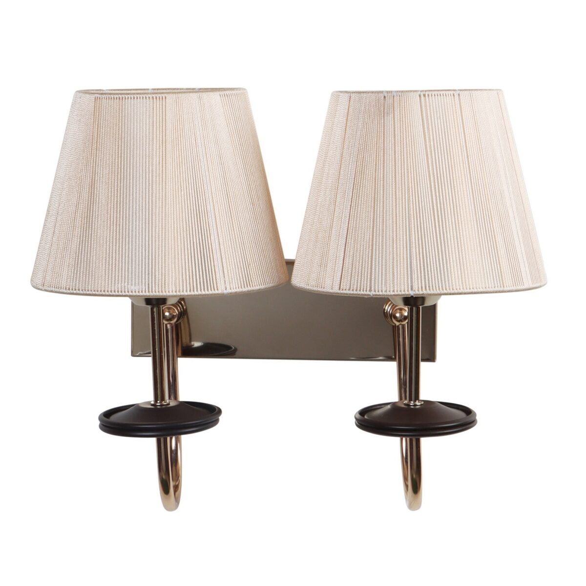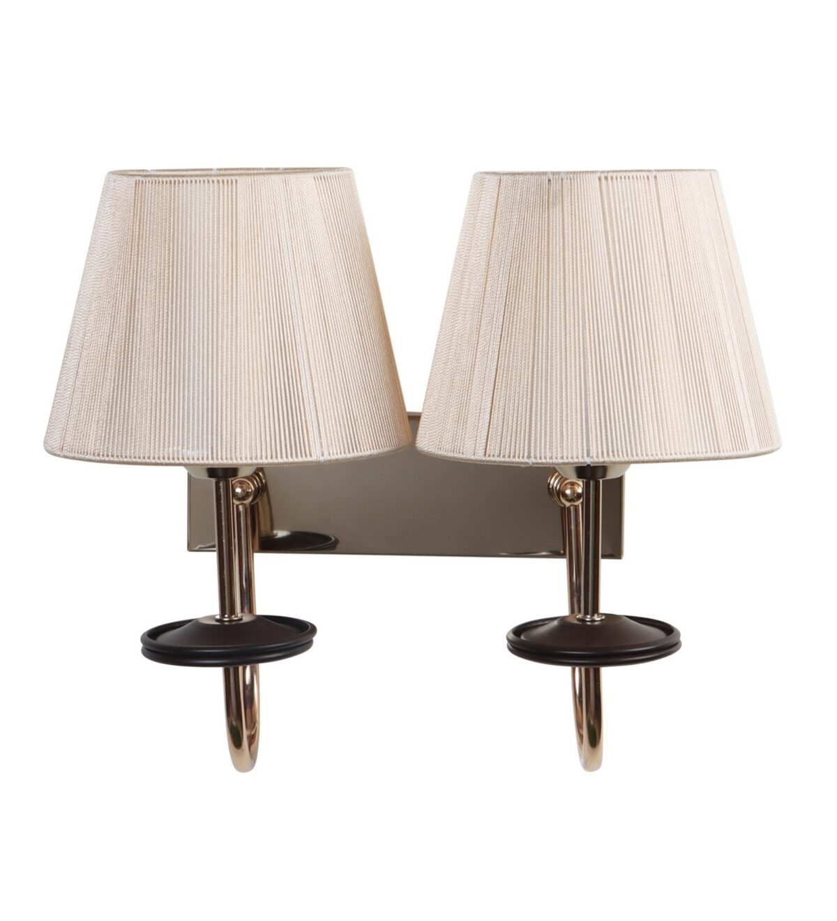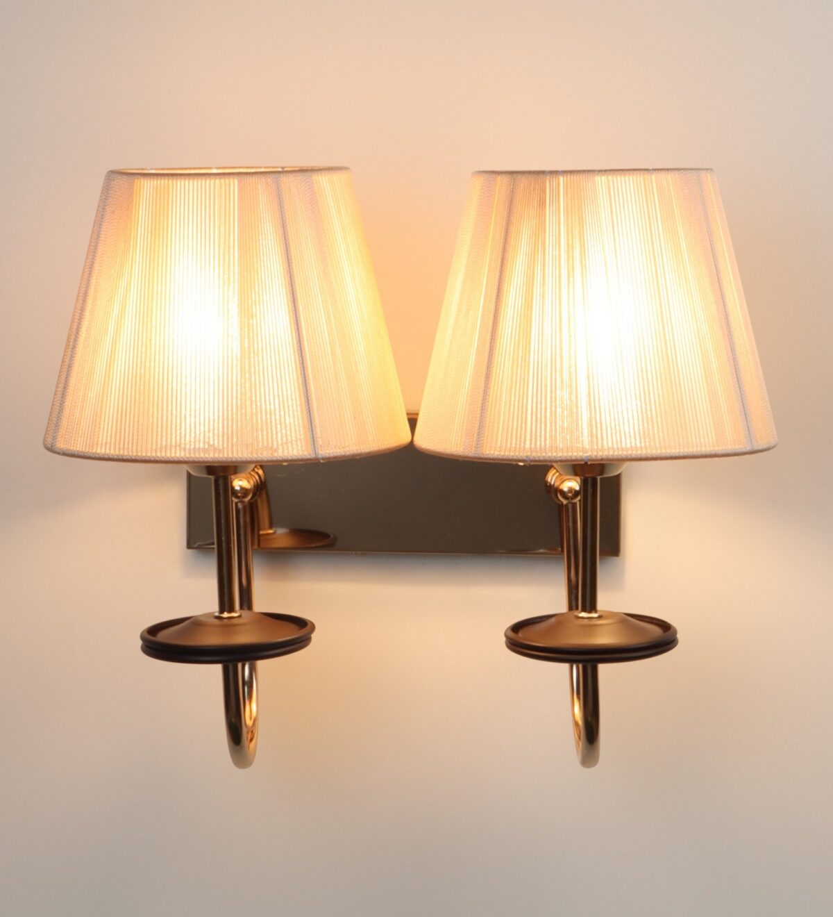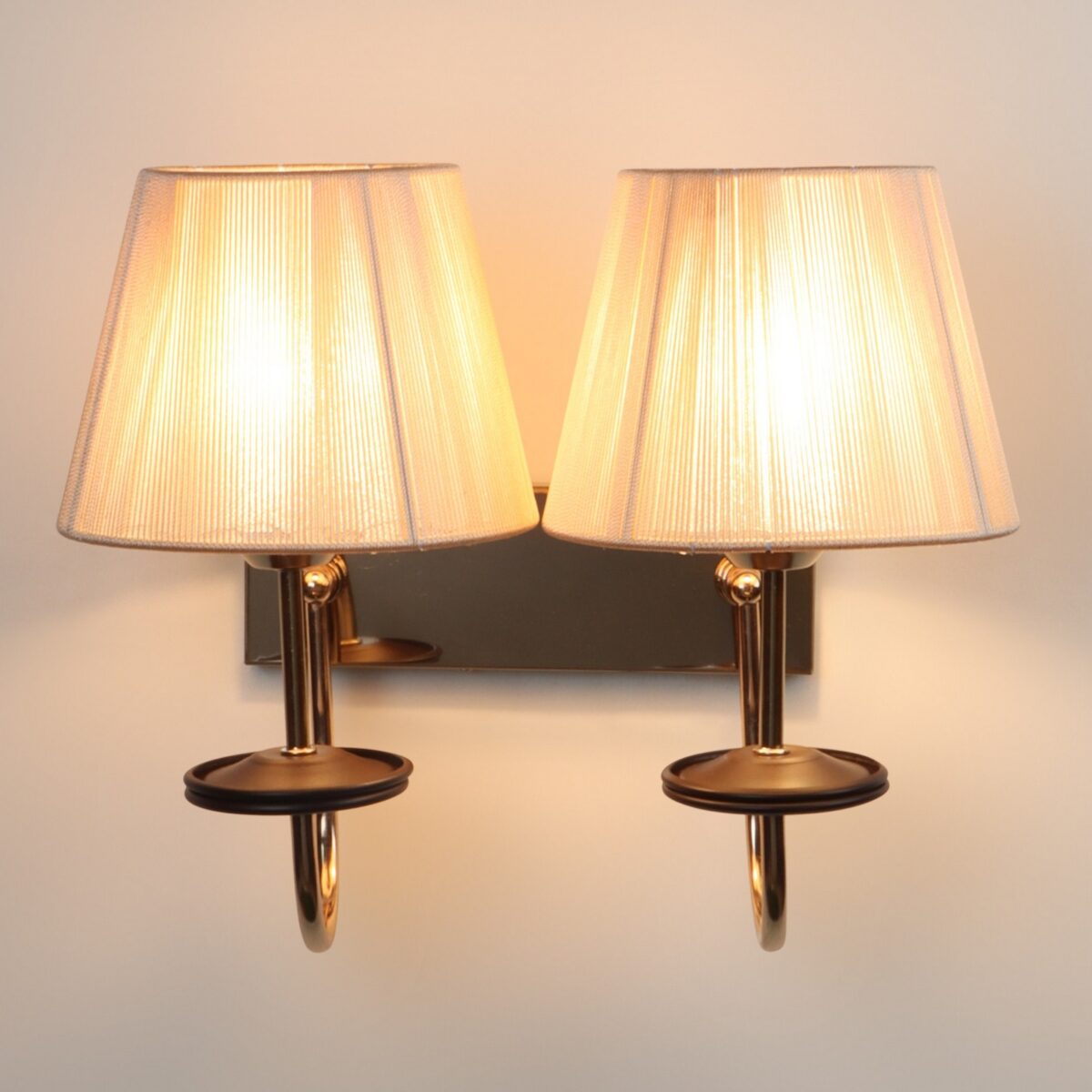 Gold finish double wall light with taper off white fabric shade. It is maintenance free, comes with an E27 holder, only the change of lamp is required, which is available locally everywhere. Application includes both residential and commercial premises wherever it matches with your interiors. Matching single wall light code – WL2719. LAMP NOT INCLUDED.